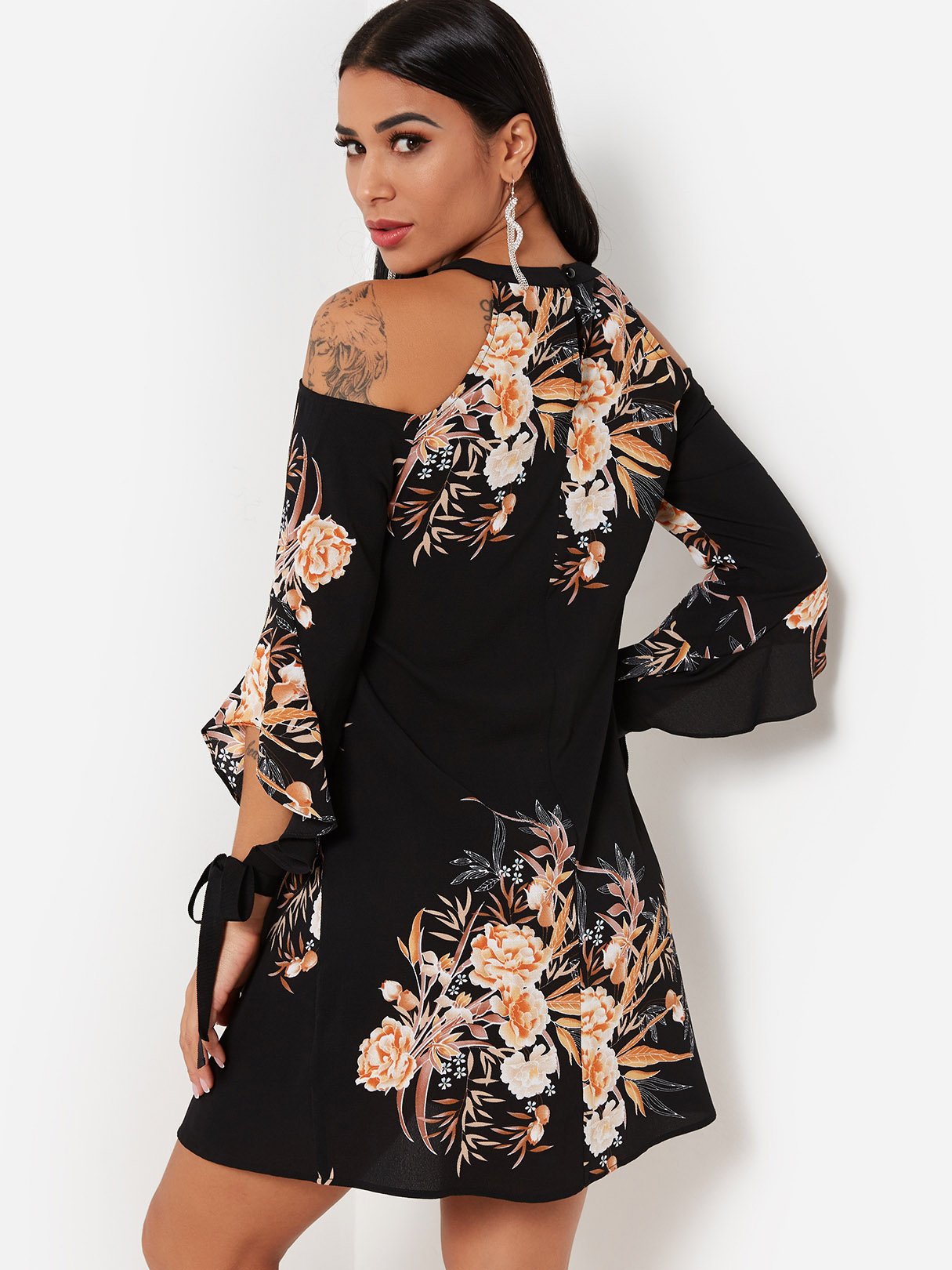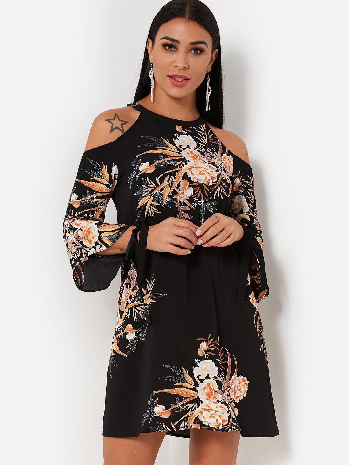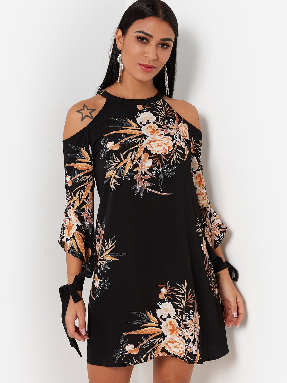 Black Round Neck Cold Shoulder 3/4 Length Sleeve Floral Print Dresses