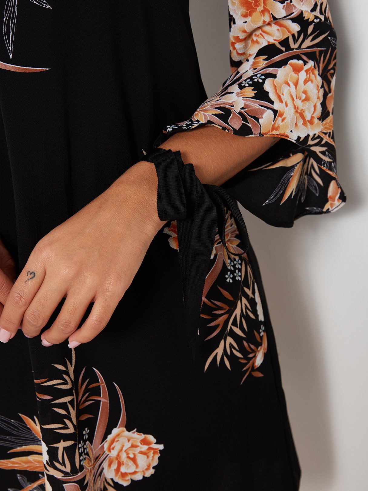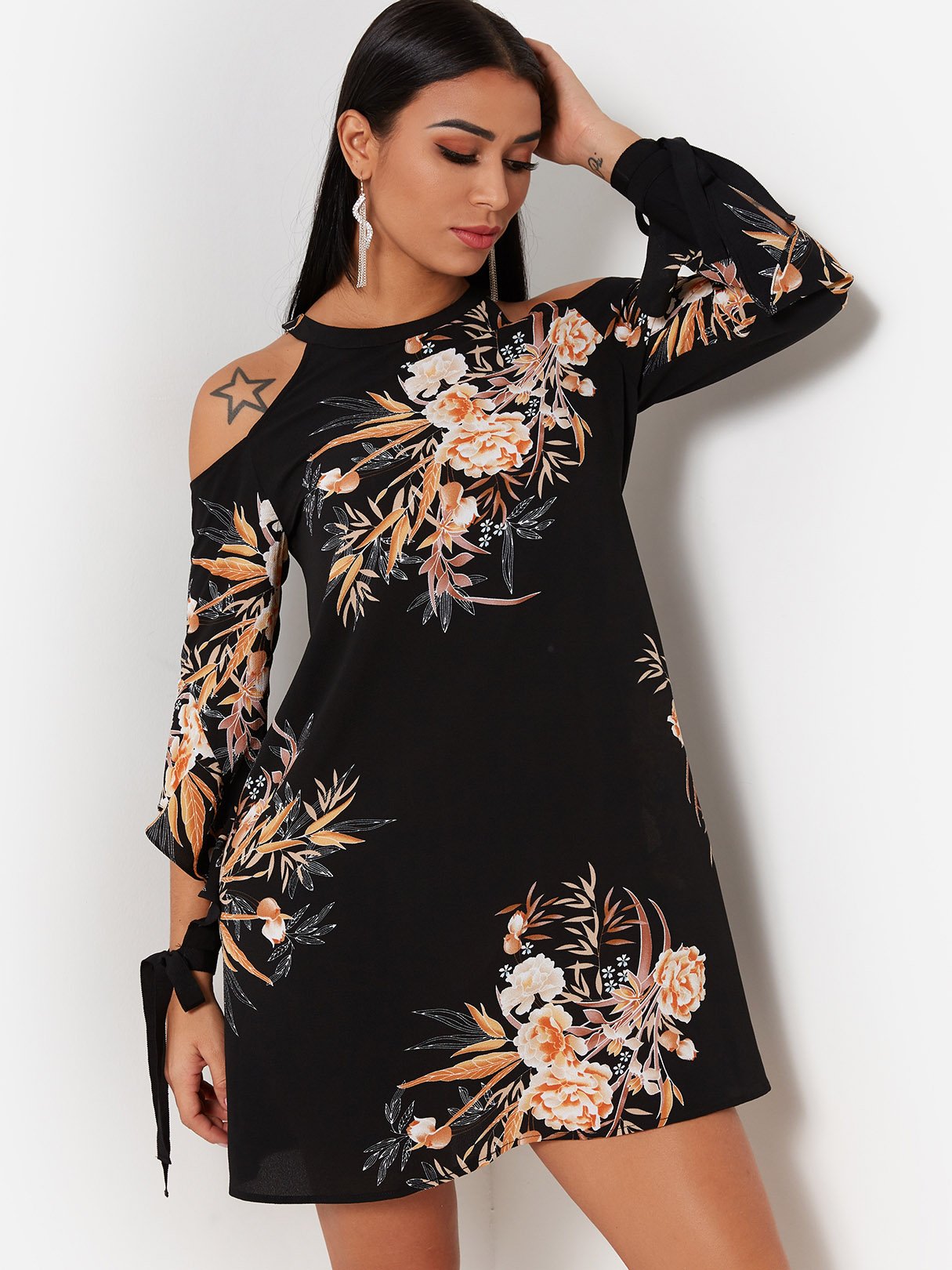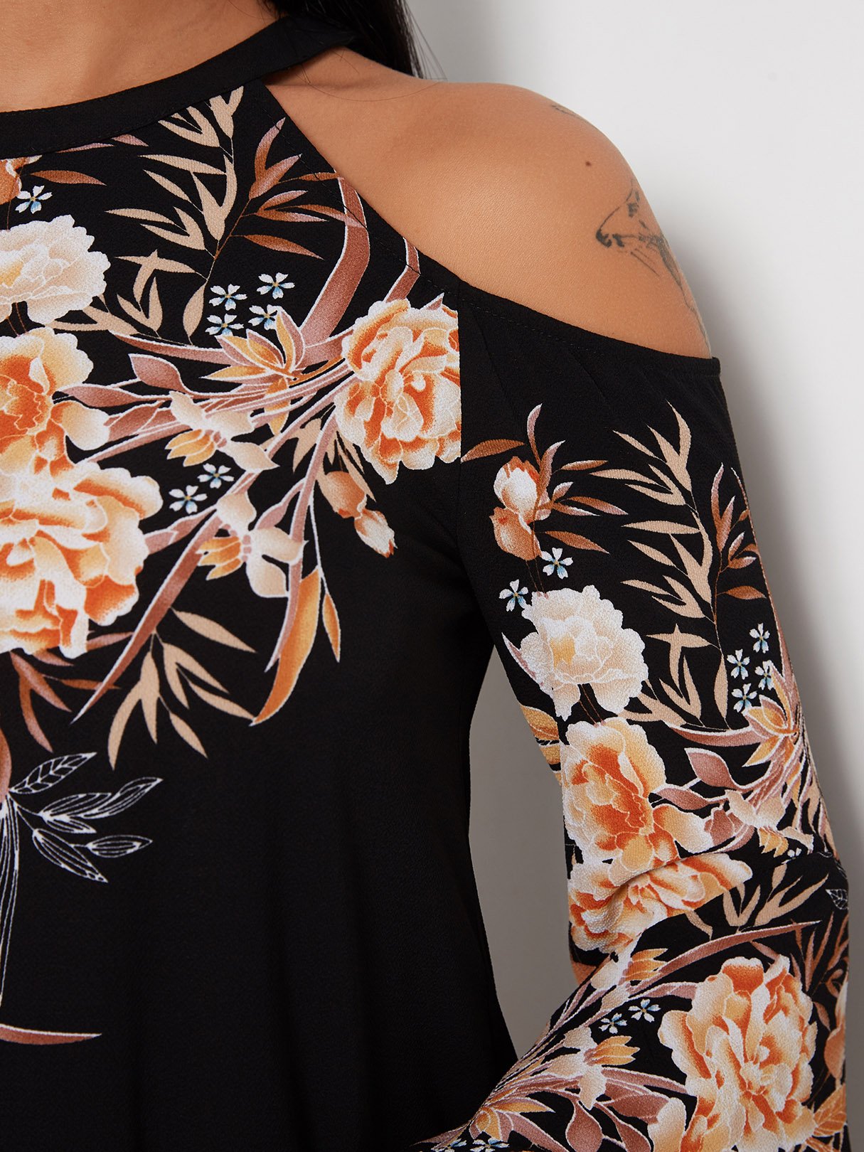 Black Round Neck Cold Shoulder 3/4 Length Sleeve Floral Print Dresses