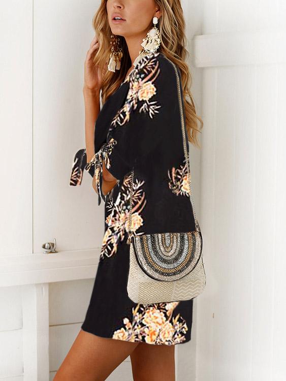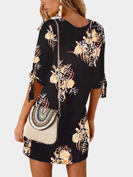 Black Round Neck Half Sleeve Floral Print Self-Tie Mini Dress