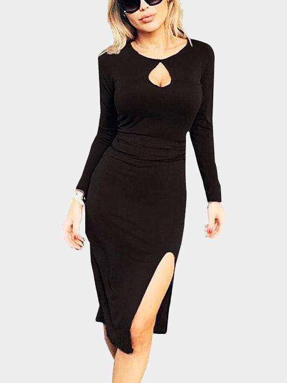 Black Round Neck Long Sleeve Cut Out Slit Hem Dresses