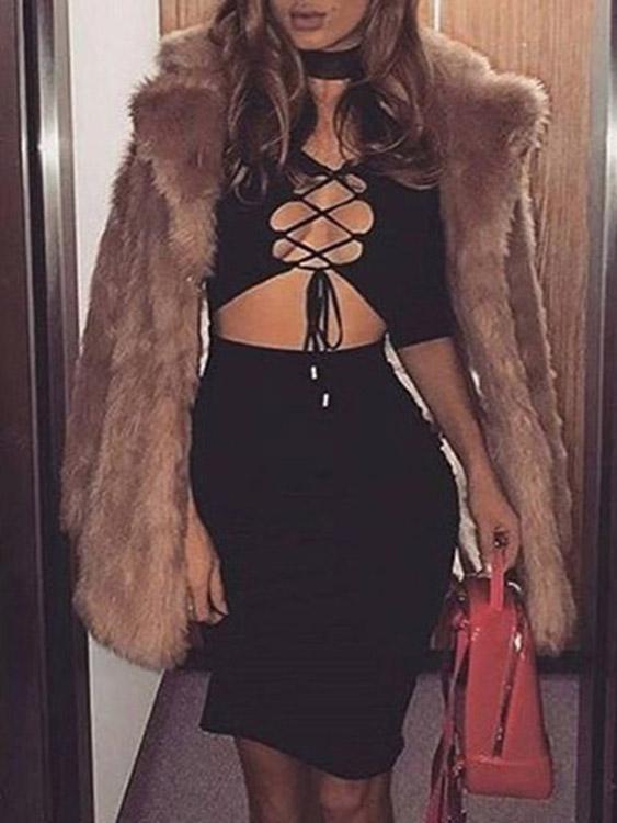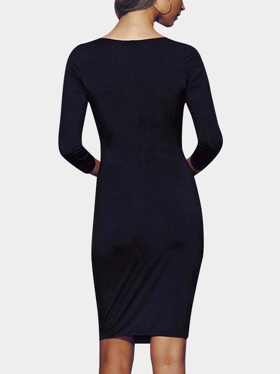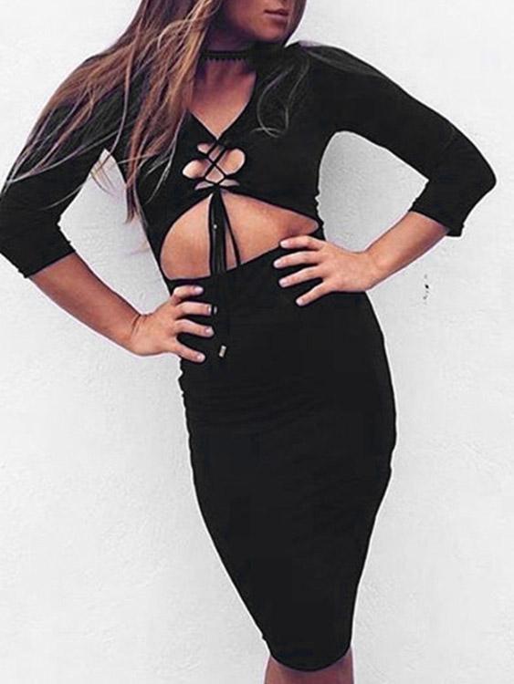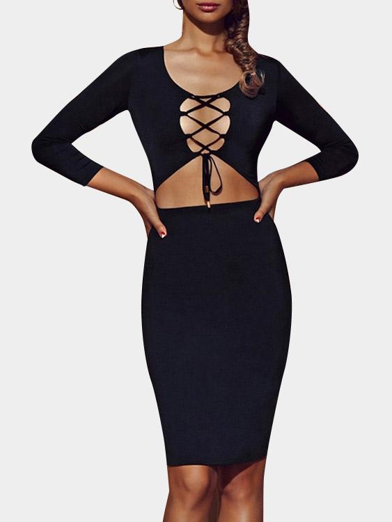 Black Round Neck Long Sleeve Plain Lace-Up Cut Out Dresses