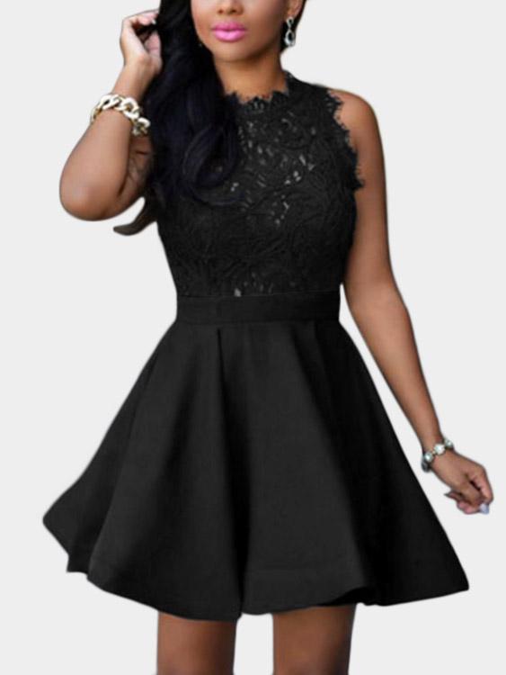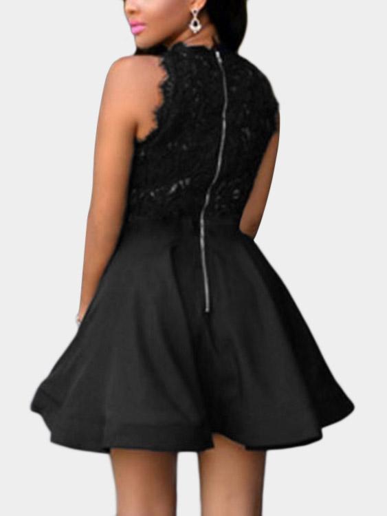 Black Round Neck Sleeveless Embroidered Lace Zip Back Flounced Hem Mini Dresses
