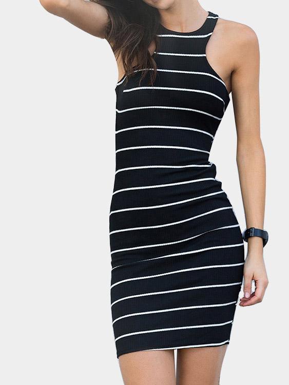 Black Round Neck Sleeveless Stripe Zip Back Midi Dress