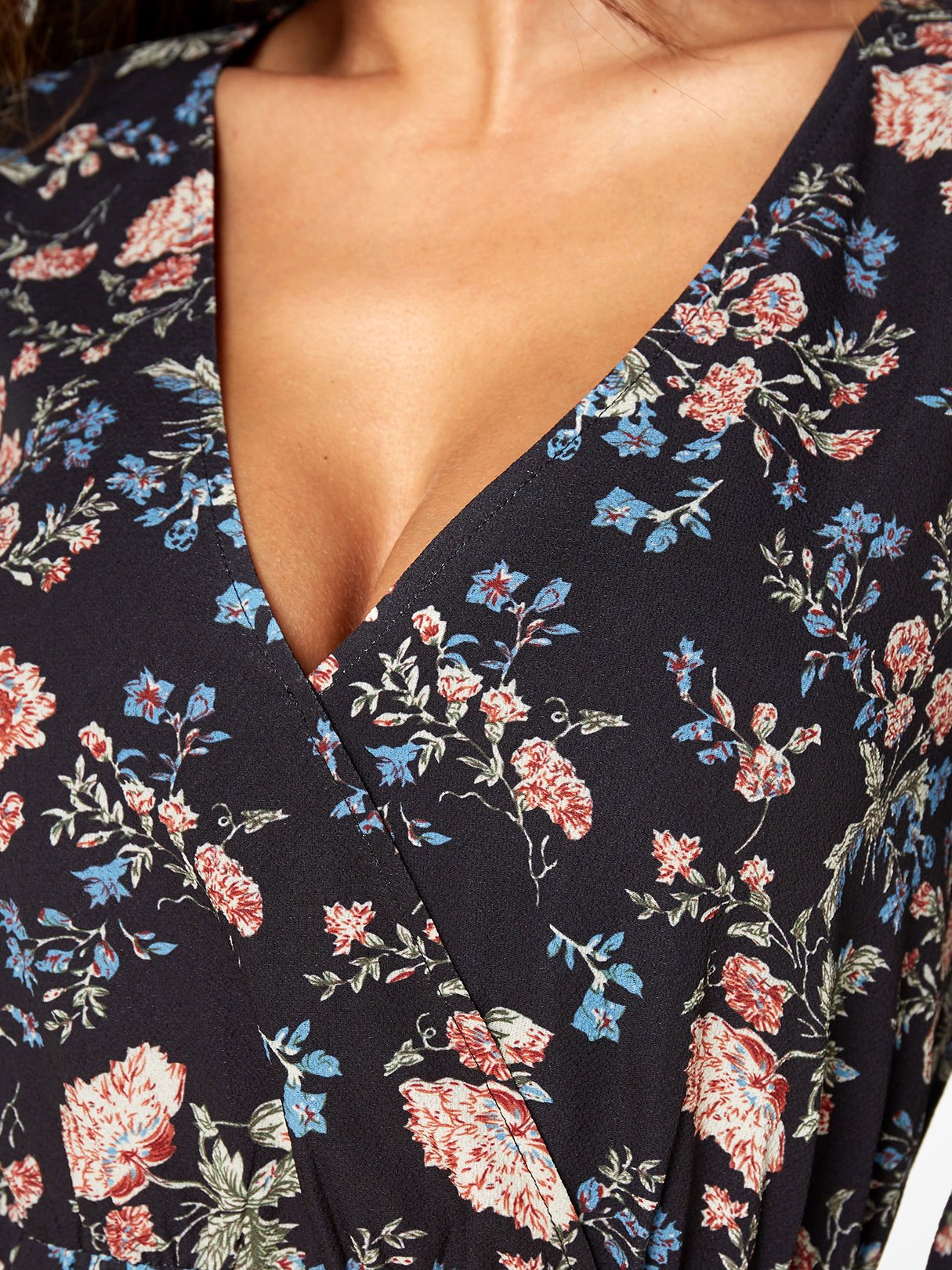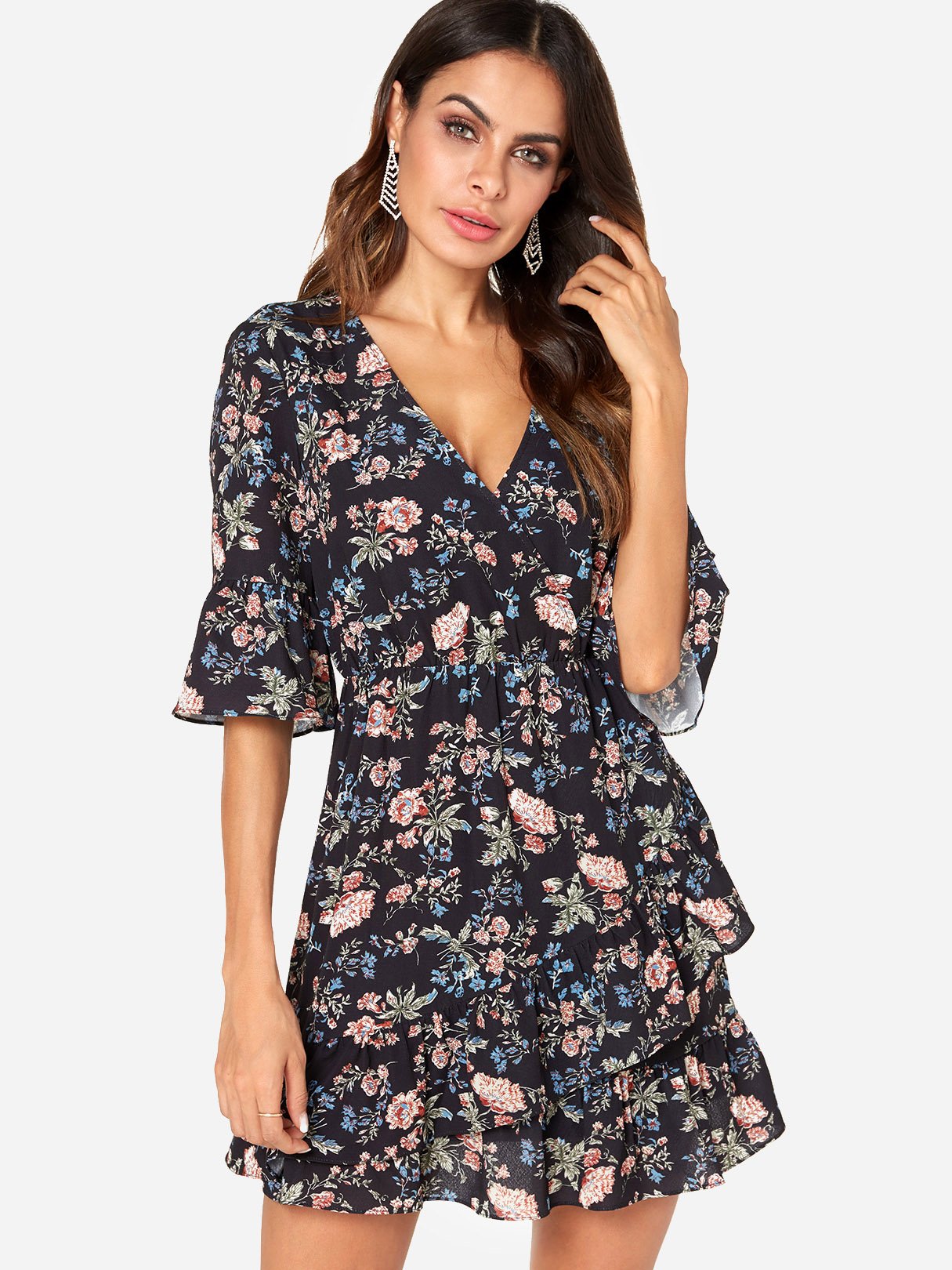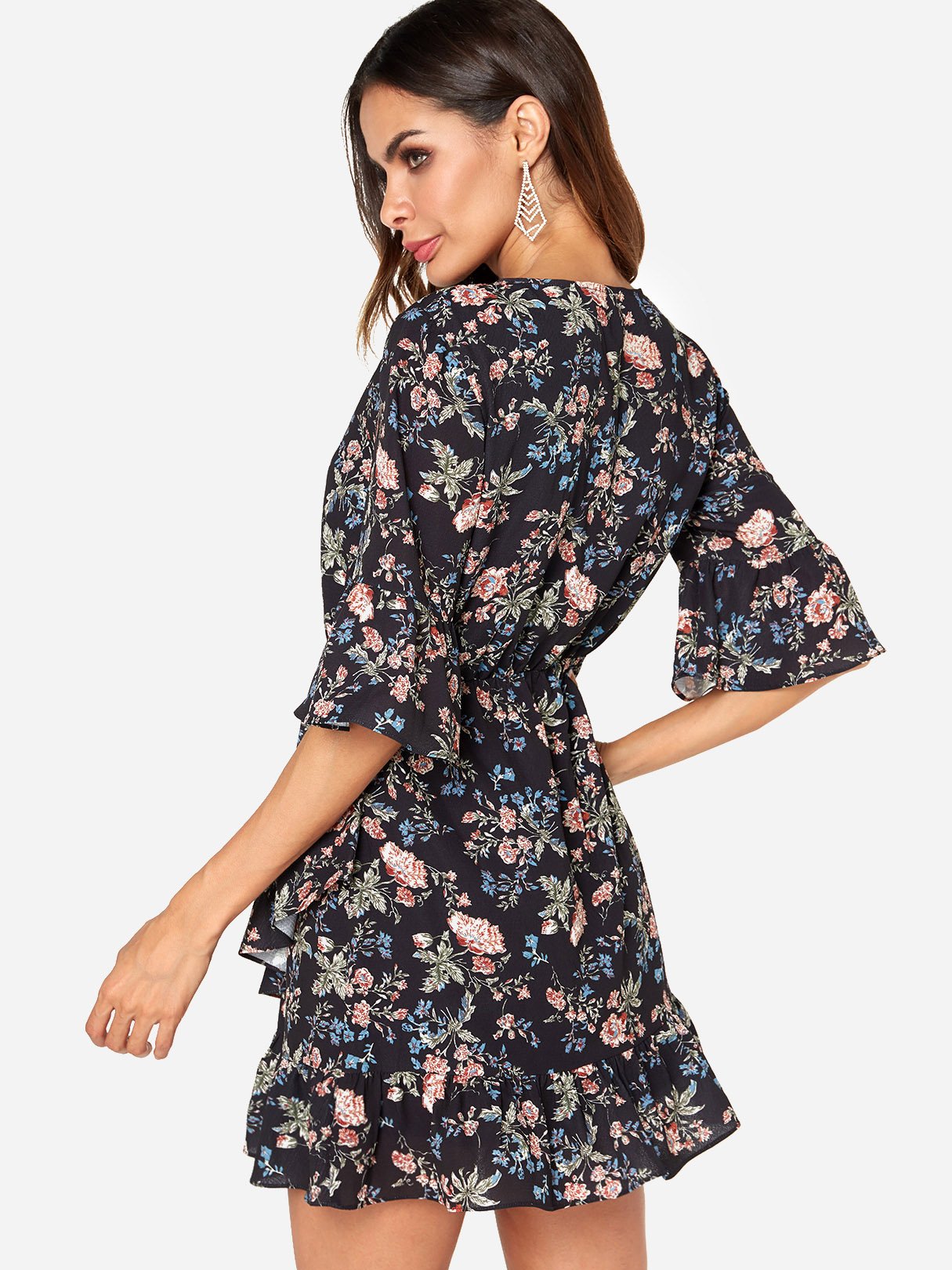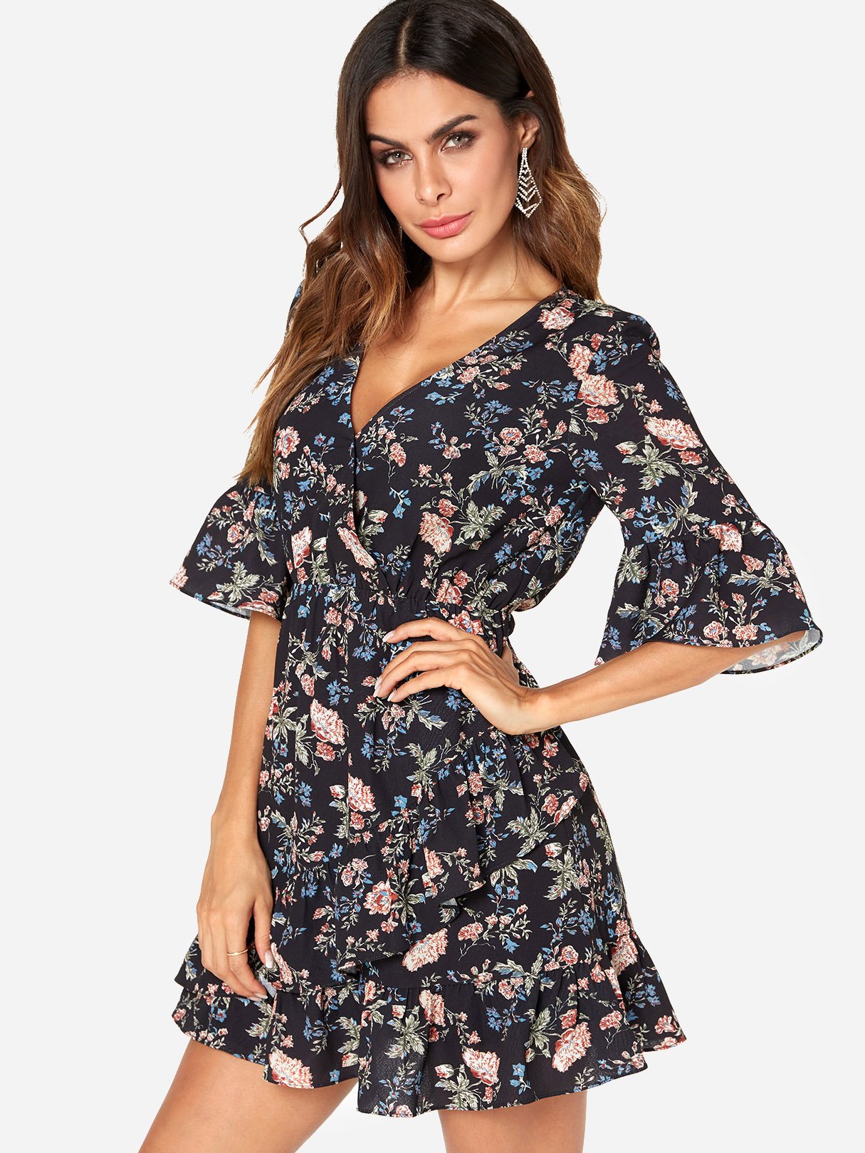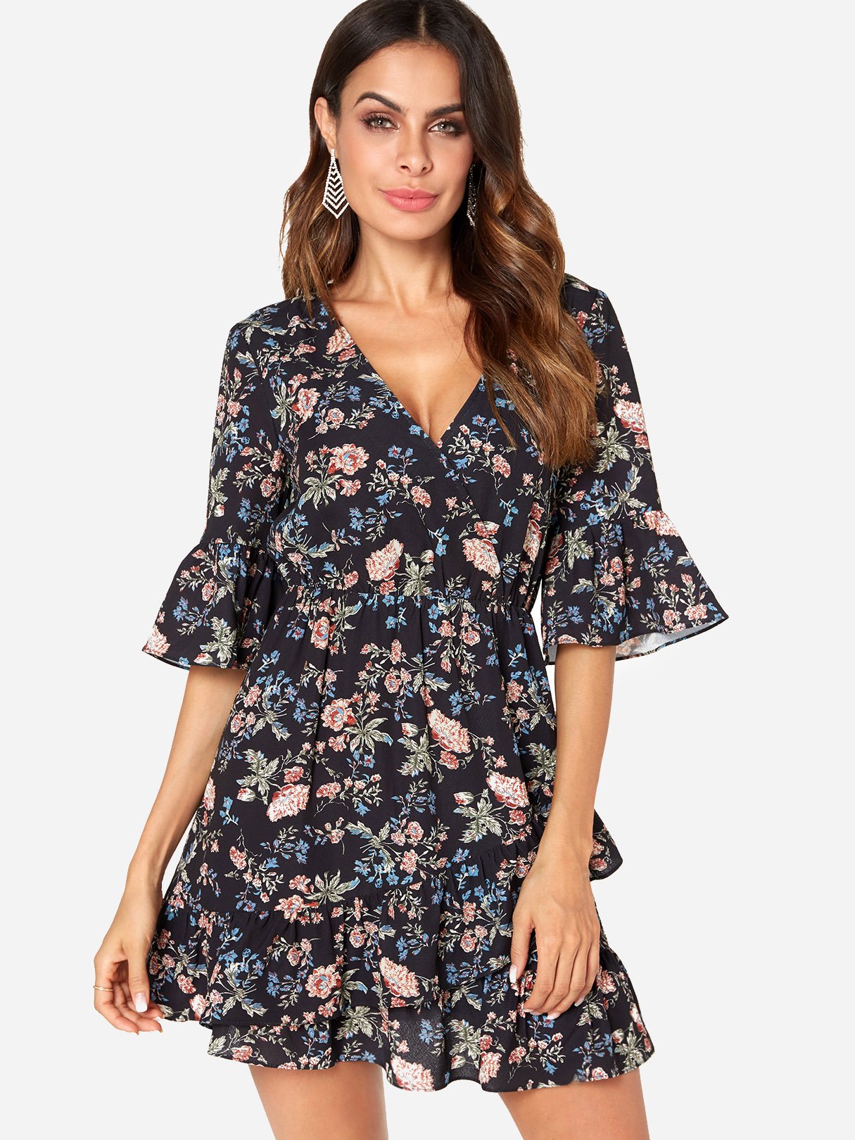 Black V-Neck Crossed Collar Half Sleeve Floral Print Crossed Front Flounced Hem Dresses - Black / S is backordered and will ship as soon as it is back in stock.