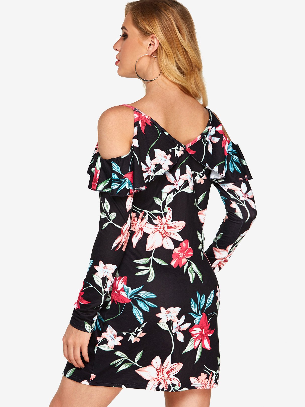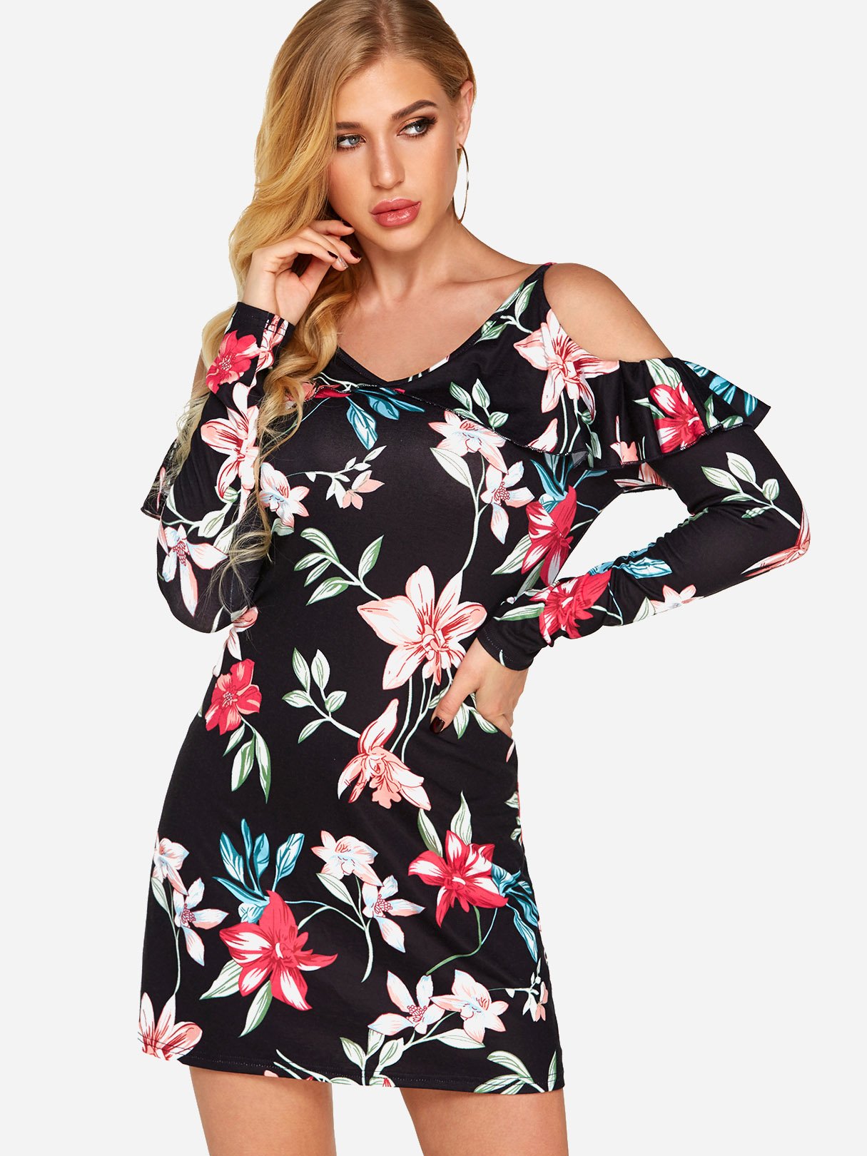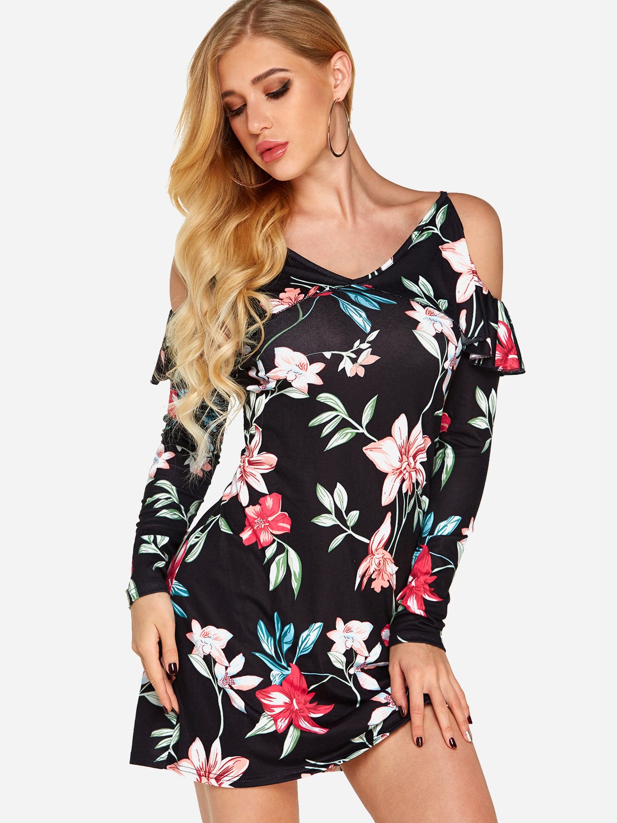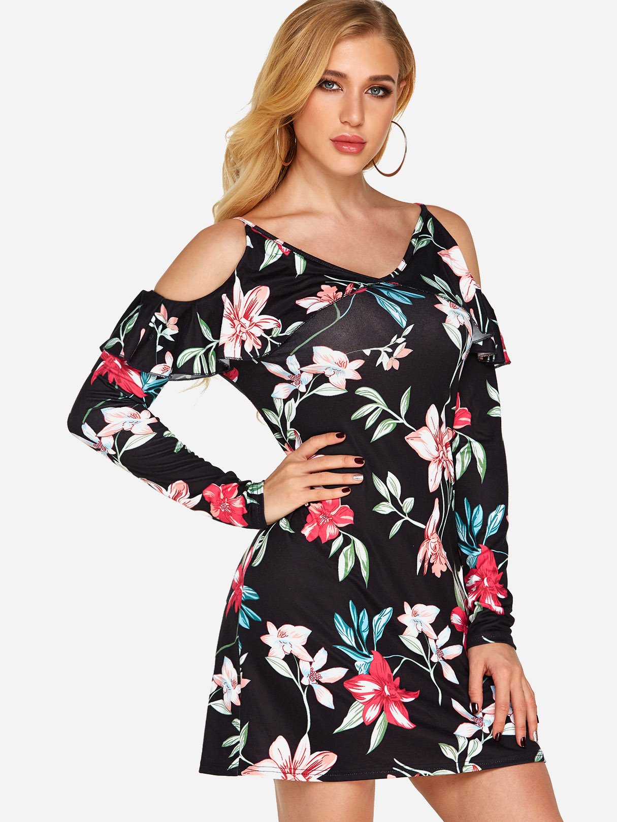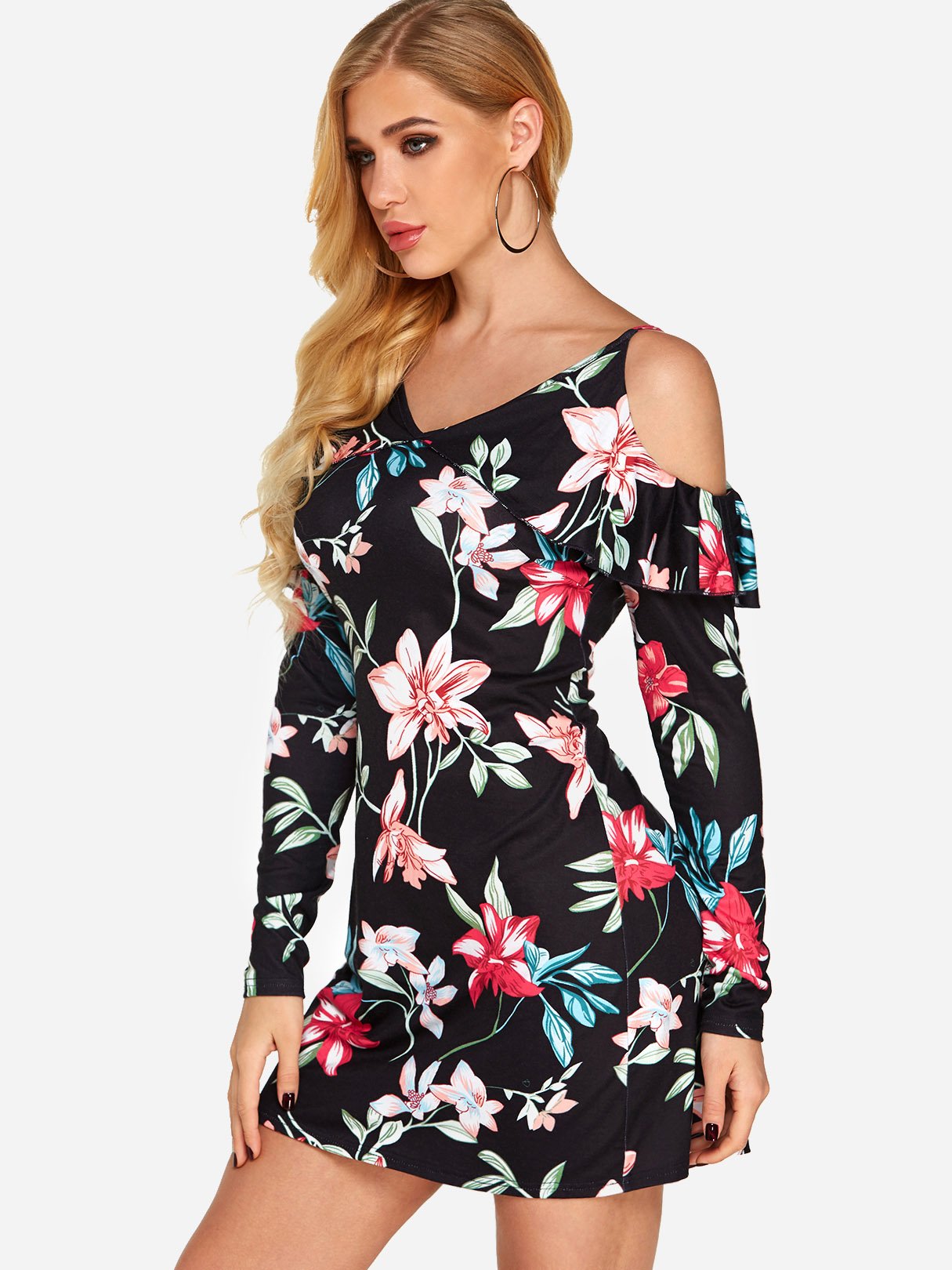Material:Polyester,SpandexNeckline:V-NeckSeason:Spring,Autumn,WinterSleeves:Long SleevesPattern:Floral PrintDetail:Backless DesignWaist Design:High-WaistedLength:MiniFit:Regular Fit