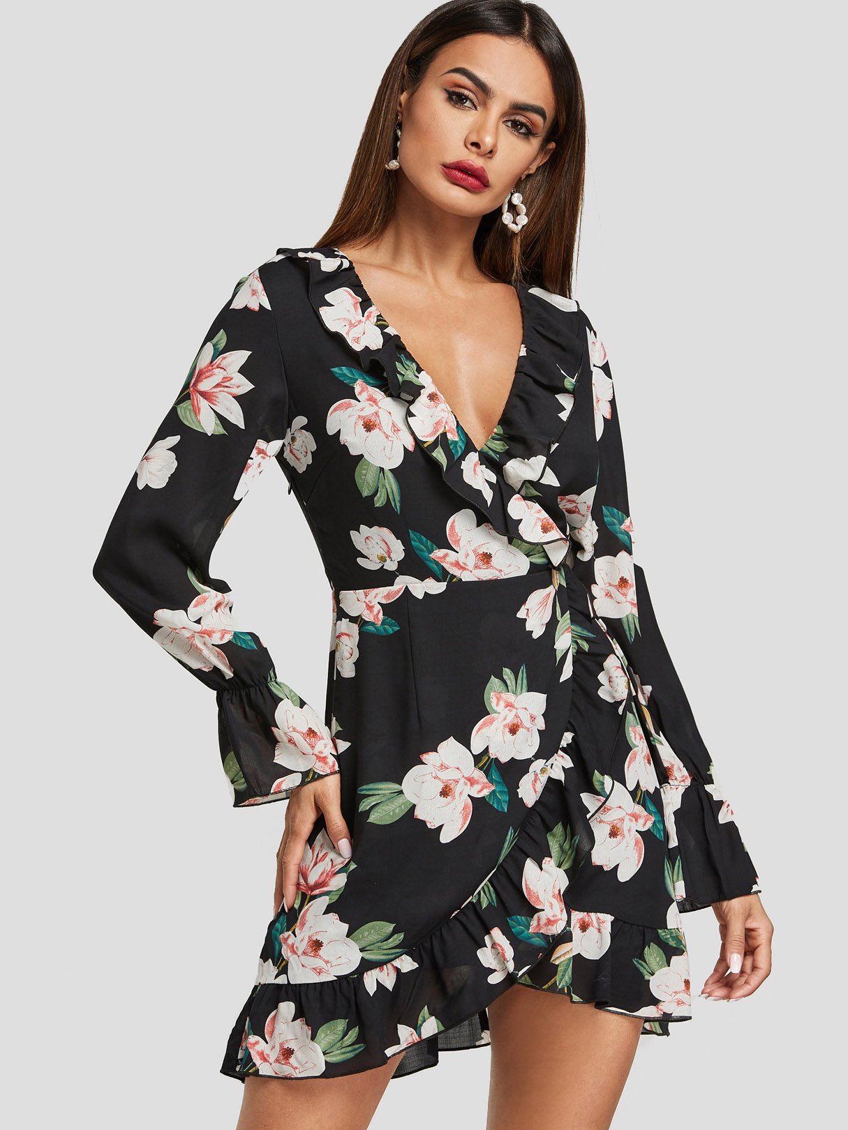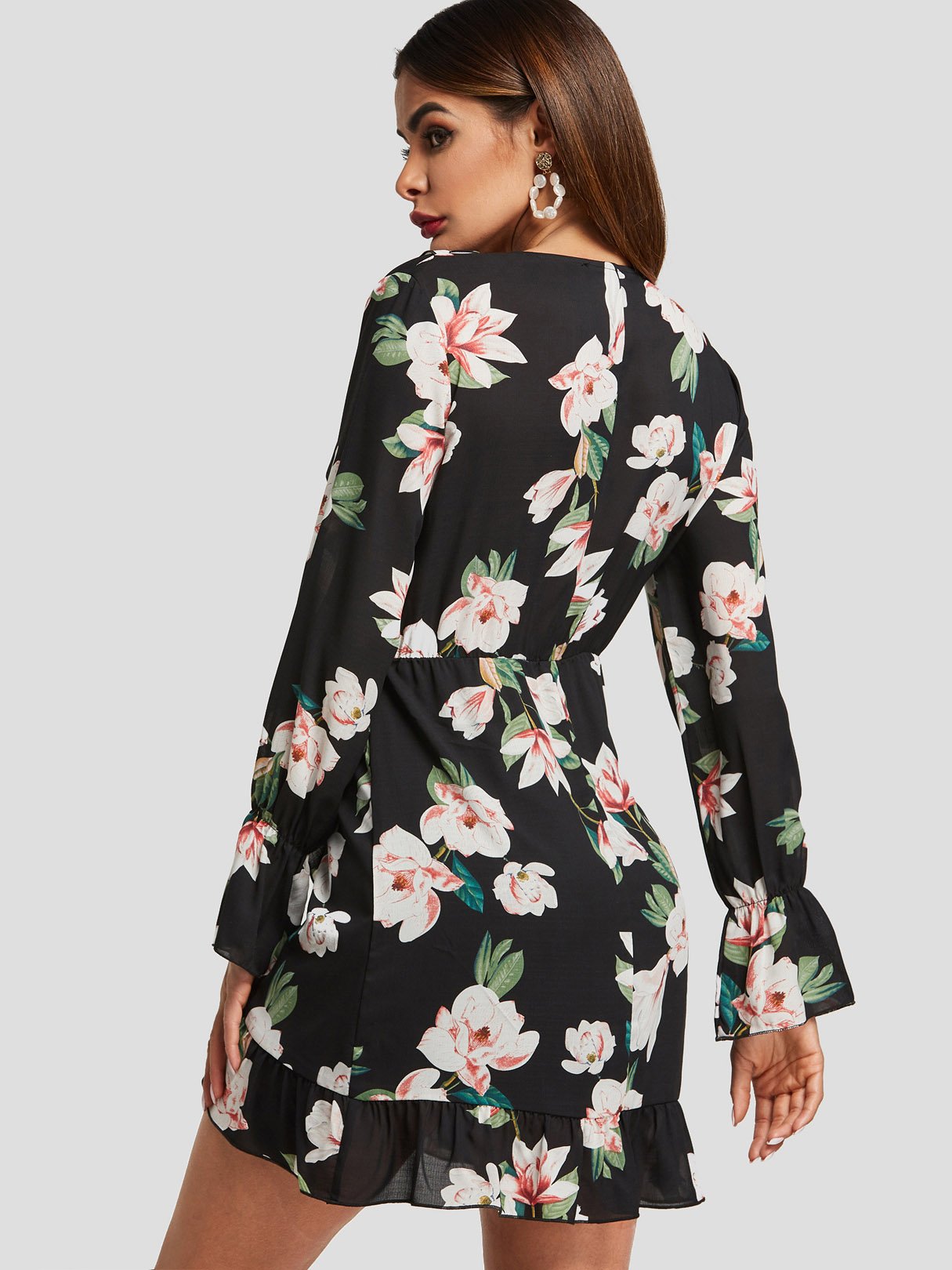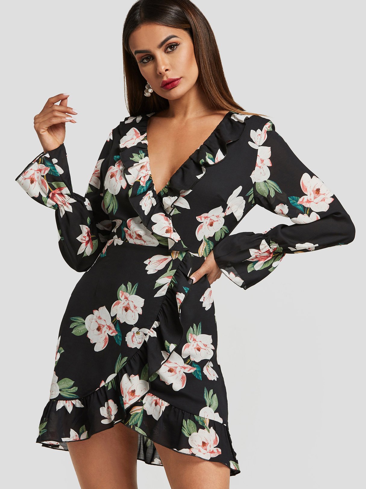 Black V-Neck Long Sleeve Floral Print Crossed Front Ruffle Hem Dresses