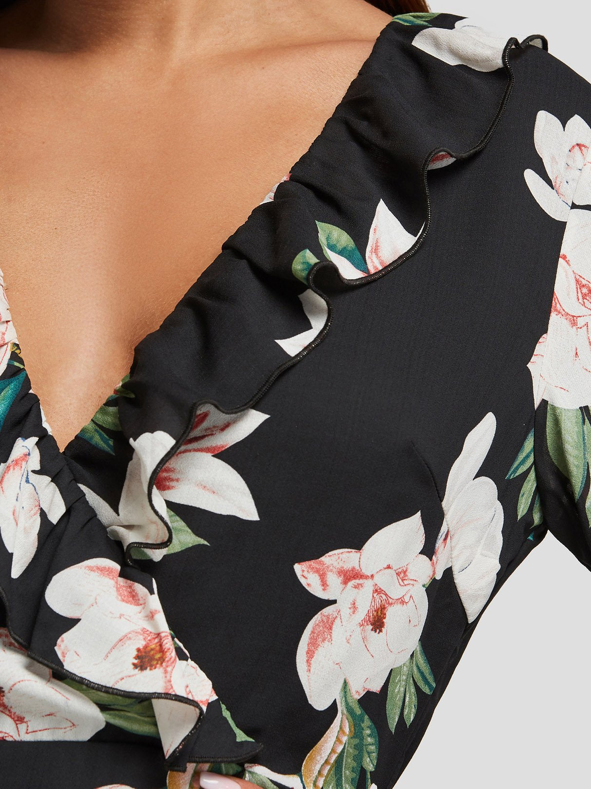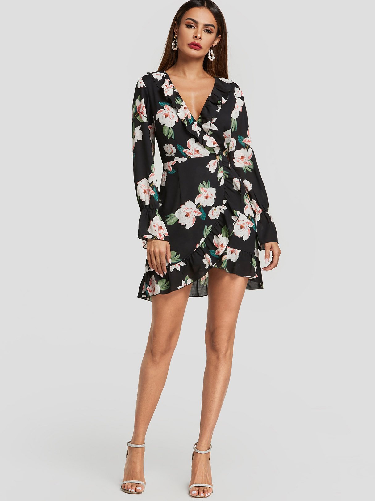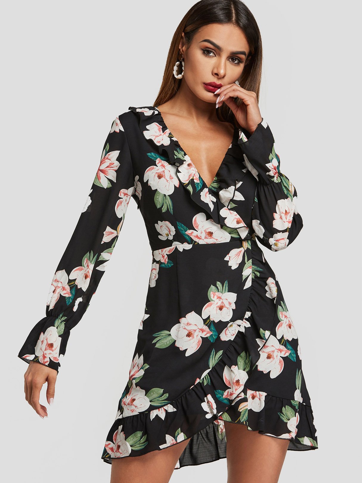 Black V-Neck Long Sleeve Floral Print Crossed Front Ruffle Hem Dresses