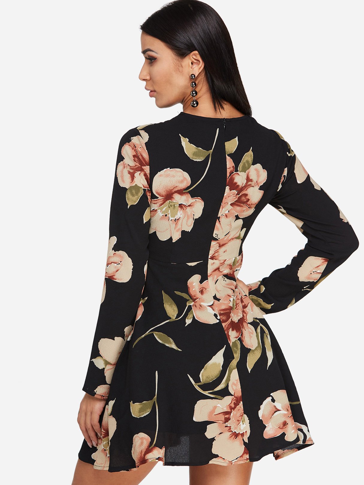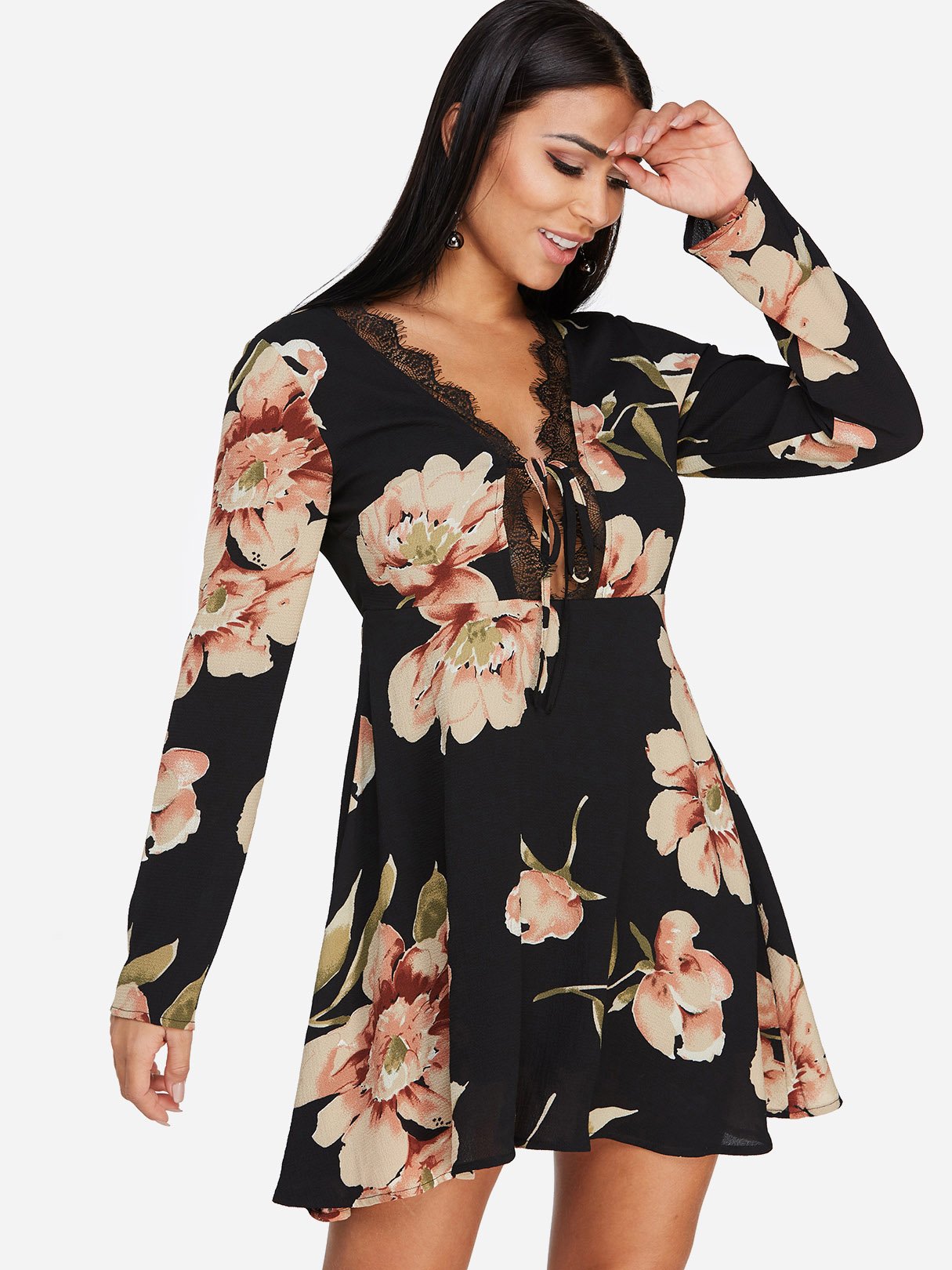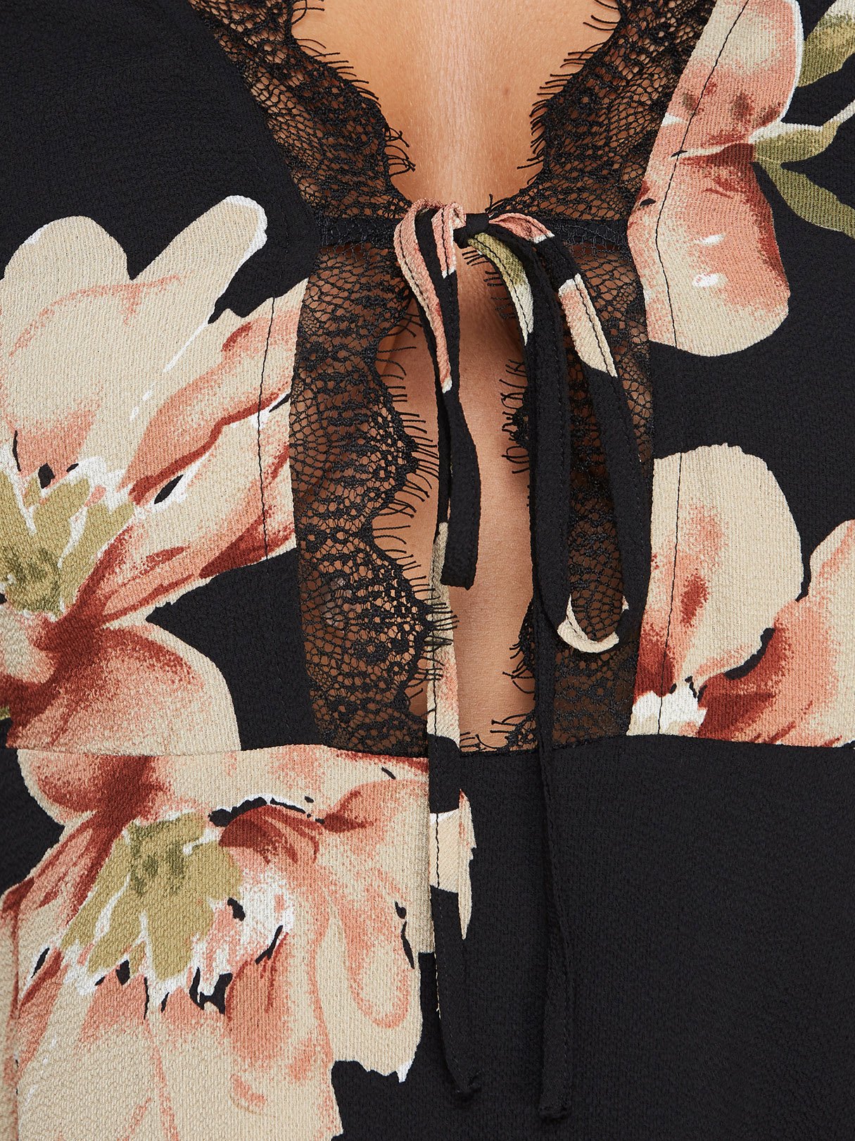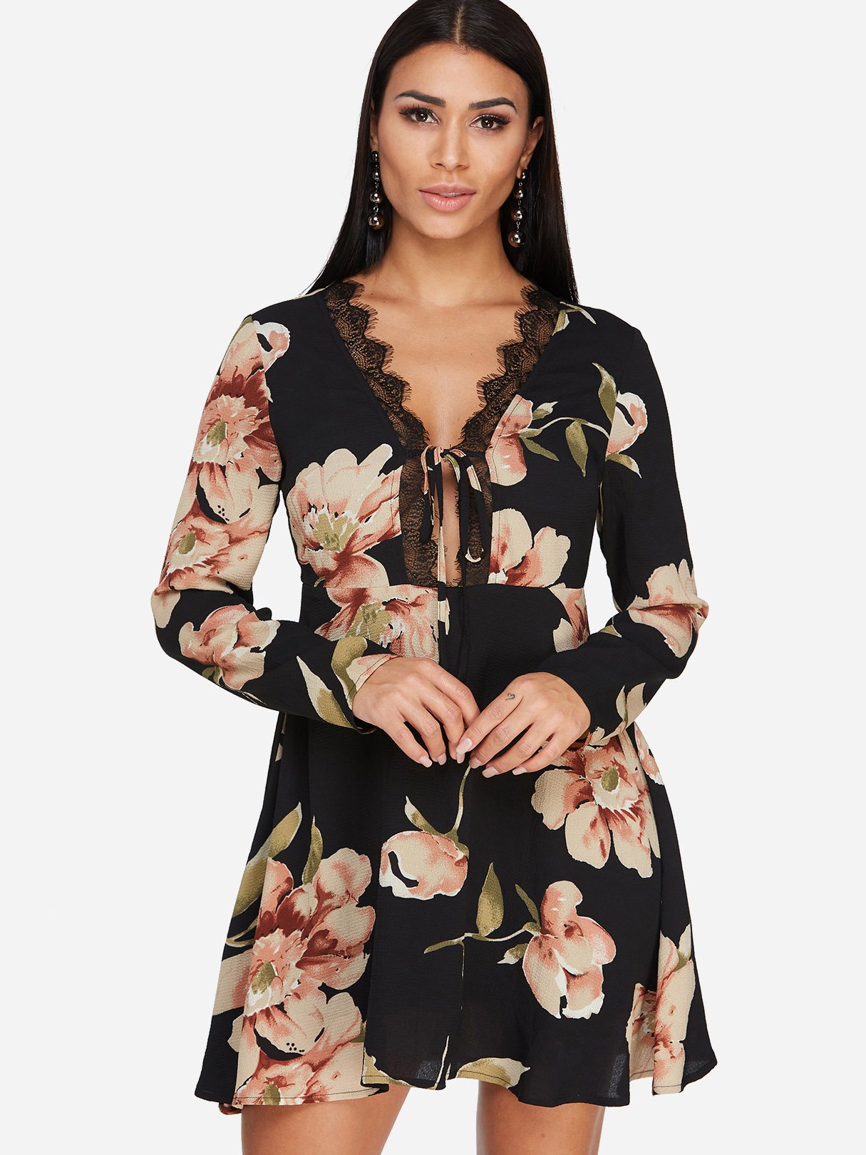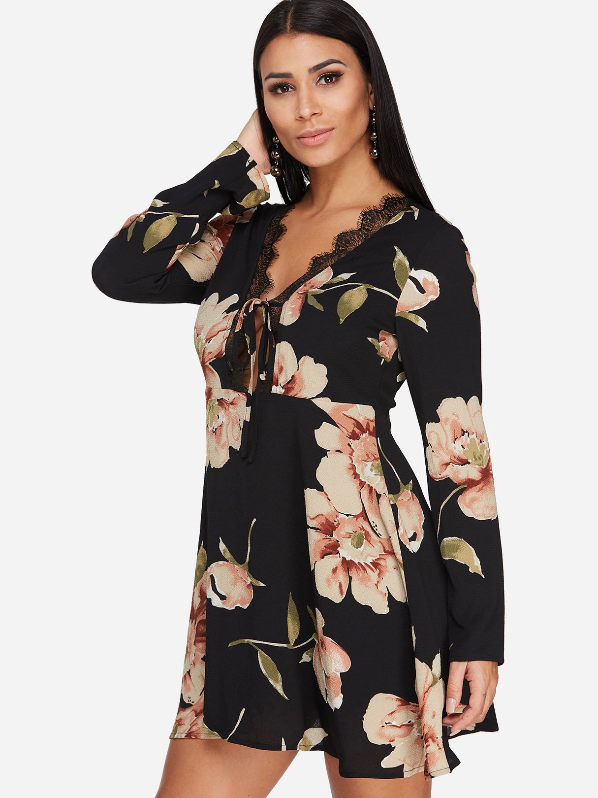 Black V-Neck Long Sleeve Floral Print Lace Self-Tie Dresses
