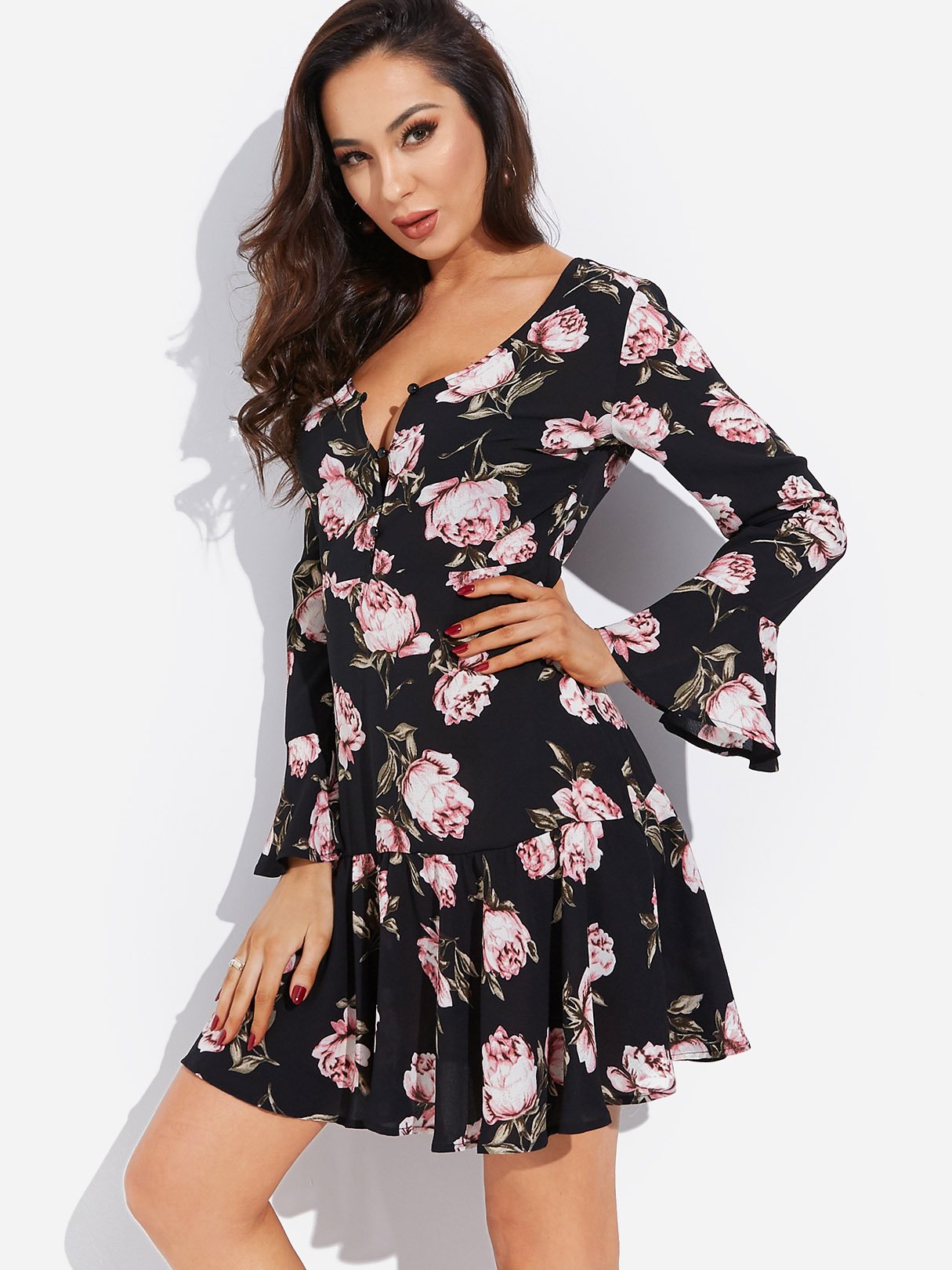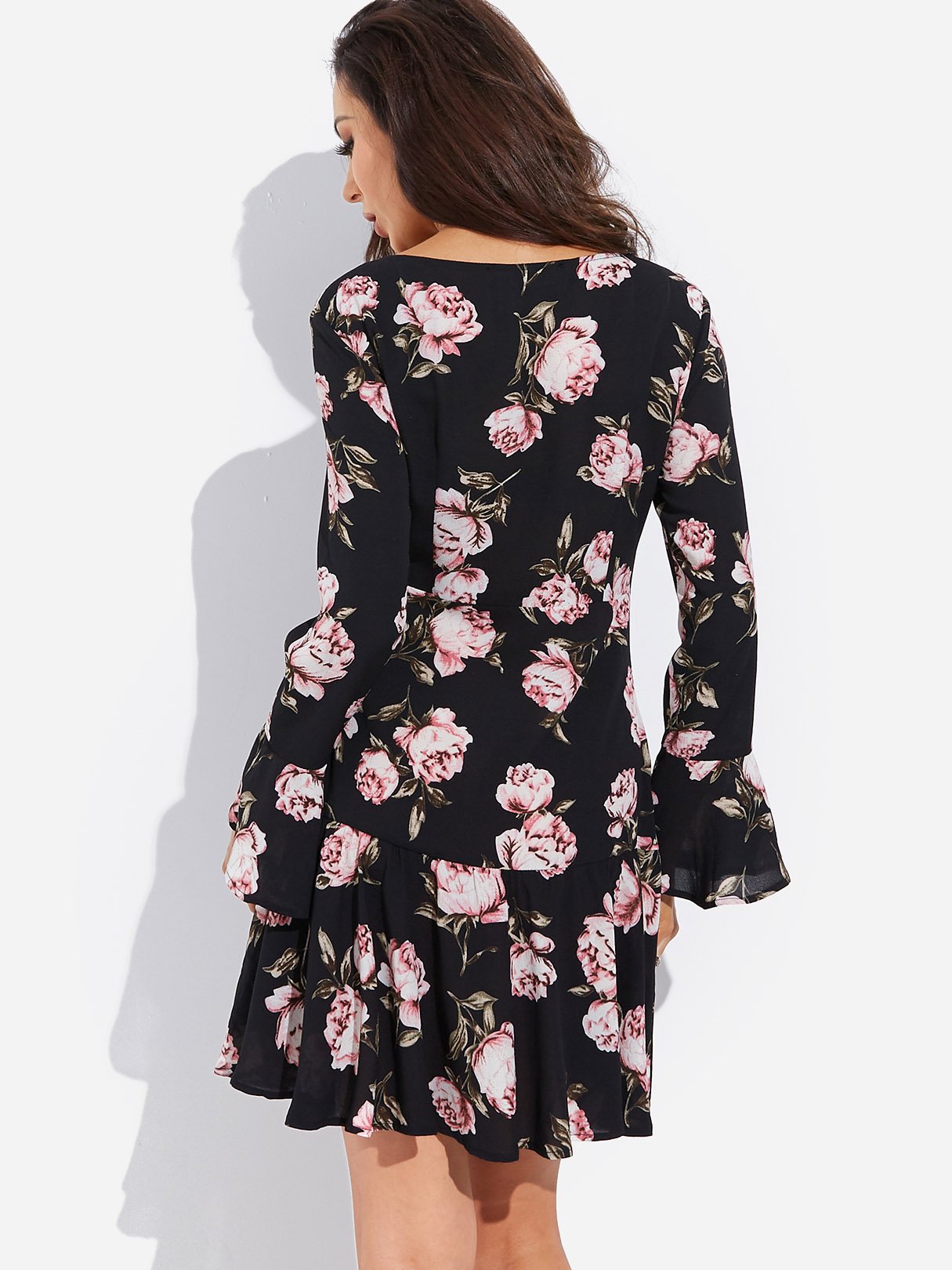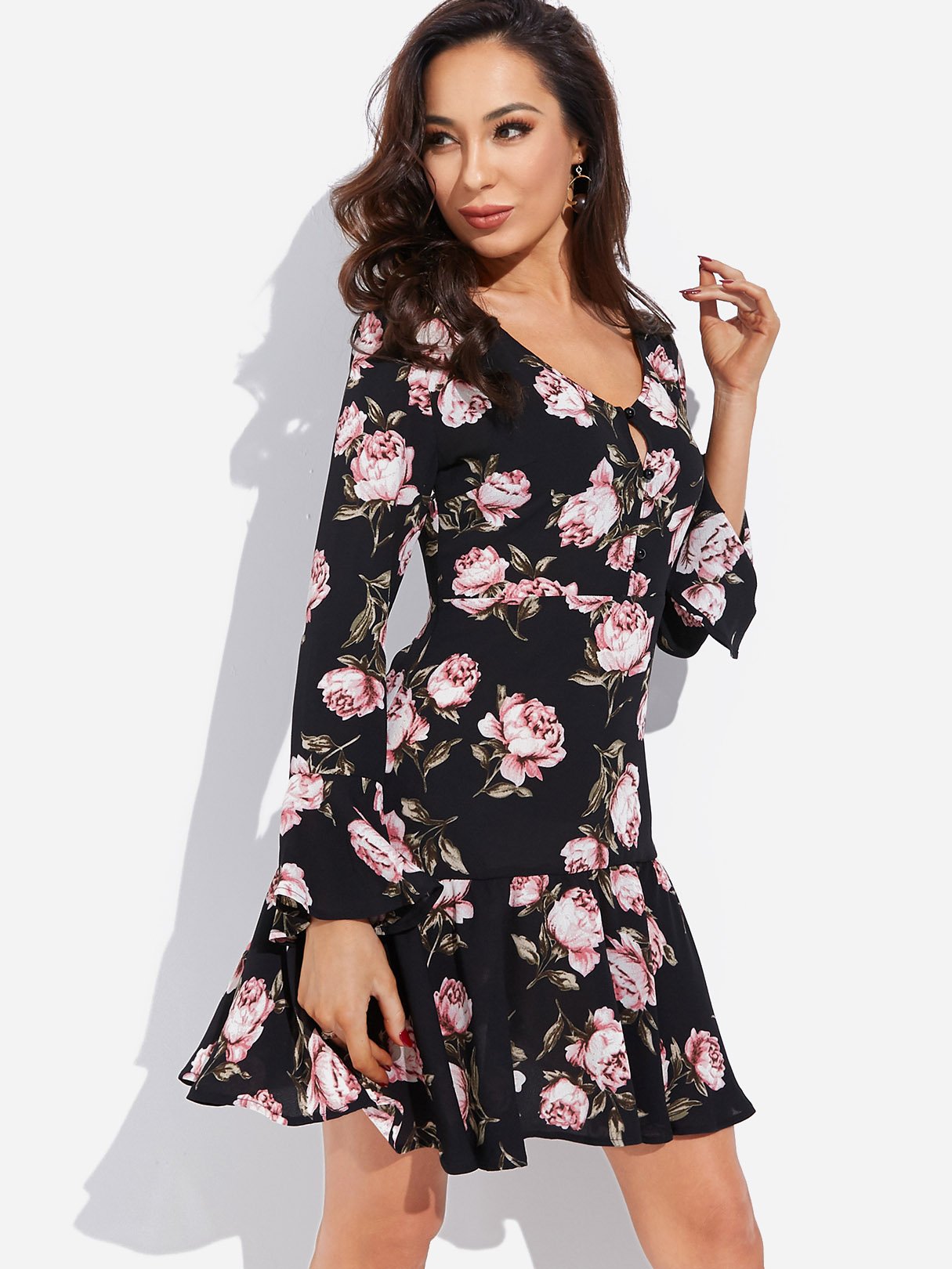 Black V-Neck Long Sleeve Floral Print Ruffle Hem Dresses - Black / S is backordered and will ship as soon as it is back in stock.