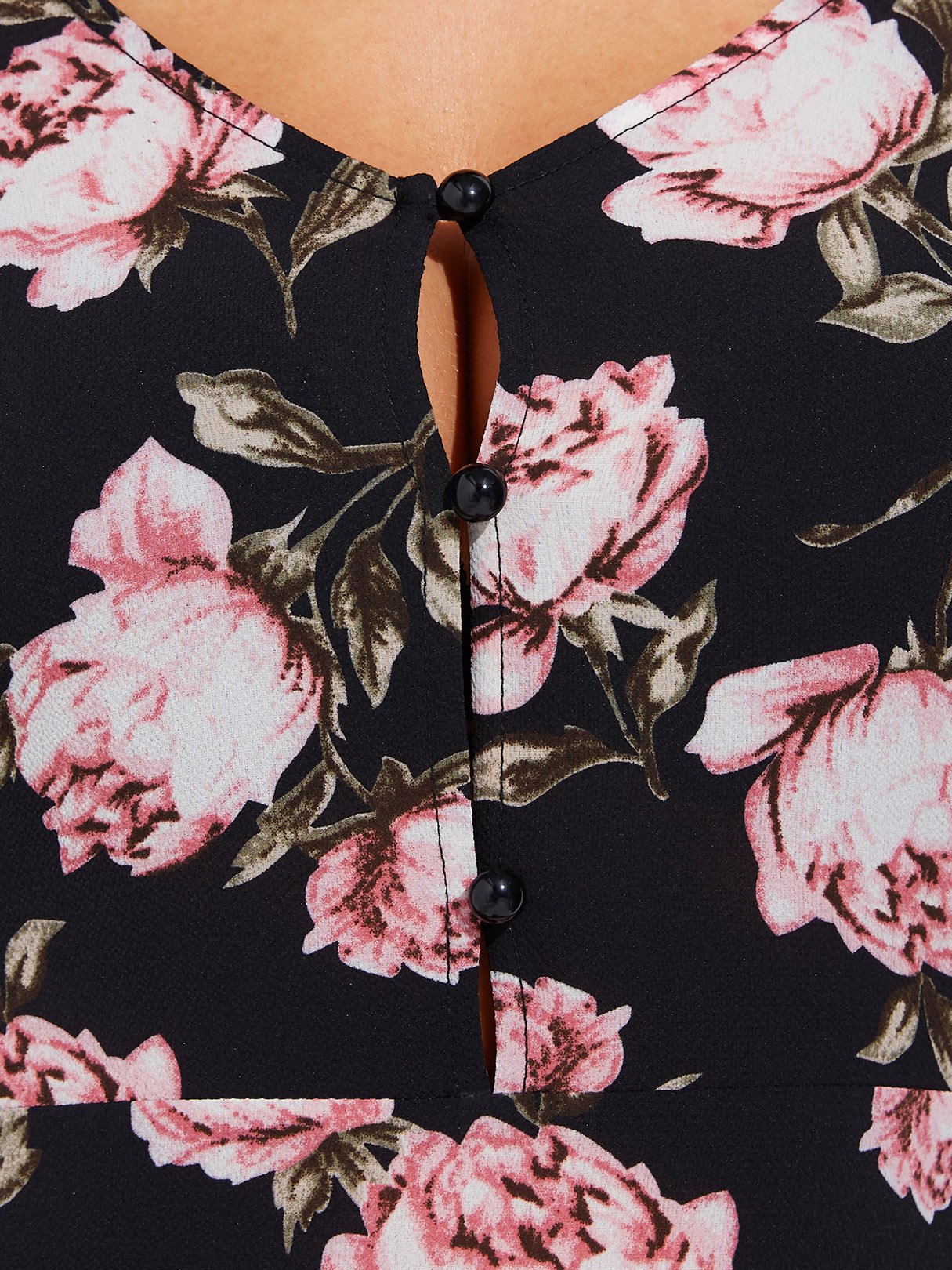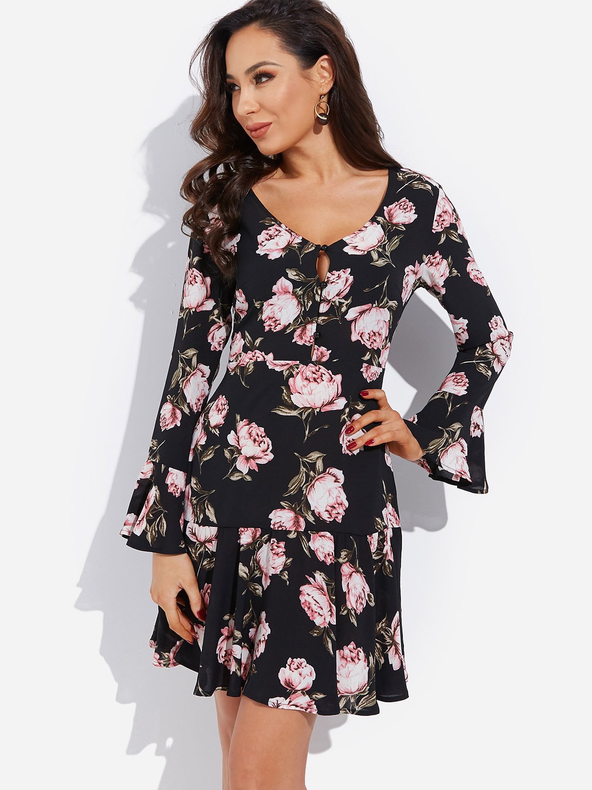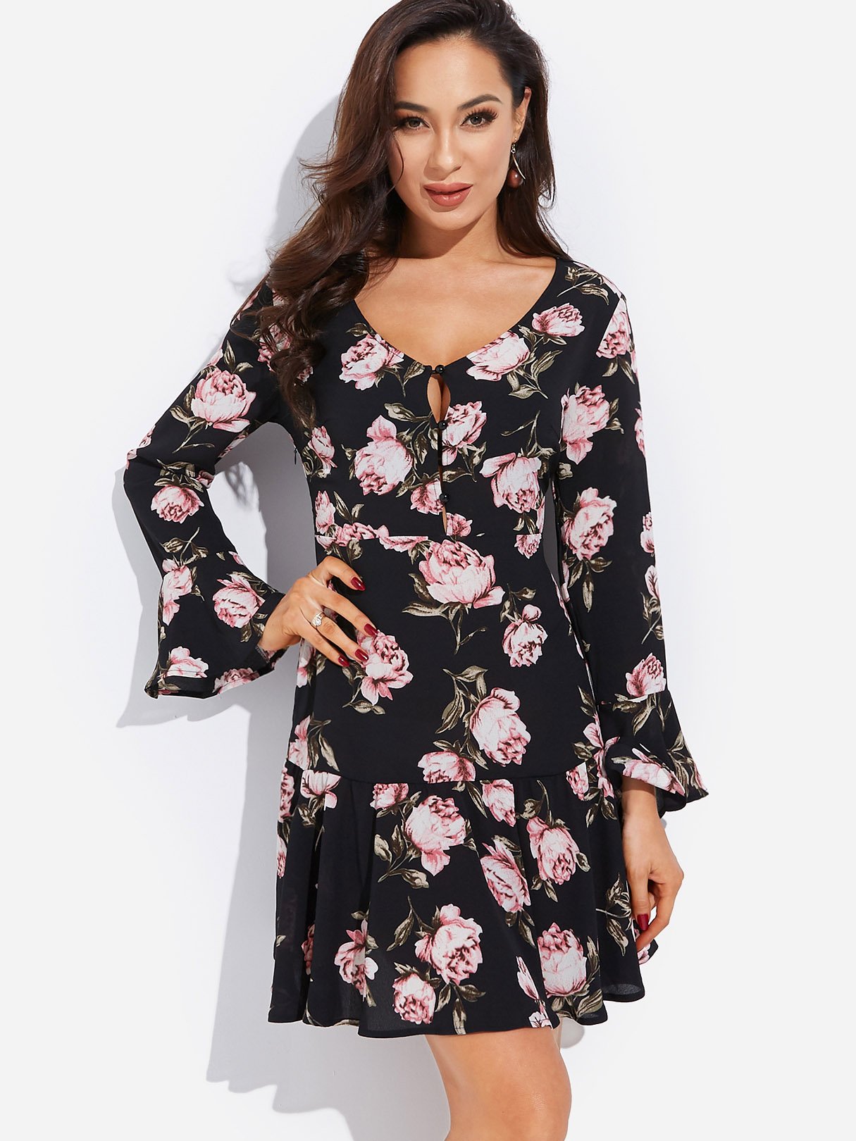 Black V-Neck Long Sleeve Floral Print Ruffle Hem Dresses - Black / S is backordered and will ship as soon as it is back in stock.