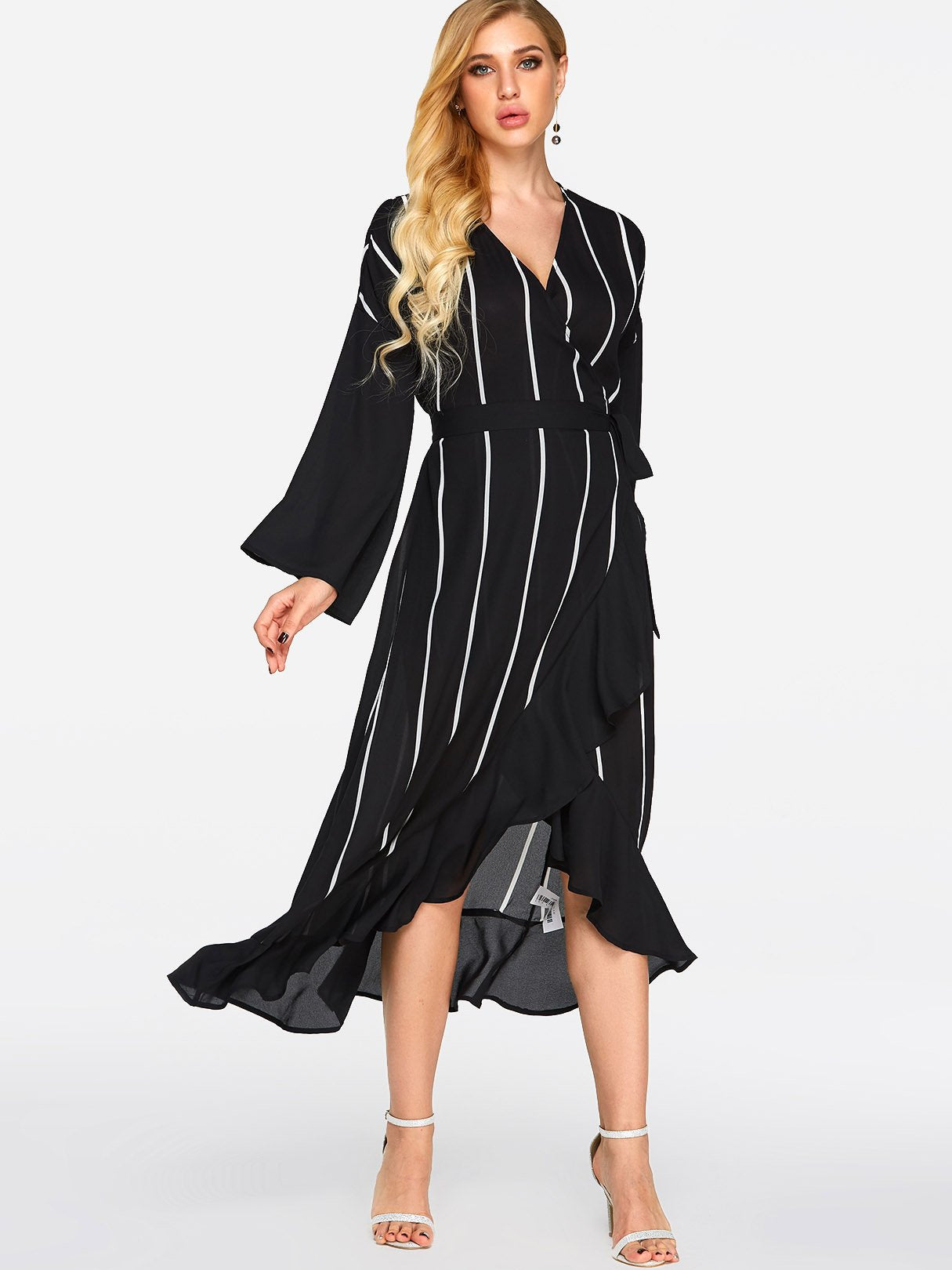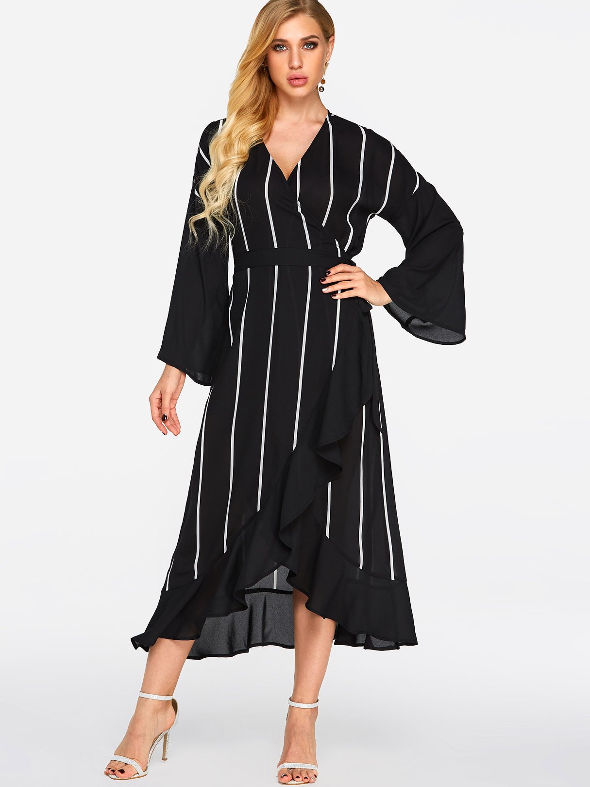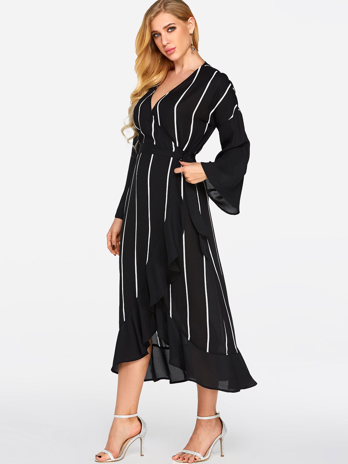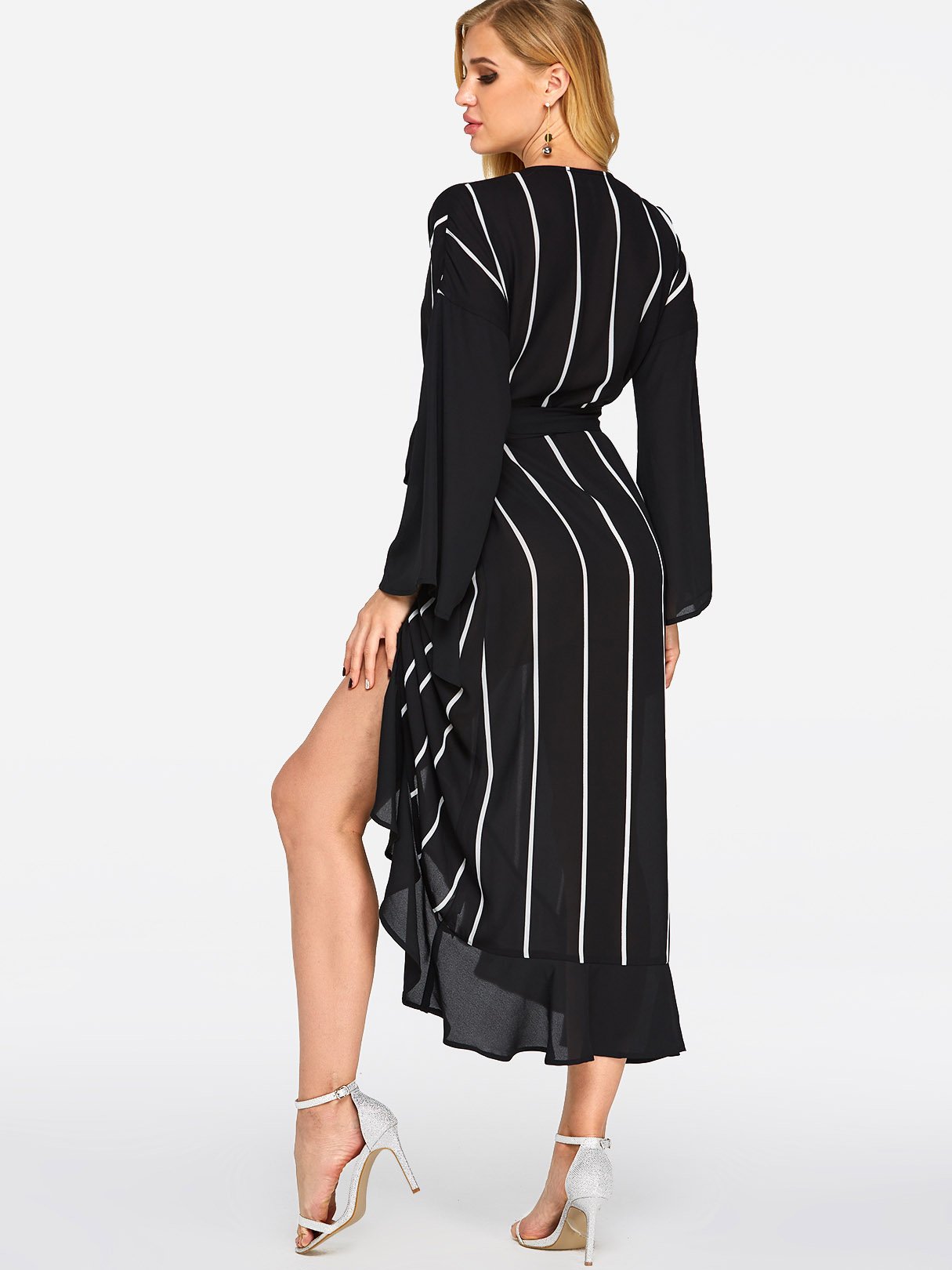Black V-Neck Long Sleeve Stripe Self-Tie Wrap Slit Flounced Hem Maxi Dresses