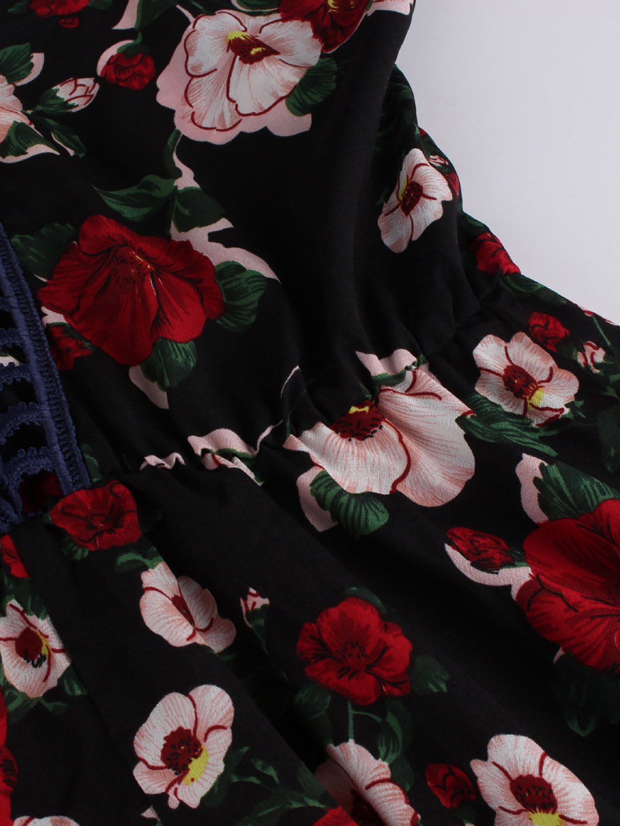 Black V-Neck Short Sleeve Floral Print Backless Hollow Dresses