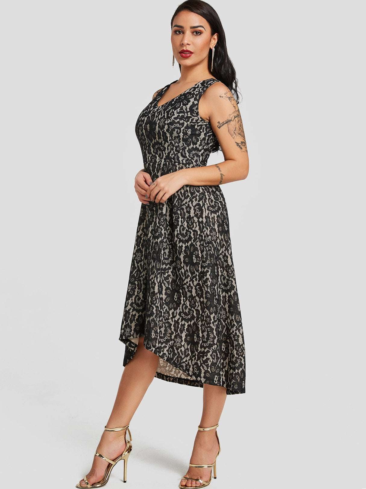 Material:Polyester,SpandexNeckline:V-NeckSeason:Spring,Summer,AutumnSleeves:SleevelessPattern:PlainStyle:Sexy StyleDetail:Crochet Lace Embellished ,Zip Back Design,Backless DesignWaist Design:High-WaistedLength:MidiFit:Regular FitOccasion:Party,Wedding Guest