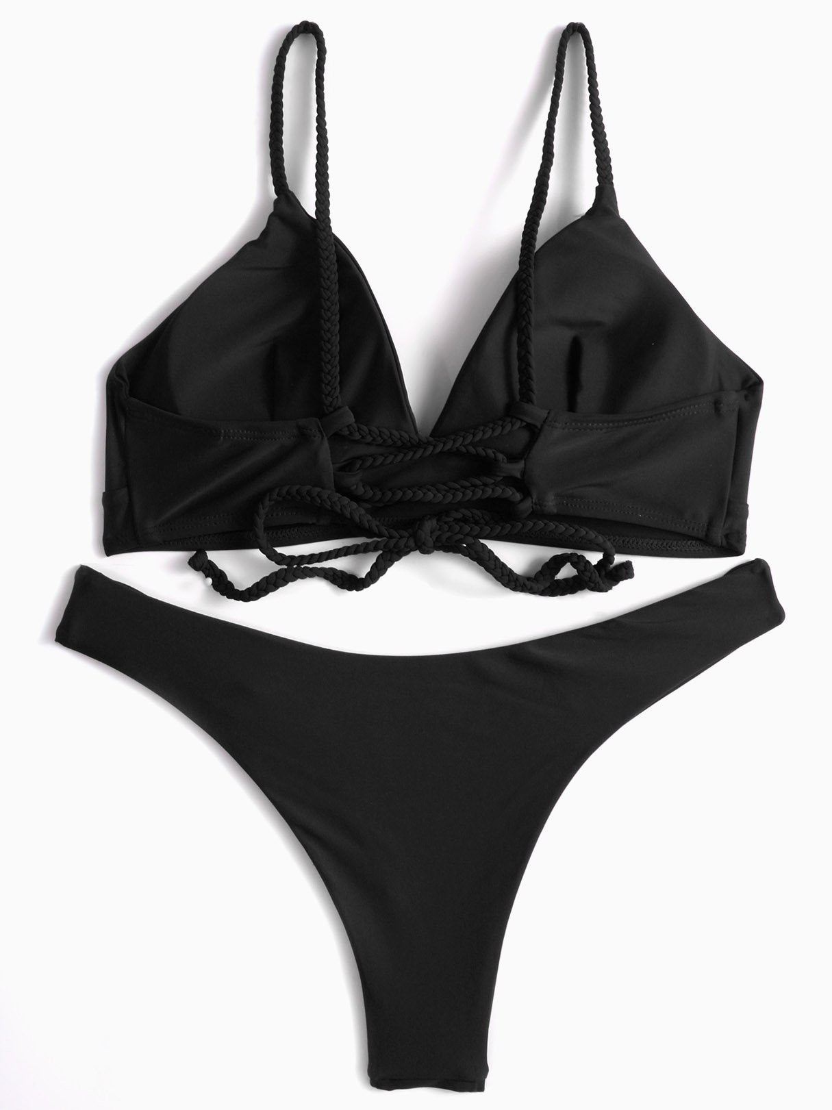 Black V-Neck Sleeveless Plain Lace-Up Two Piece Bikinis
