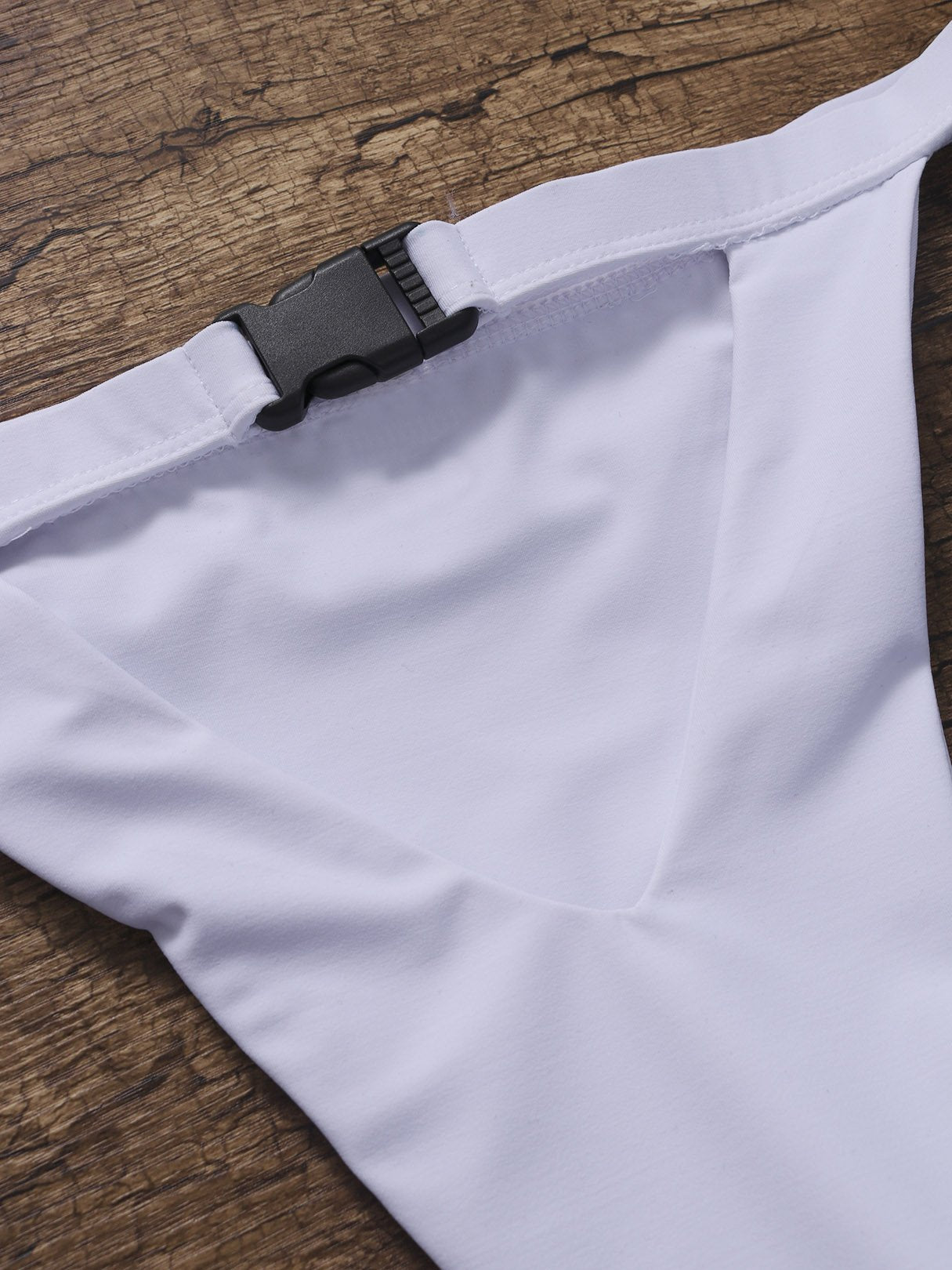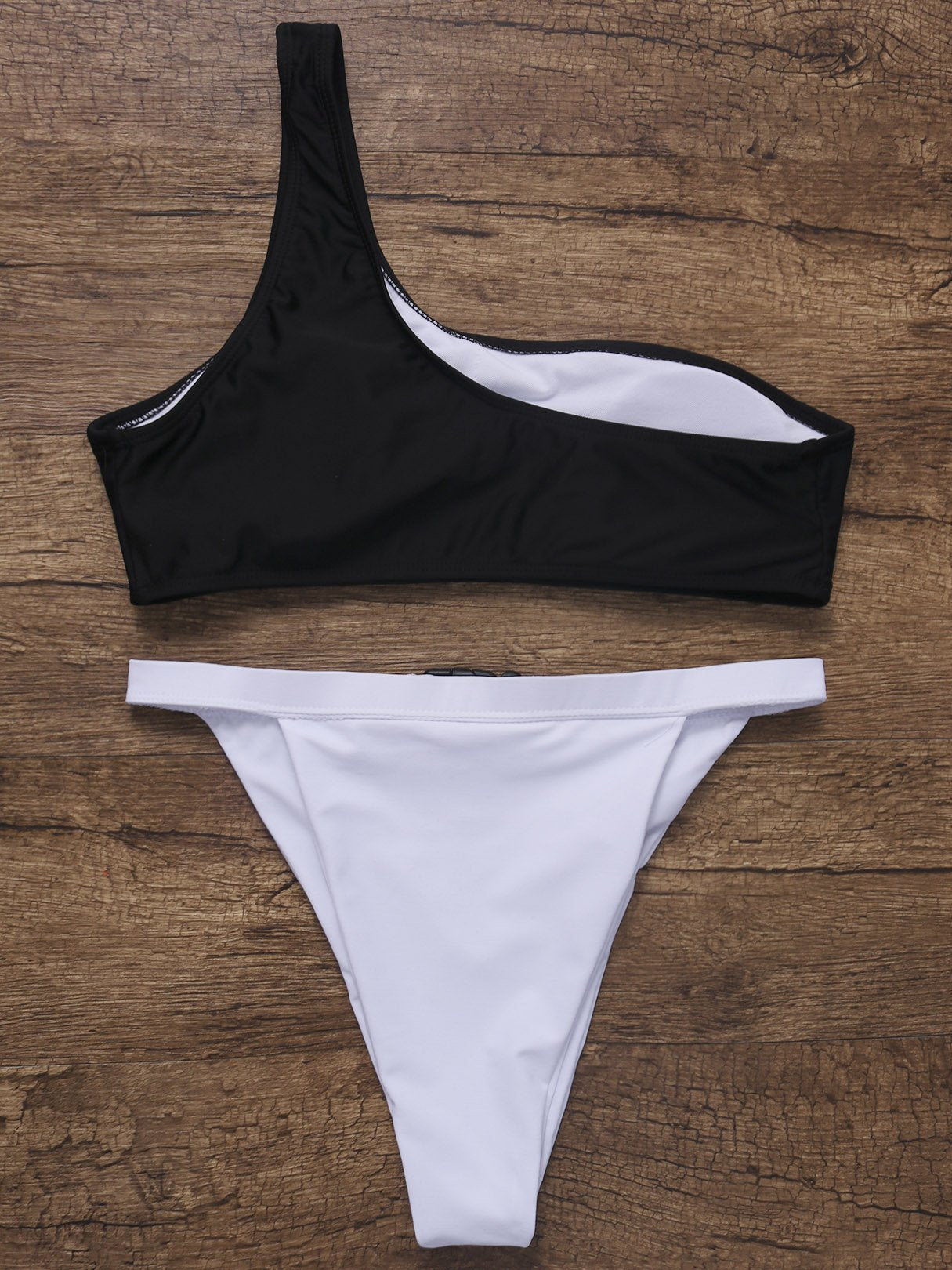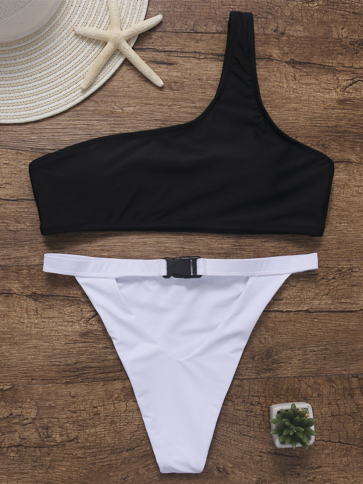 Black & White One Shoulder Sleeveless Plain Lace-Up Cut Out Pocket High Waist 2 Piece Bikinis