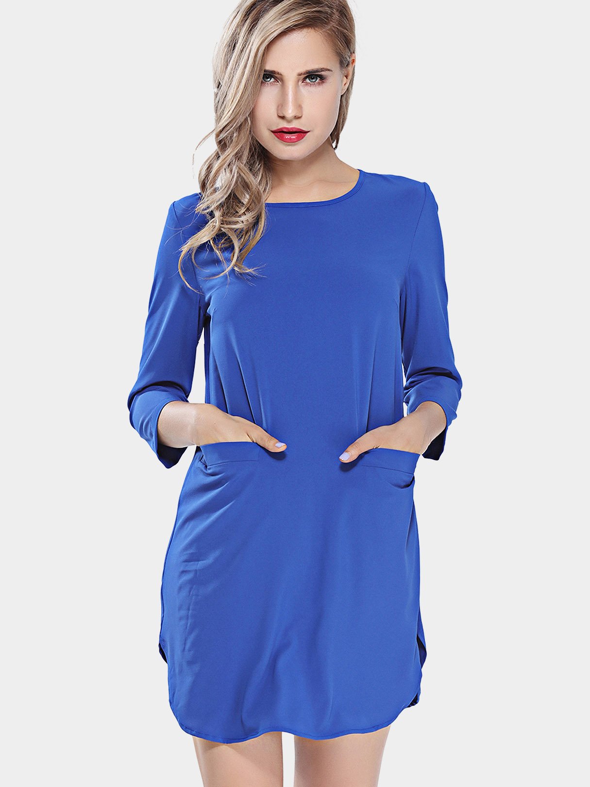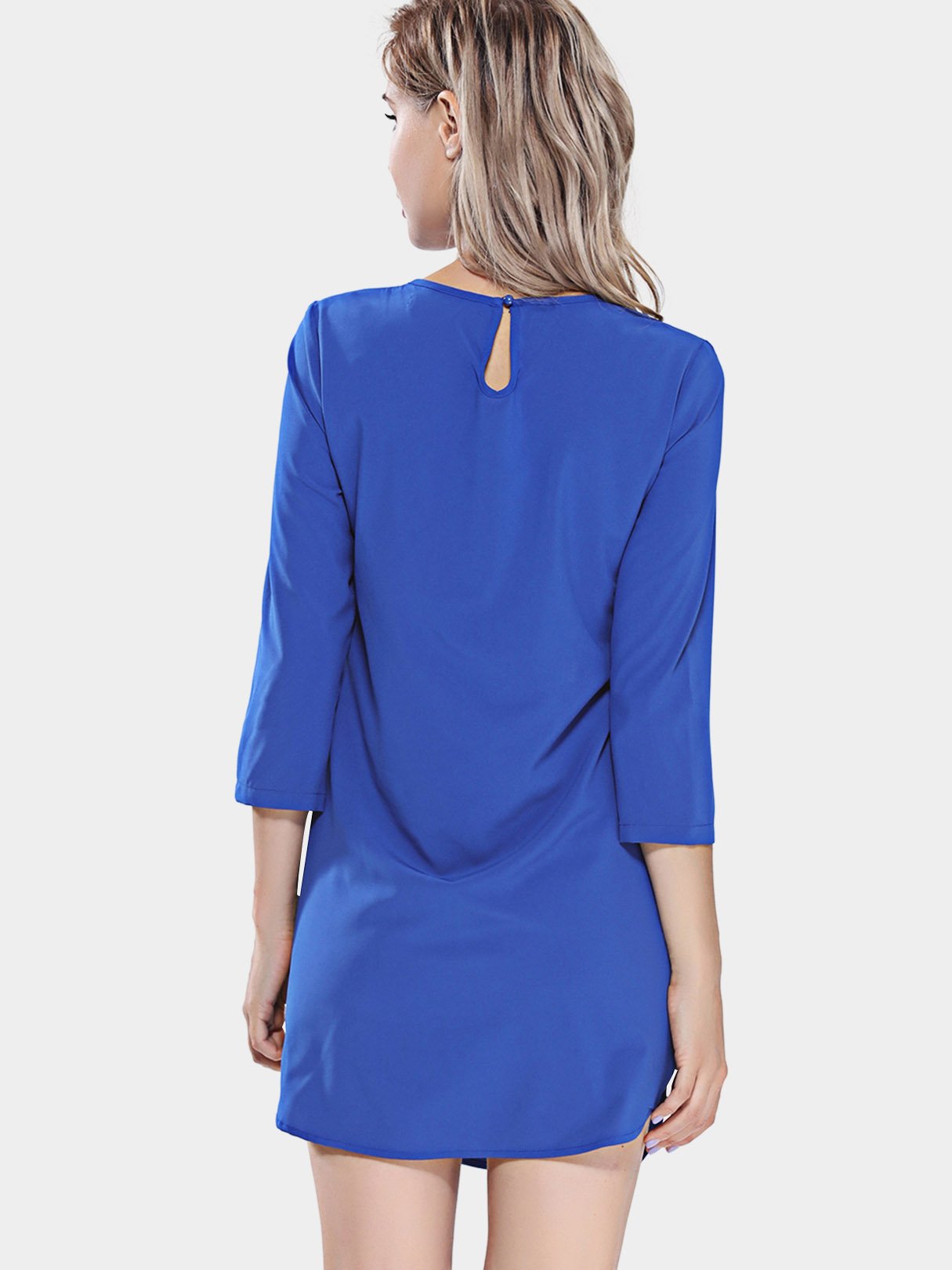 Blue Crew Neck 3/4 Length Sleeve Plain Curved Hem Mini Dresses