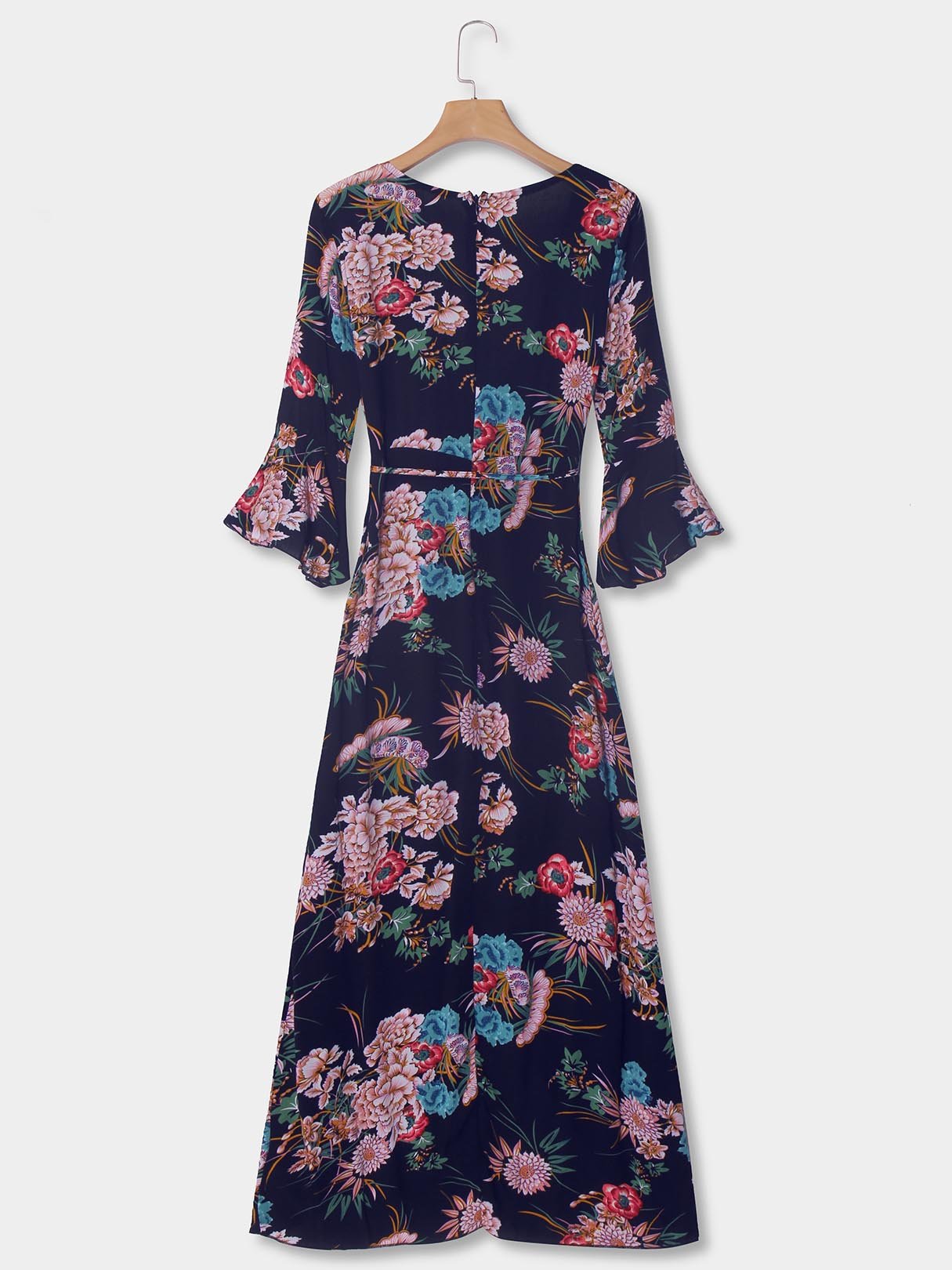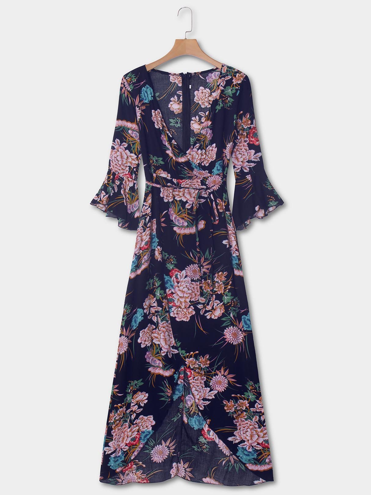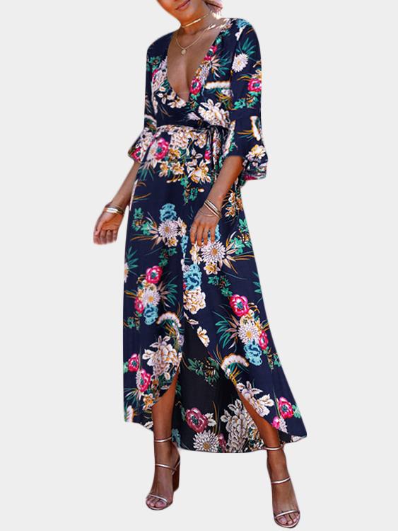 Blue Deep V Neck 3/4 Length Sleeve Floral Print Lace-Up Slit Hem Dresses