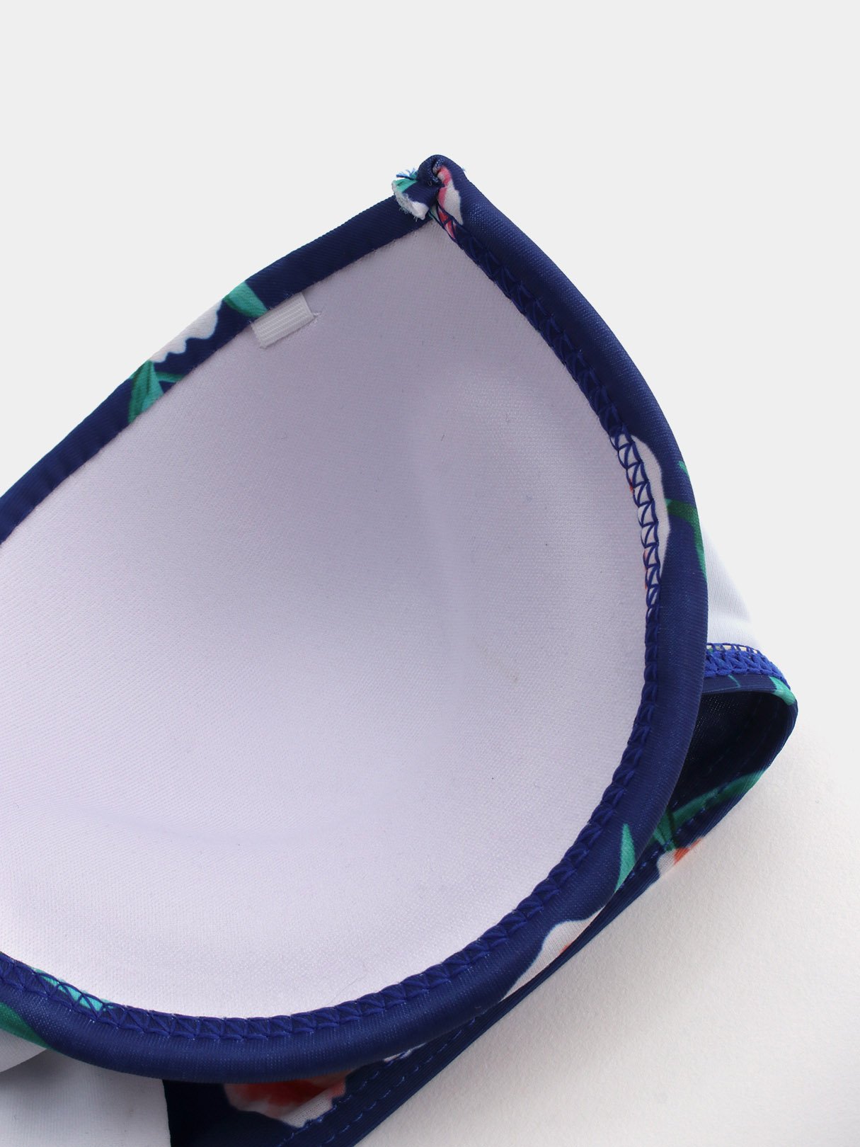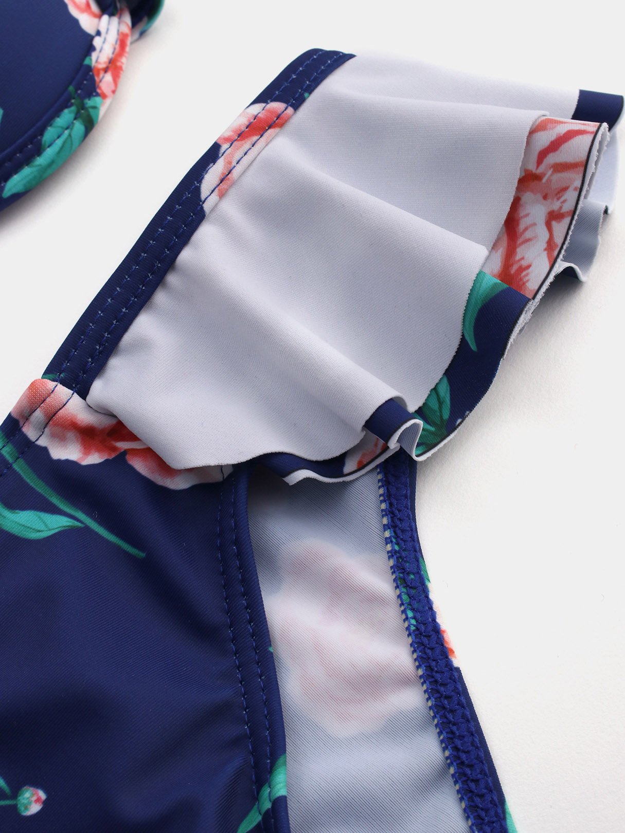 Blue Floral Print Self-Tie Ruffle Trim Bikini Swimwear