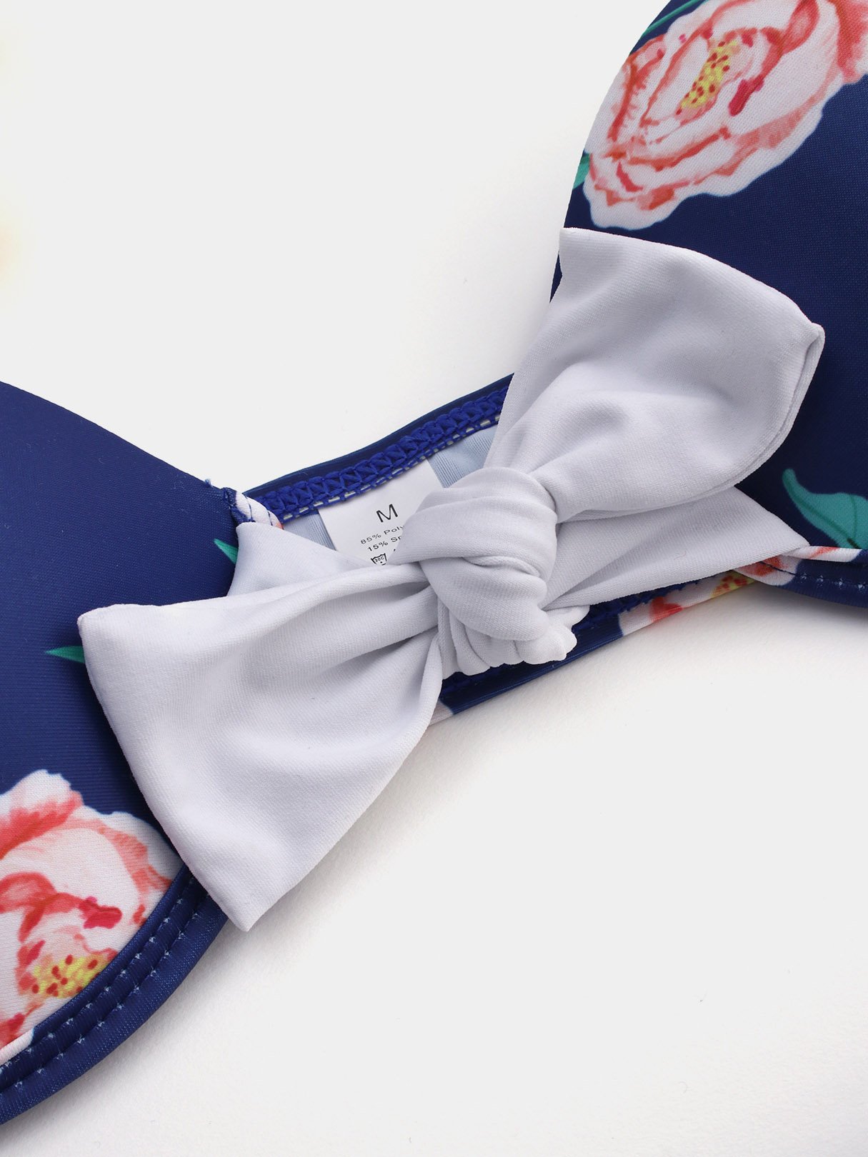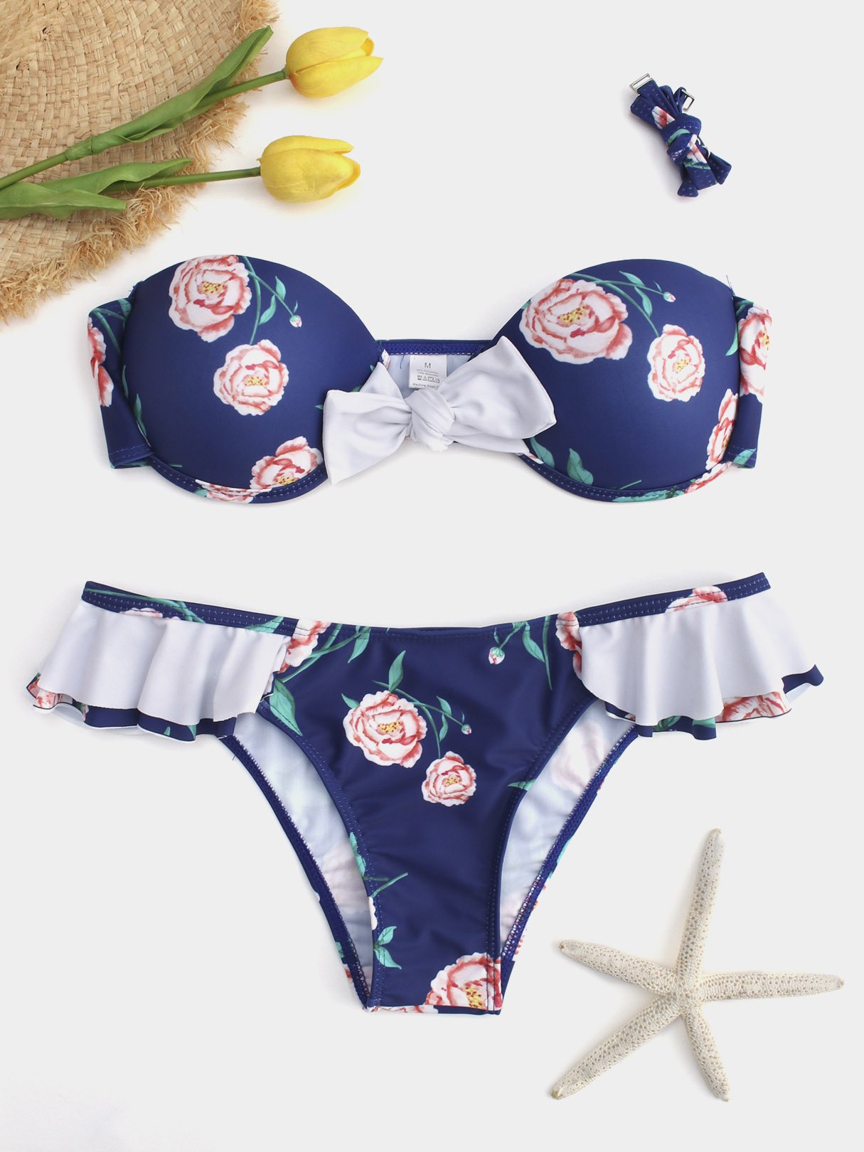 Blue Floral Print Self-Tie Ruffle Trim Two Piece Bikinis