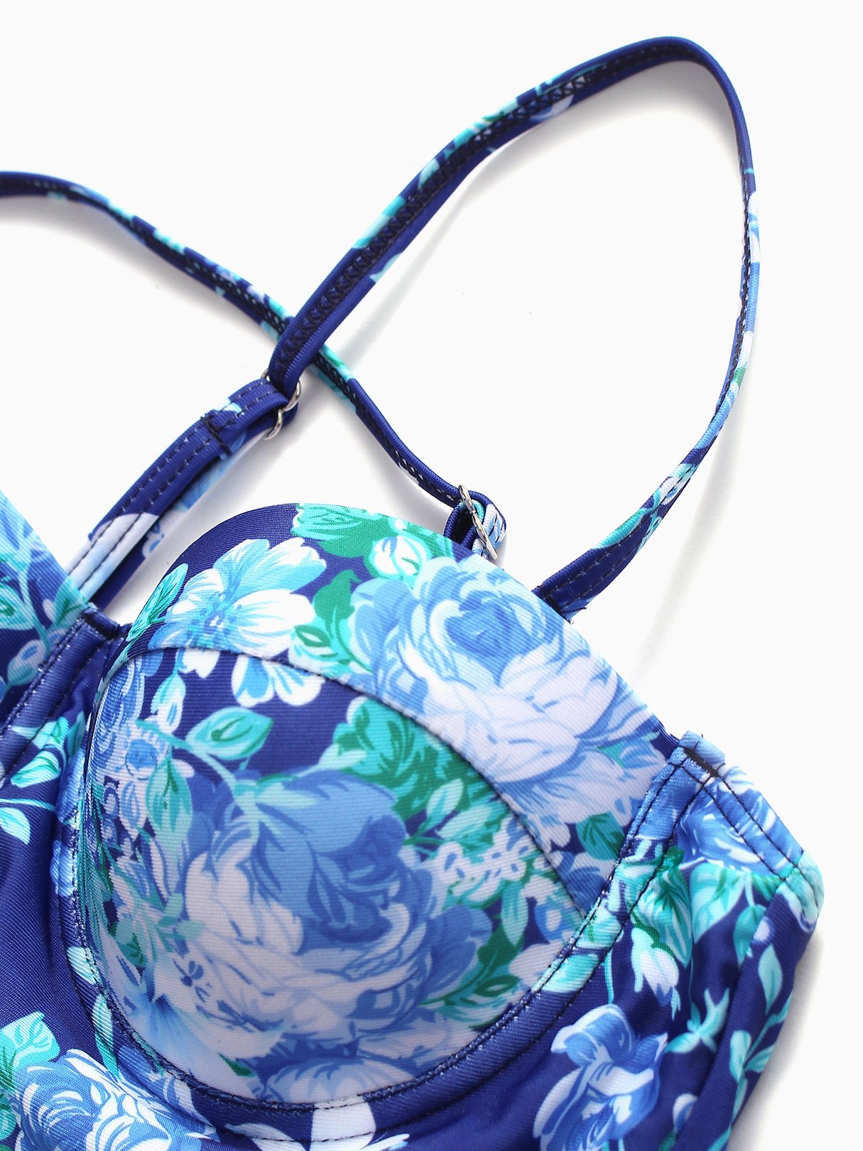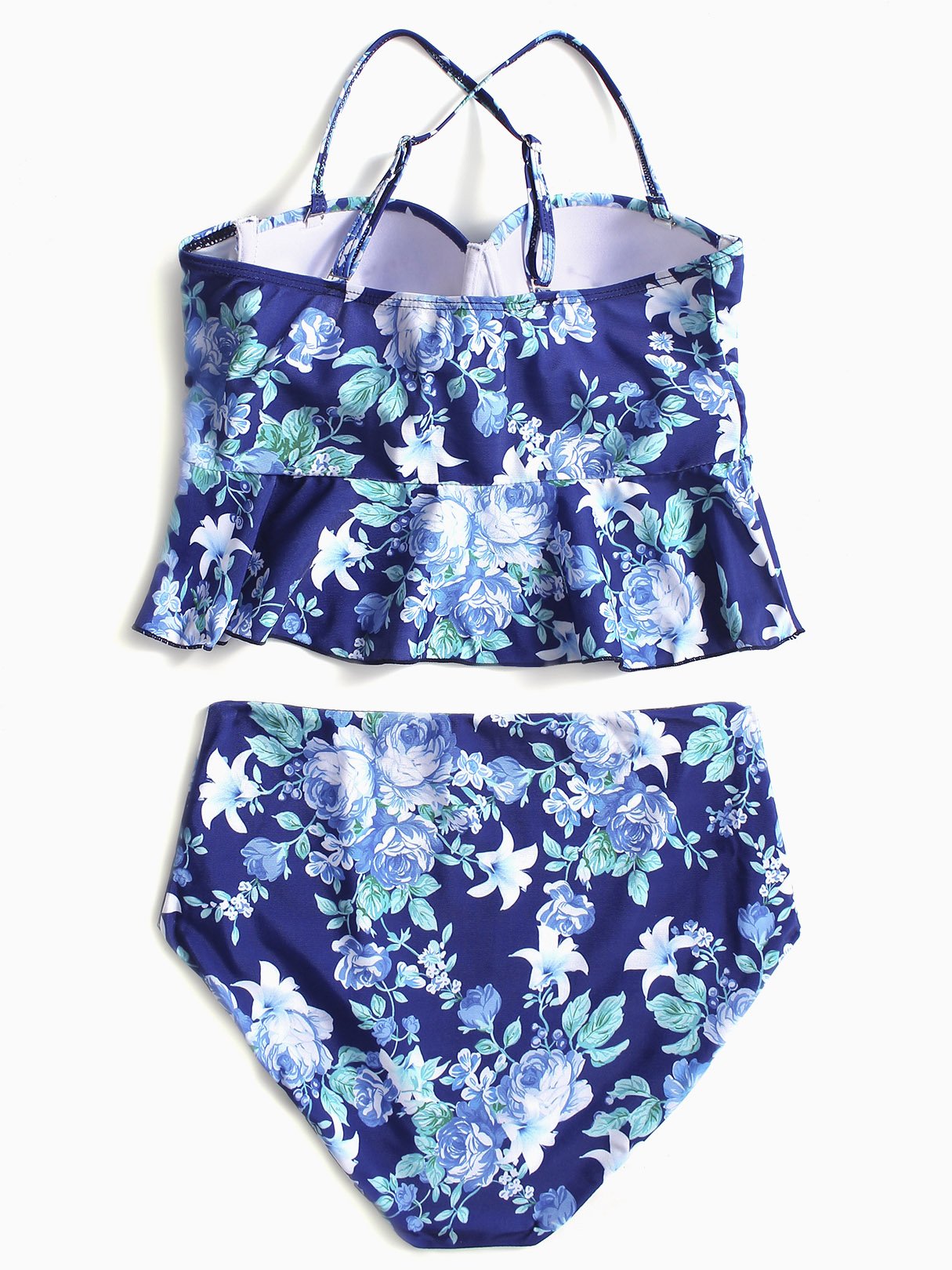 Blue Halter Sleeveless Floral Print Backless Flounced Hem Two Piece Bikinis