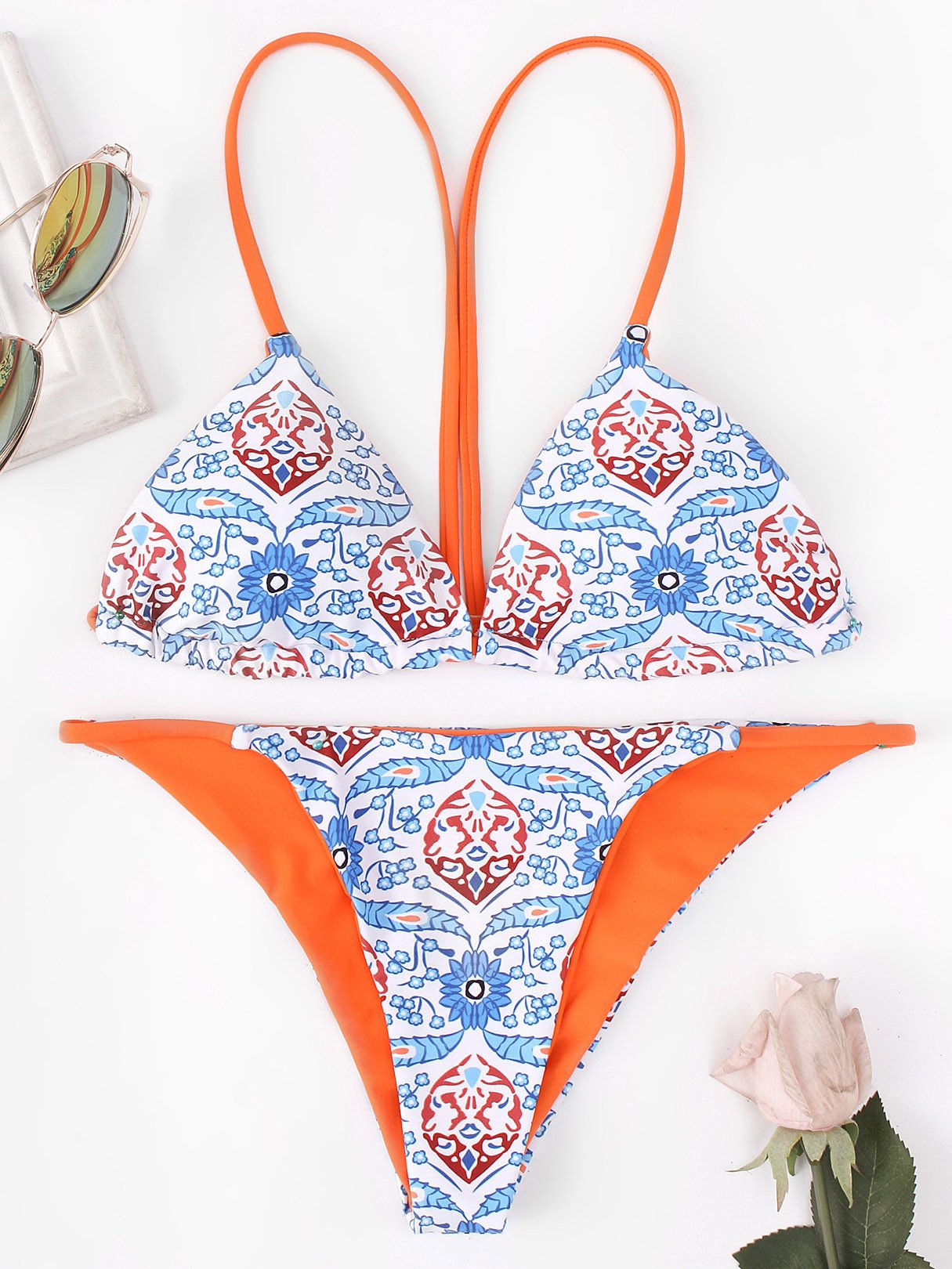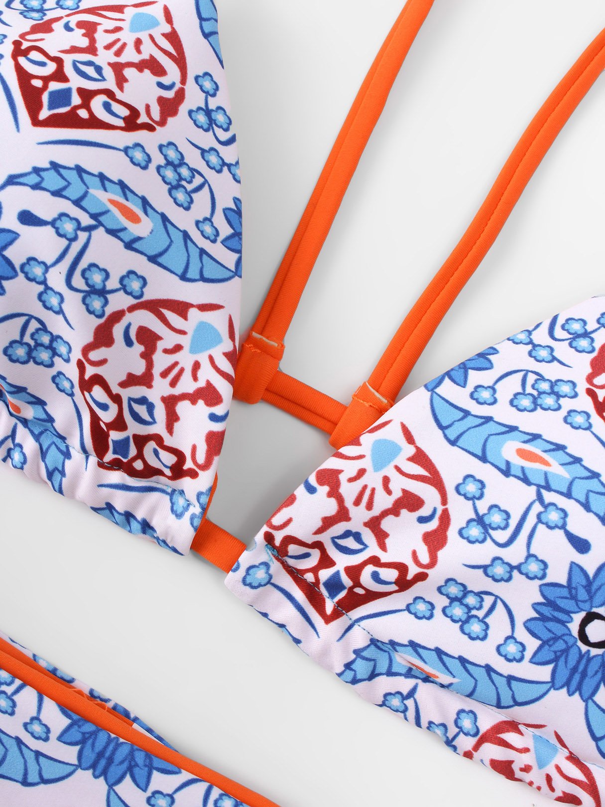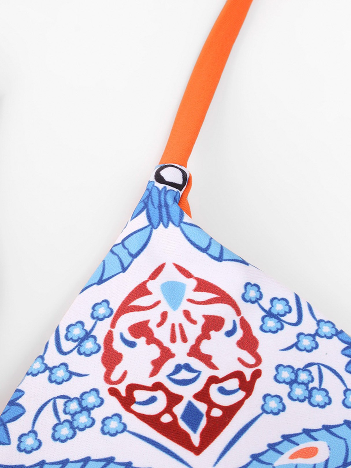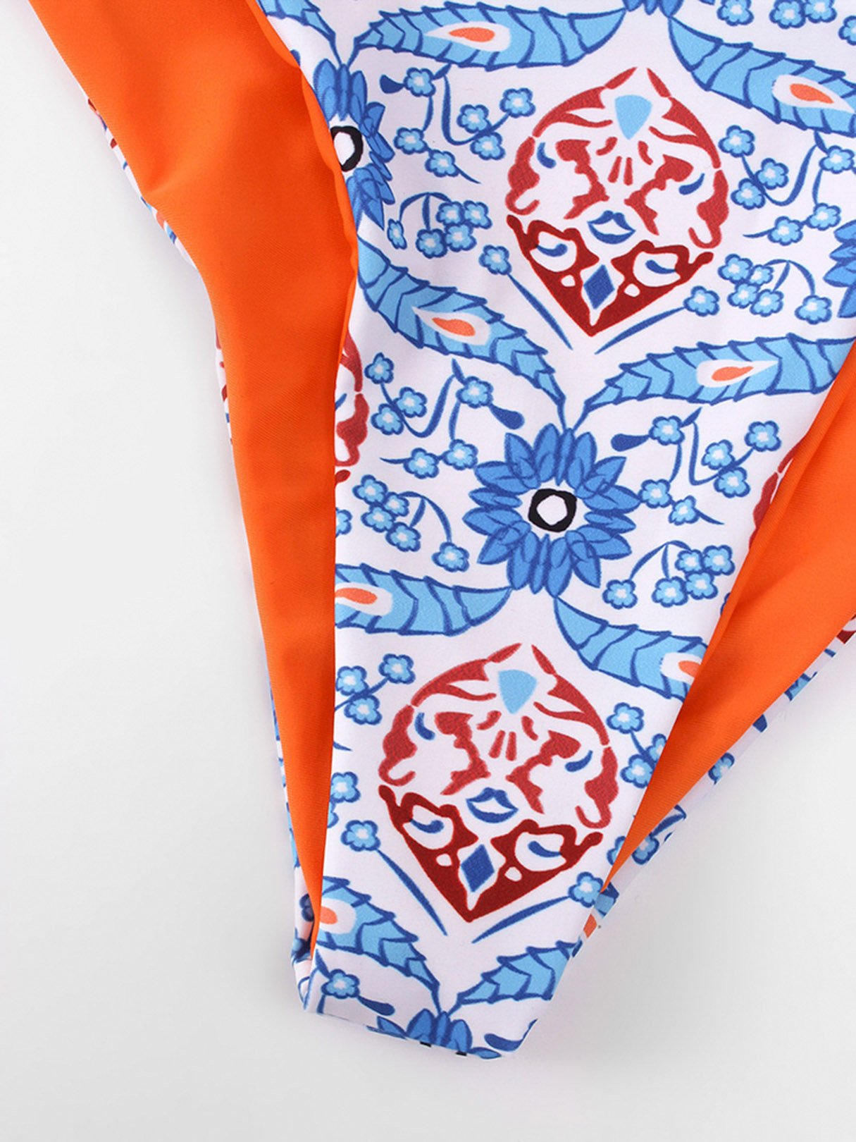 Blue Halter Sleeveless Floral Print Backless Two Piece Bikinis