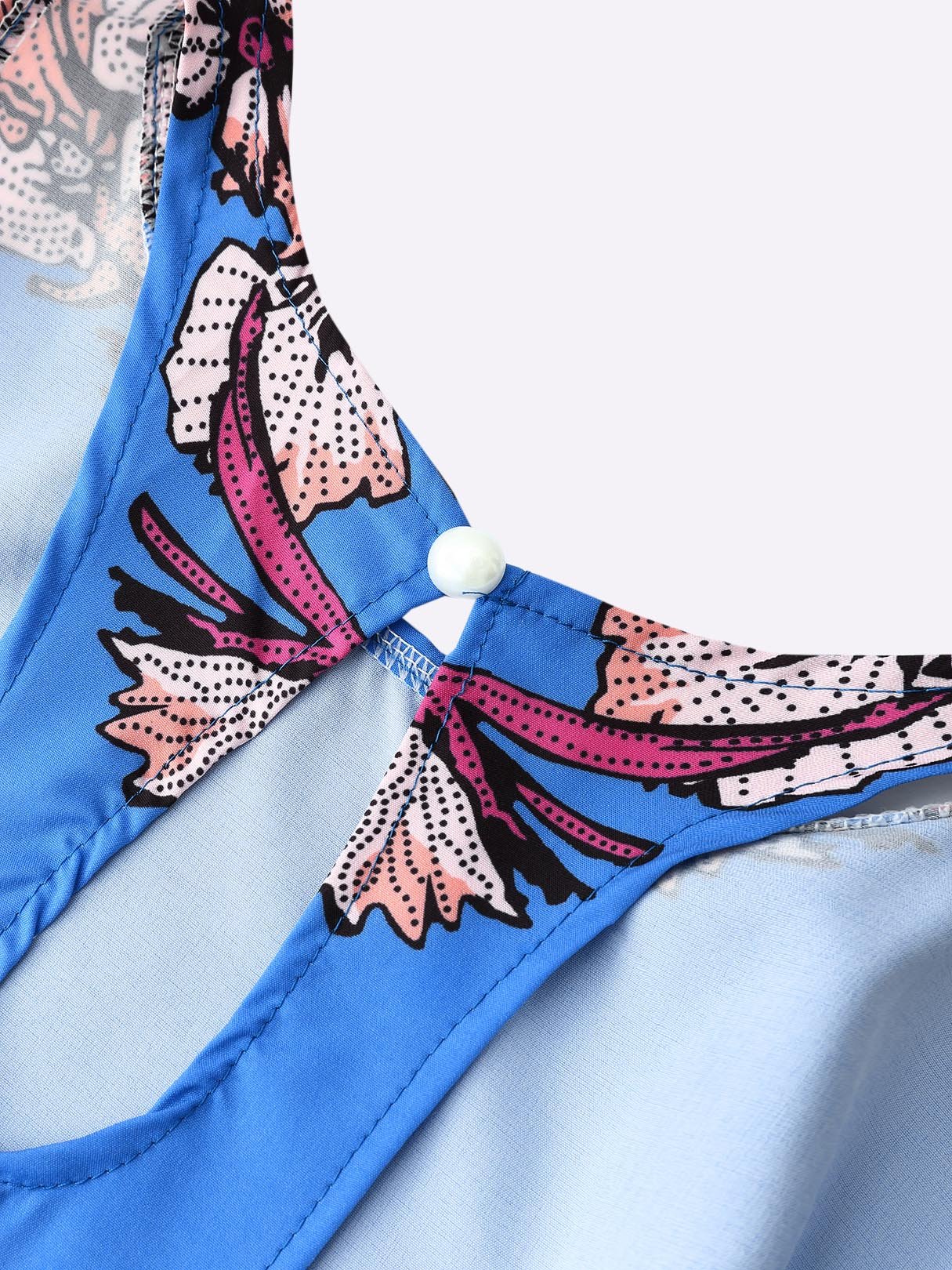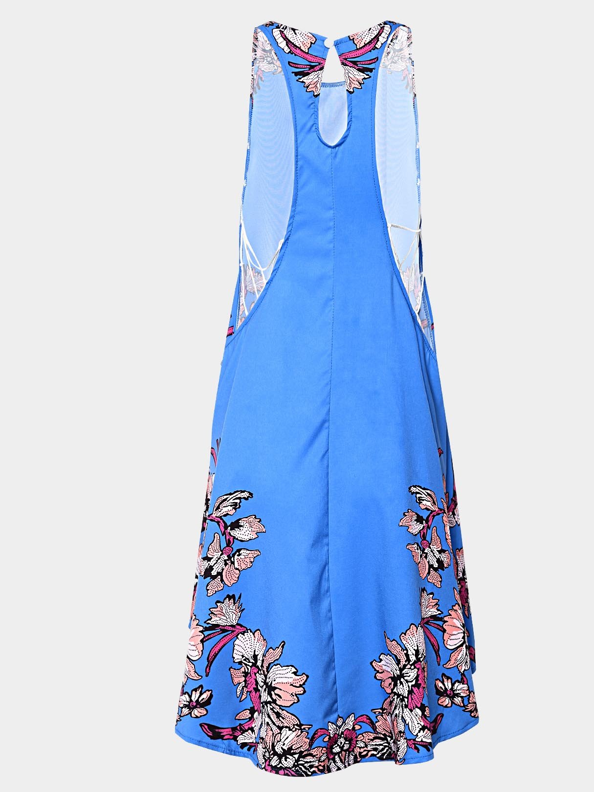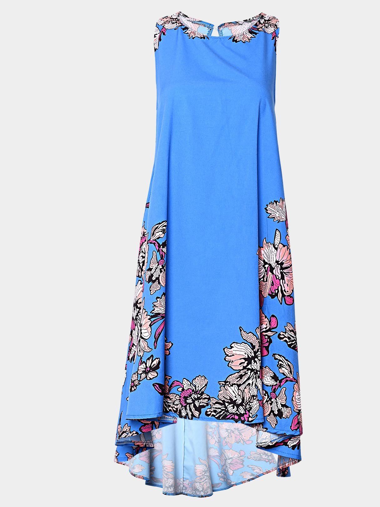 Blue Round Neck Sleeveless Floral Print Curved Hem Dresses