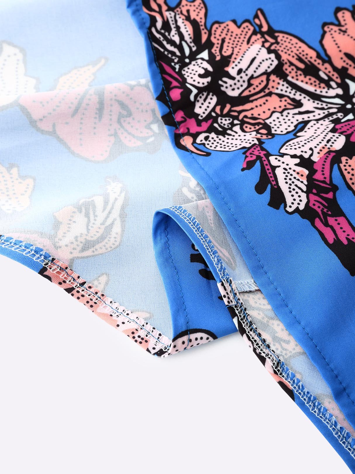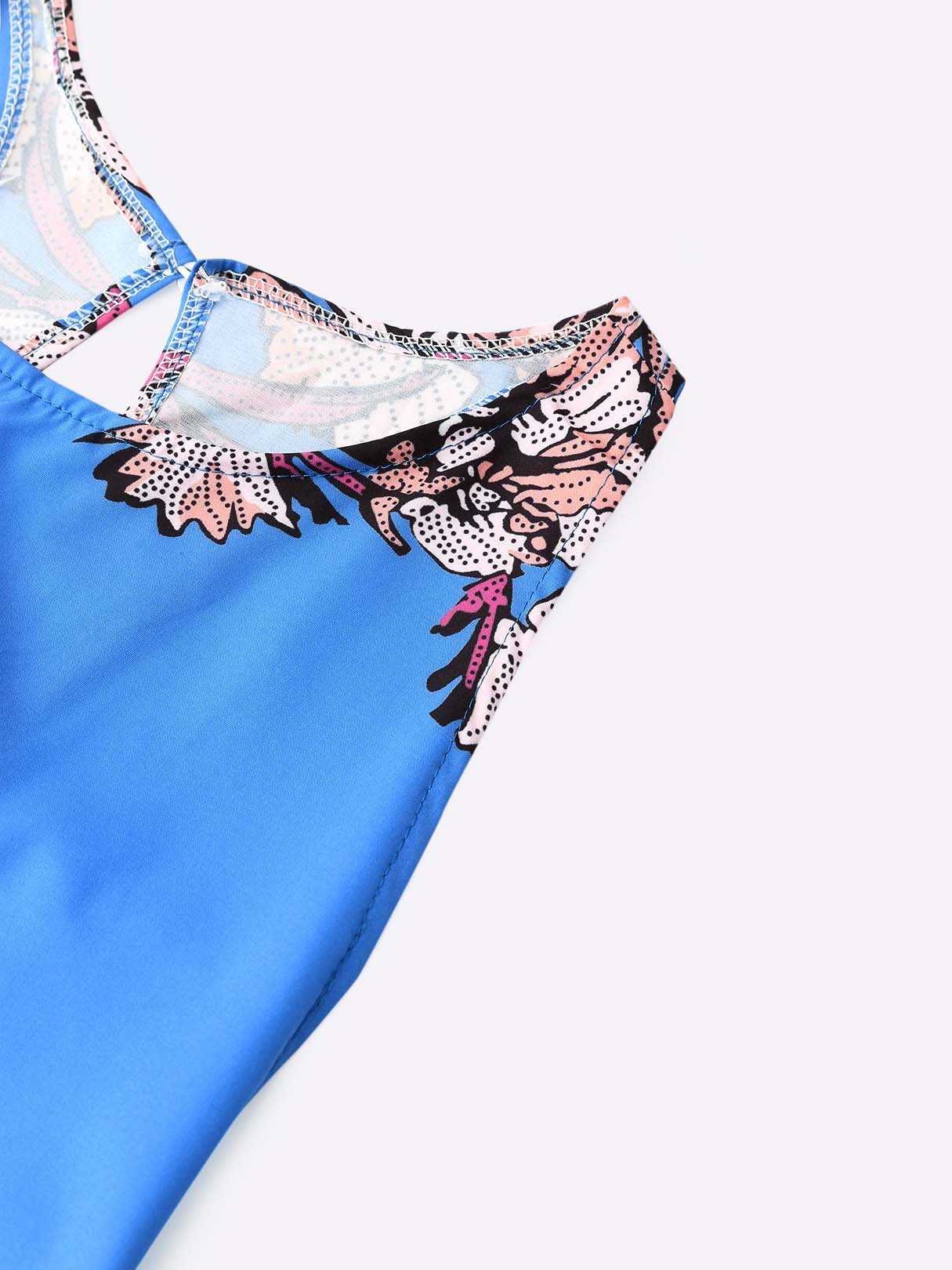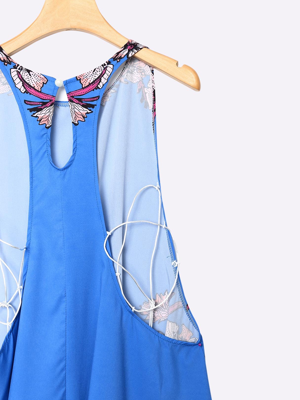 Blue Round Neck Sleeveless Floral Print Curved Hem Dresses