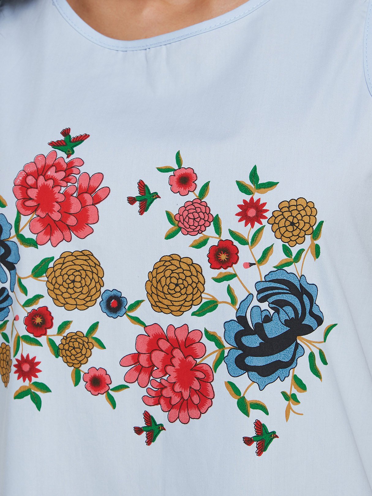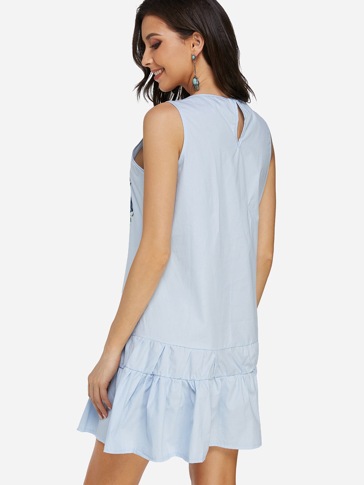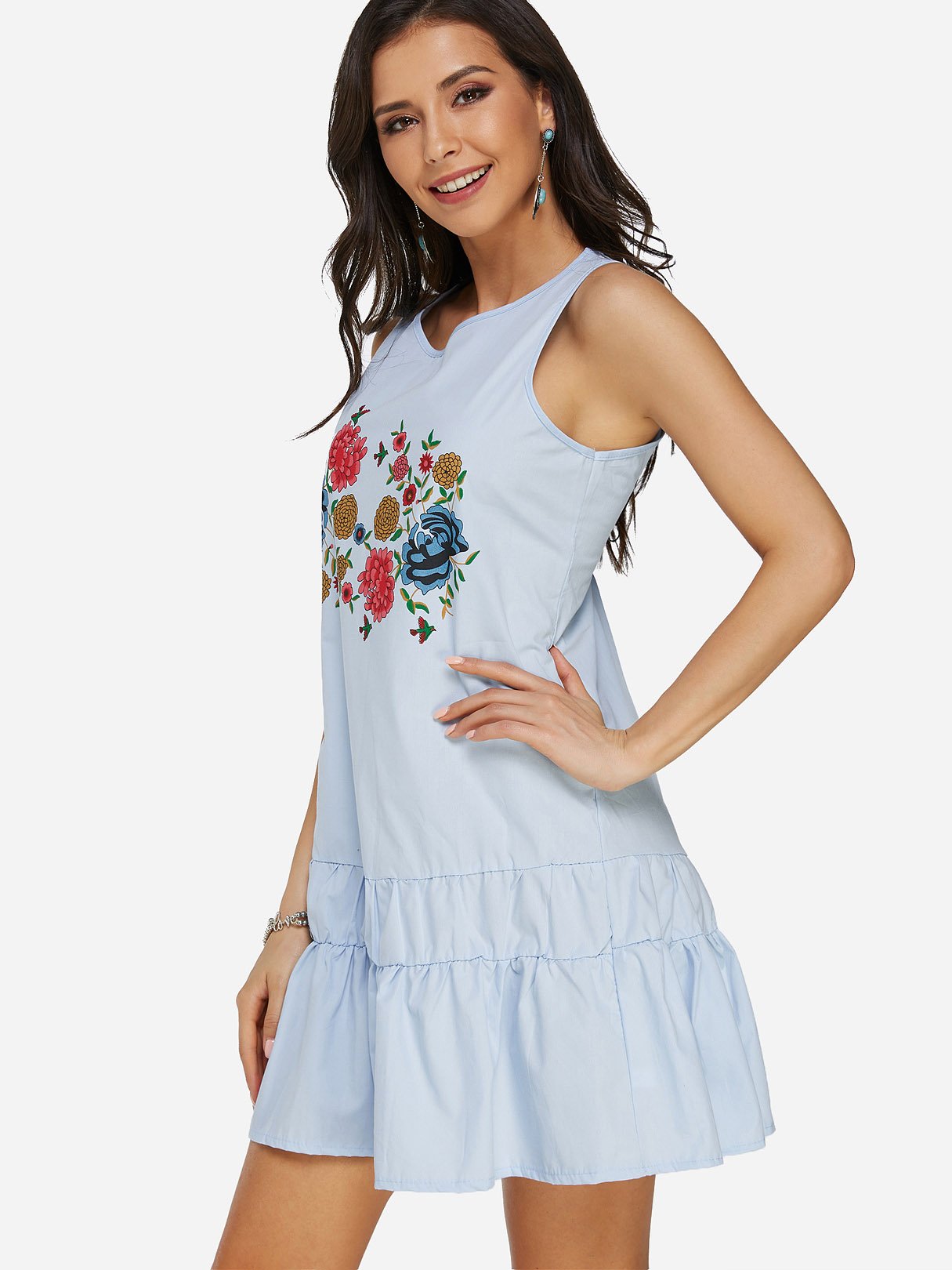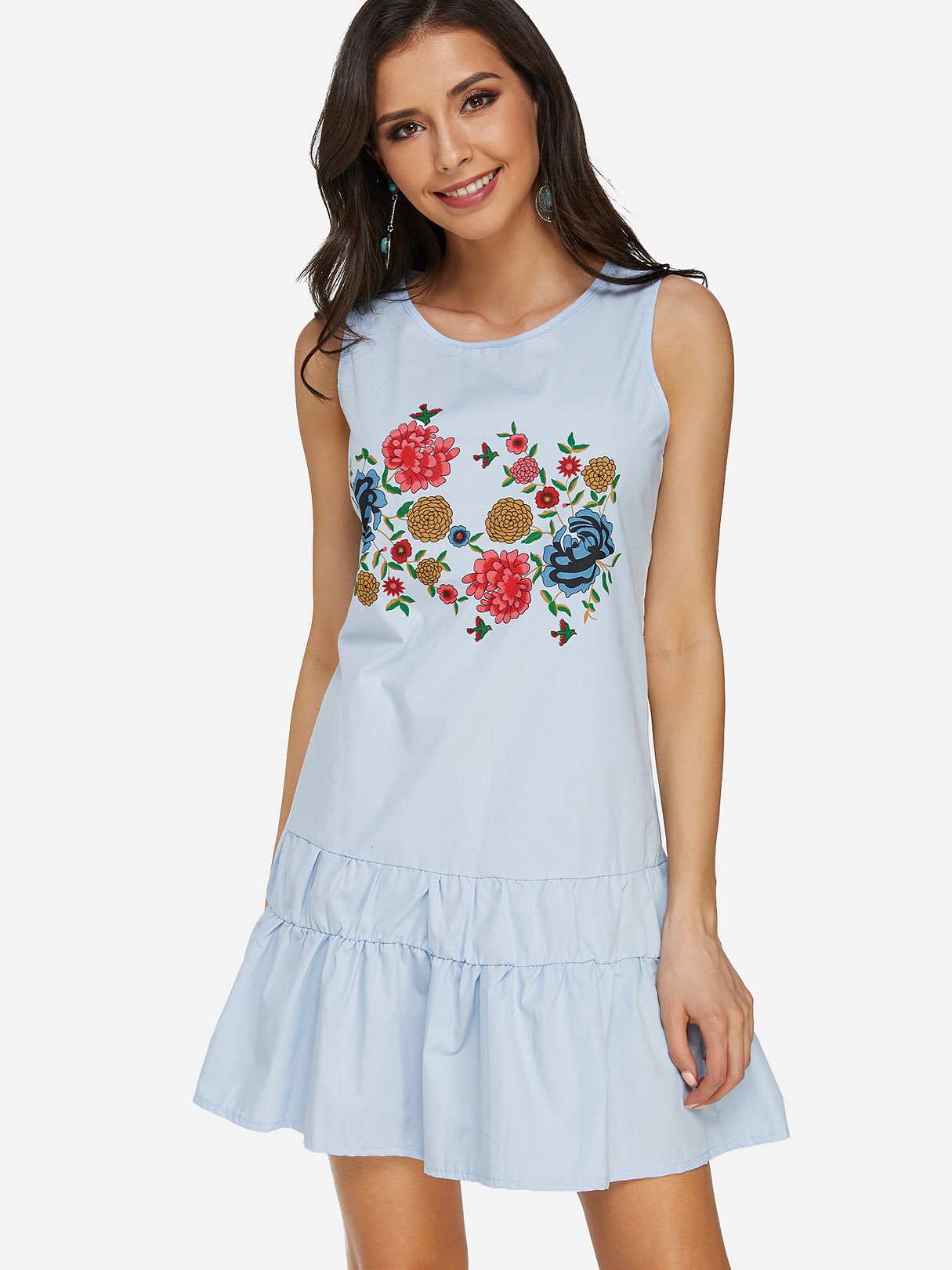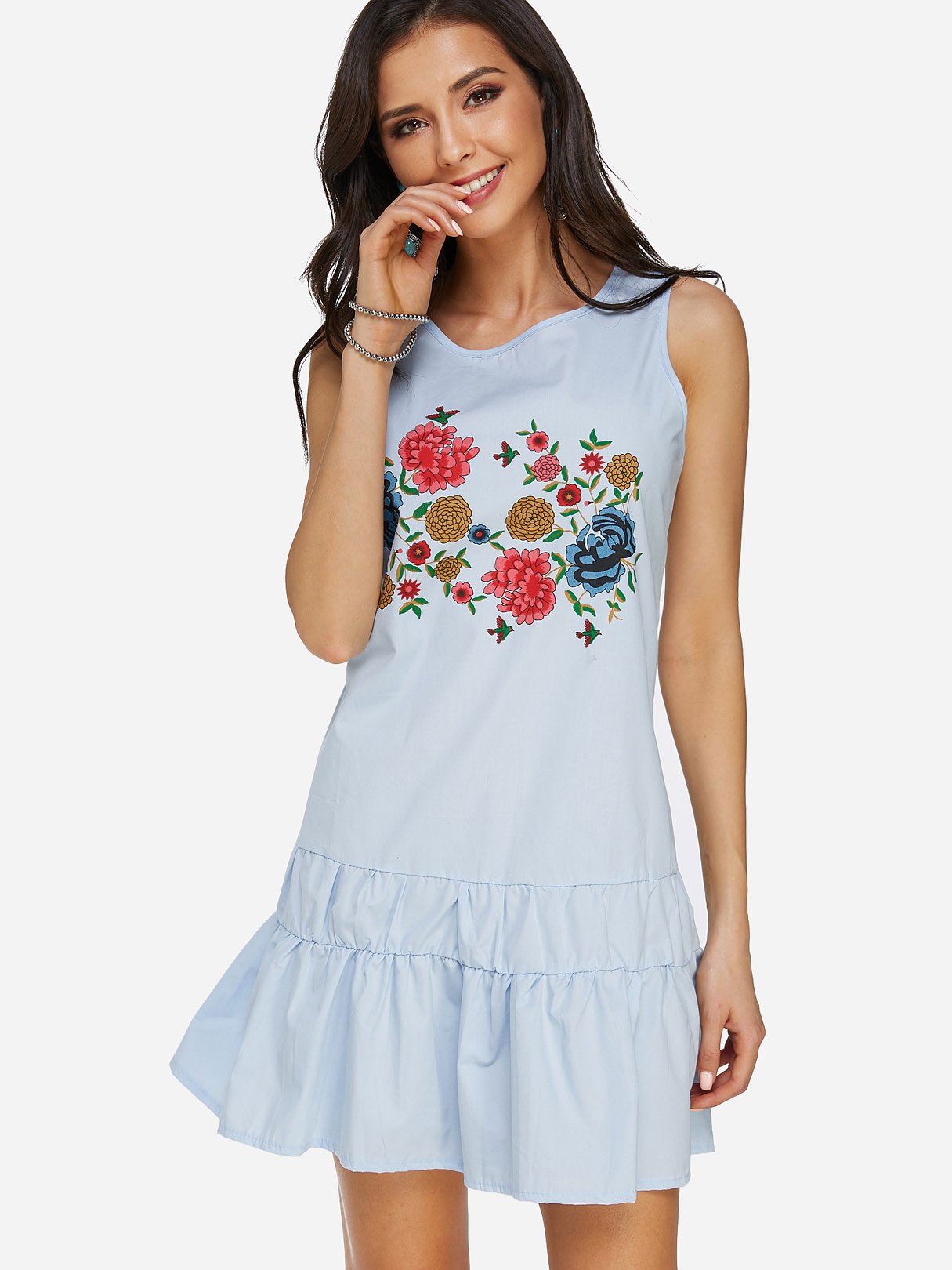 Blue Round Neck Sleeveless Floral Print Ruffle Hem Dresses