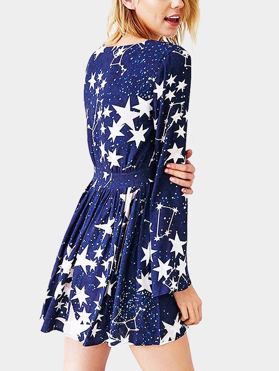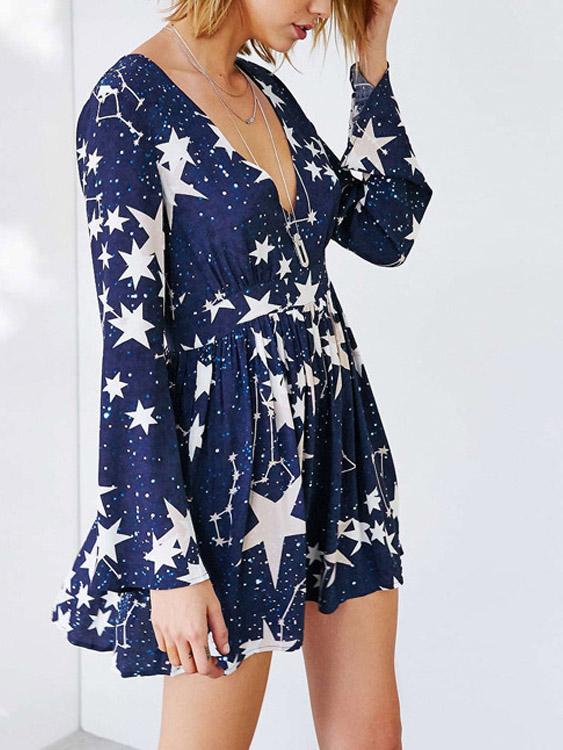 Material:PolyesterNeckline:V-NeckSeason:Spring,Summer,AutumnSleeves:Long SleevesPattern:StarWaist Design:Tight WaistType:SkaterLength:MiniFit:Regular Fit