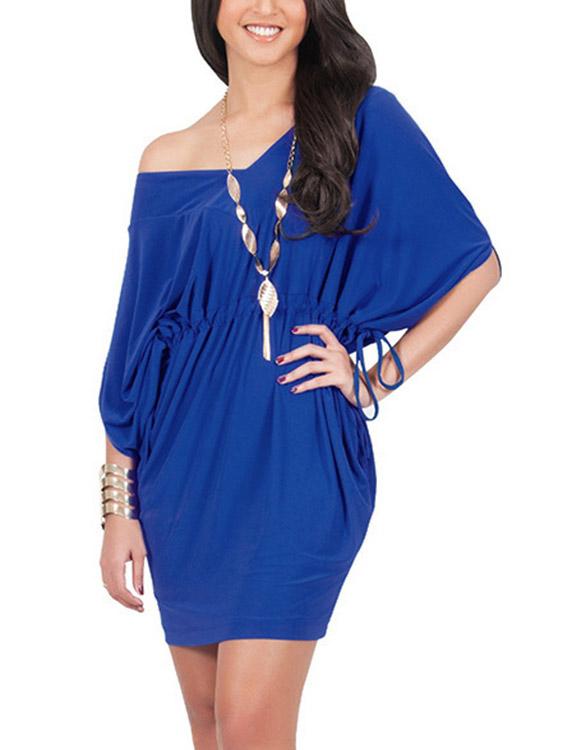 Blue V-Neck One Shoulder Half Sleeve Plain Bodycon Dresses