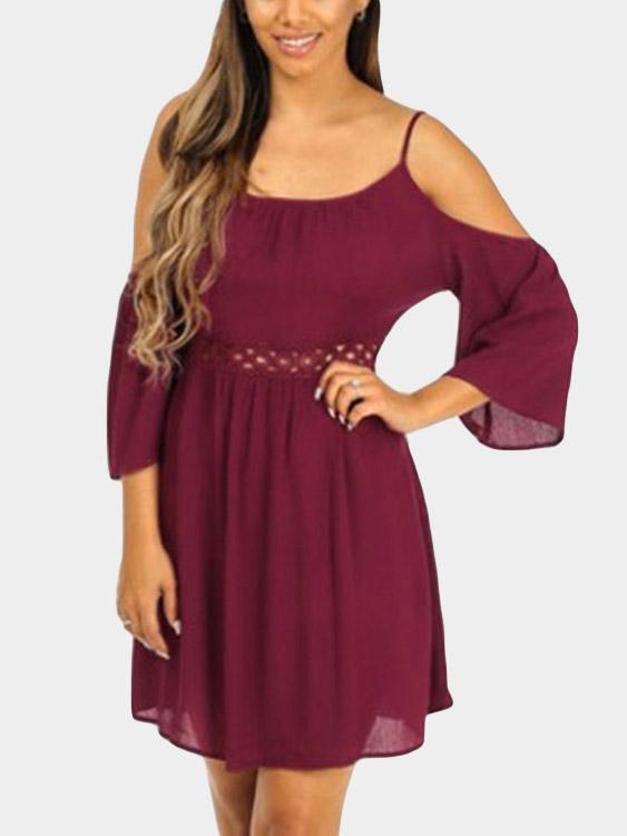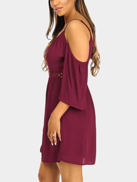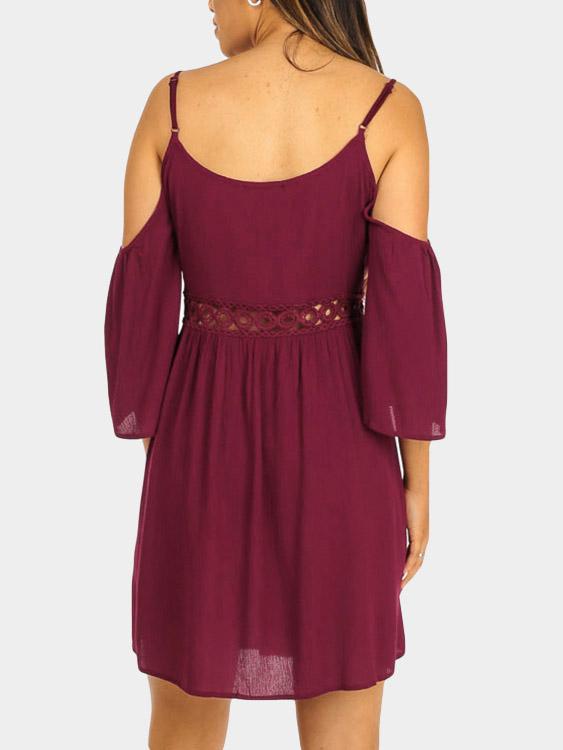 Burgundy Cold Shoulder 3/4 Length Sleeve Plain Backless Hollow Spaghetti Strap Mini Dress