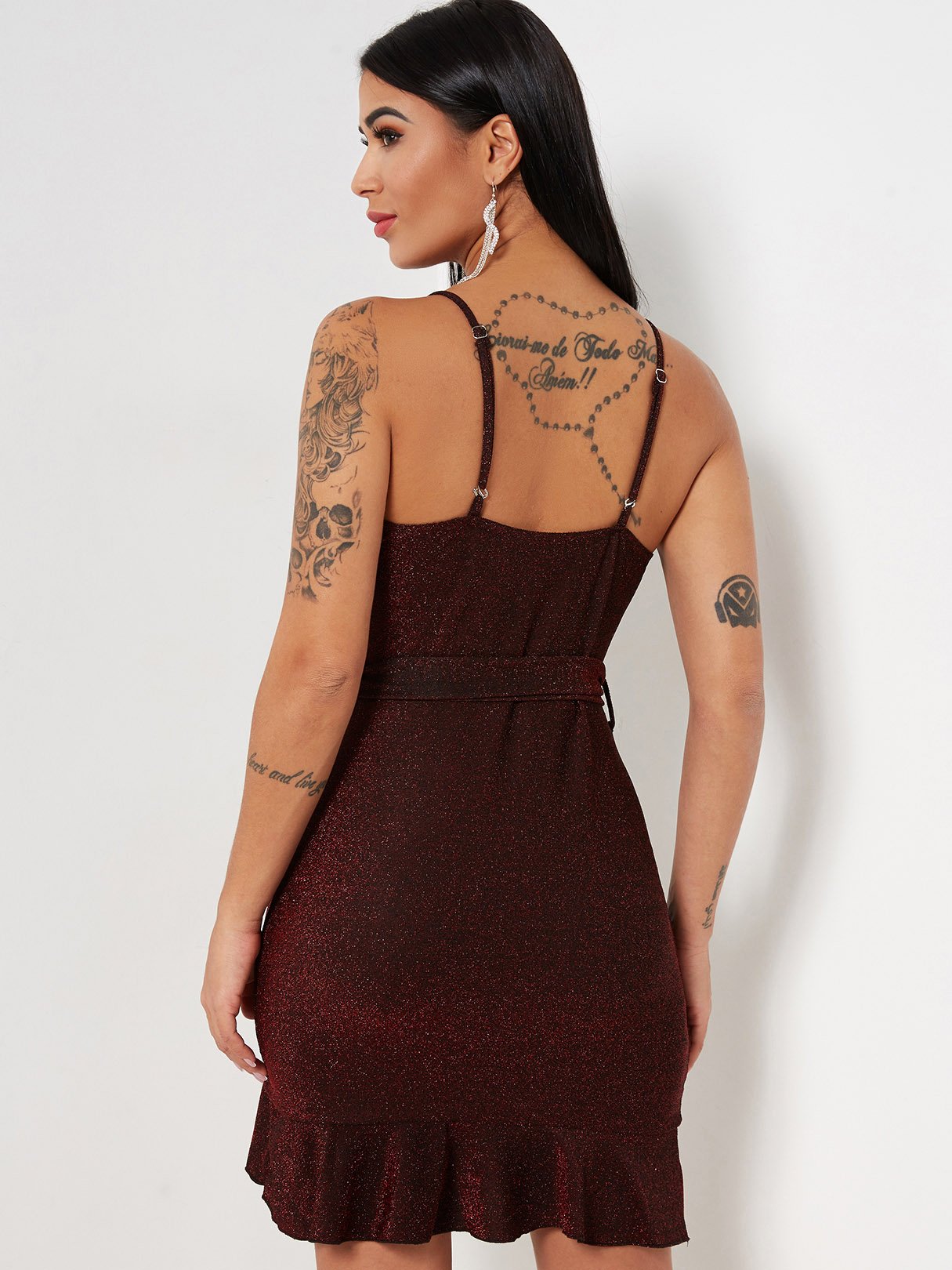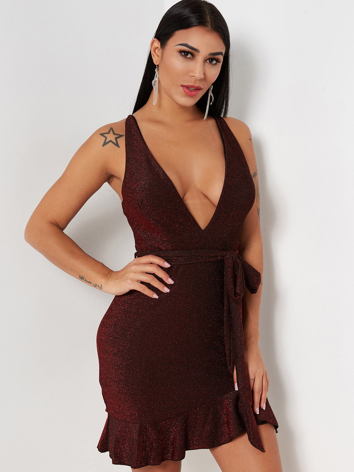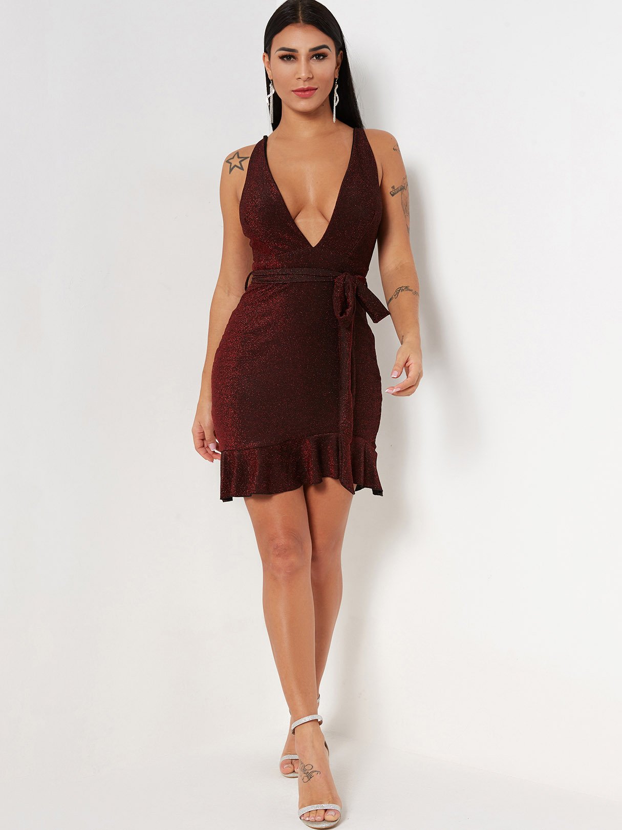 Burgundy Deep V Neck Sleeveless Plain Sequins Embellished Self-Tie Flounced Hem Dresses