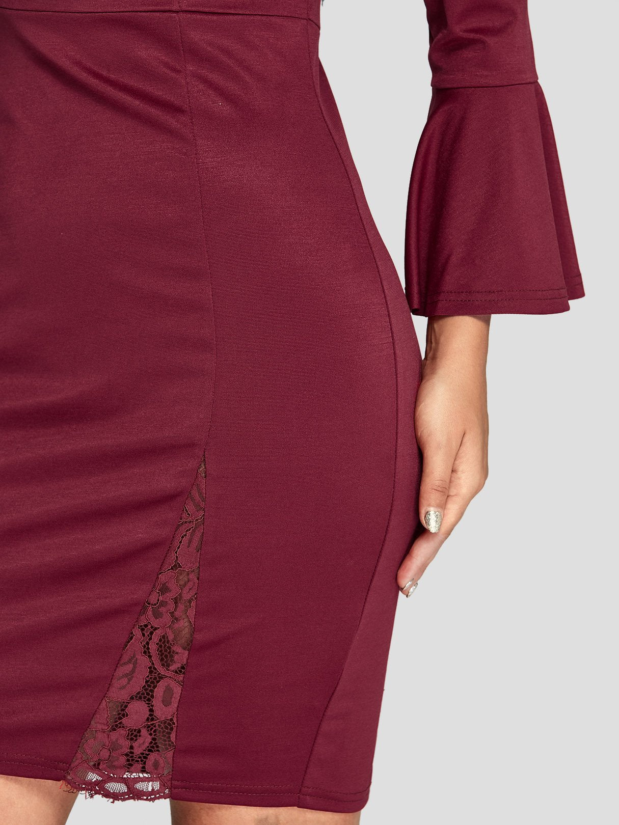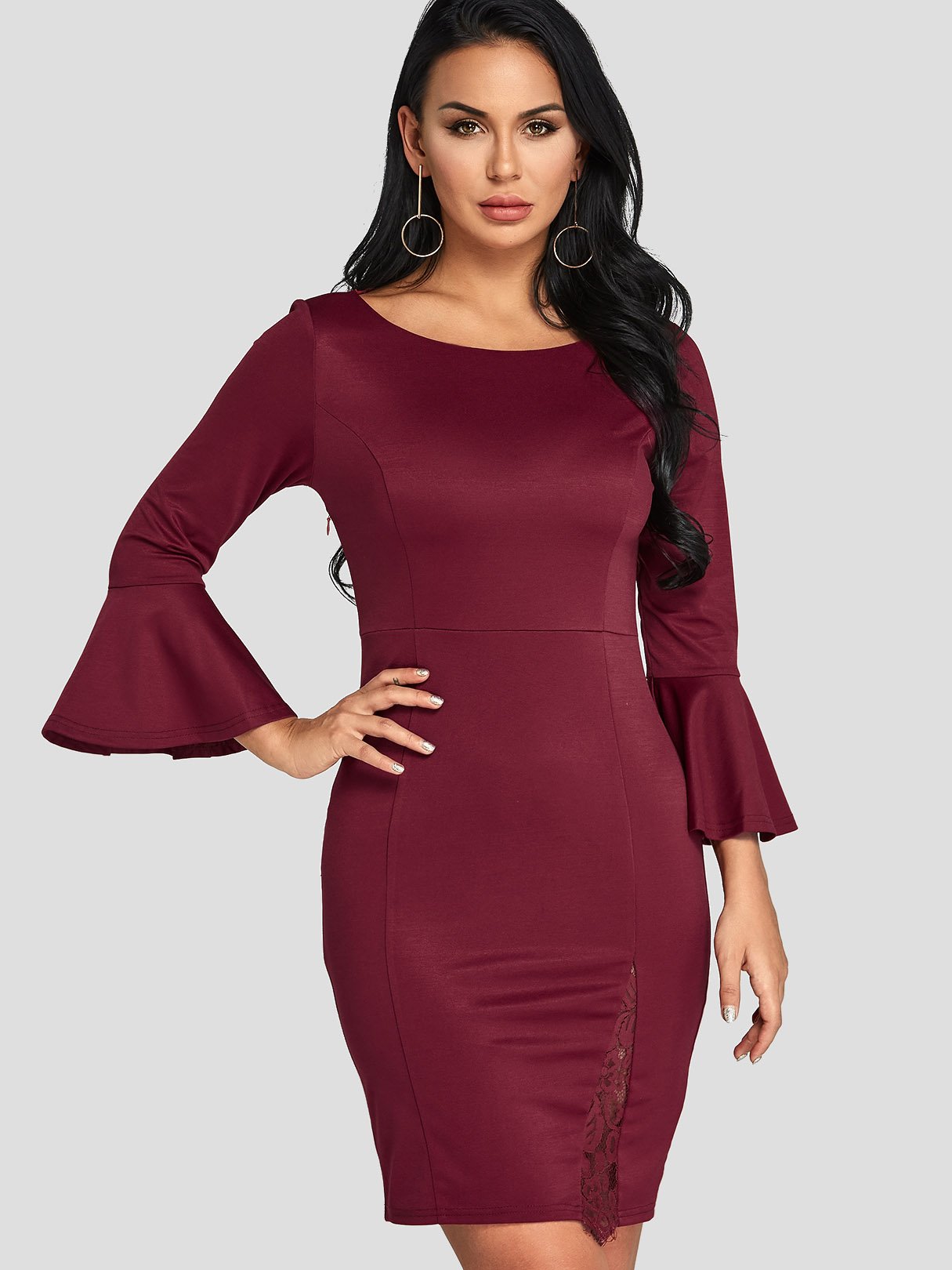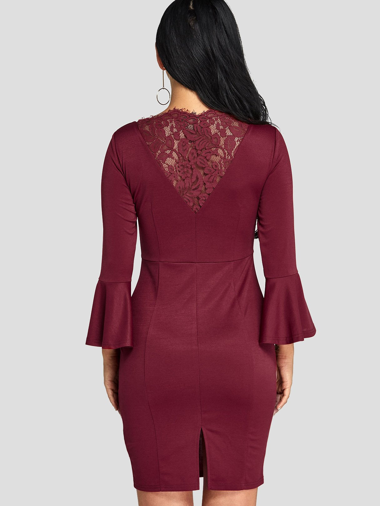 Burgundy Round Neck 3/4 Sleeve Length Plain Crochet Lace Embellished Hollow See Through Slit Hem Sexy Dresses