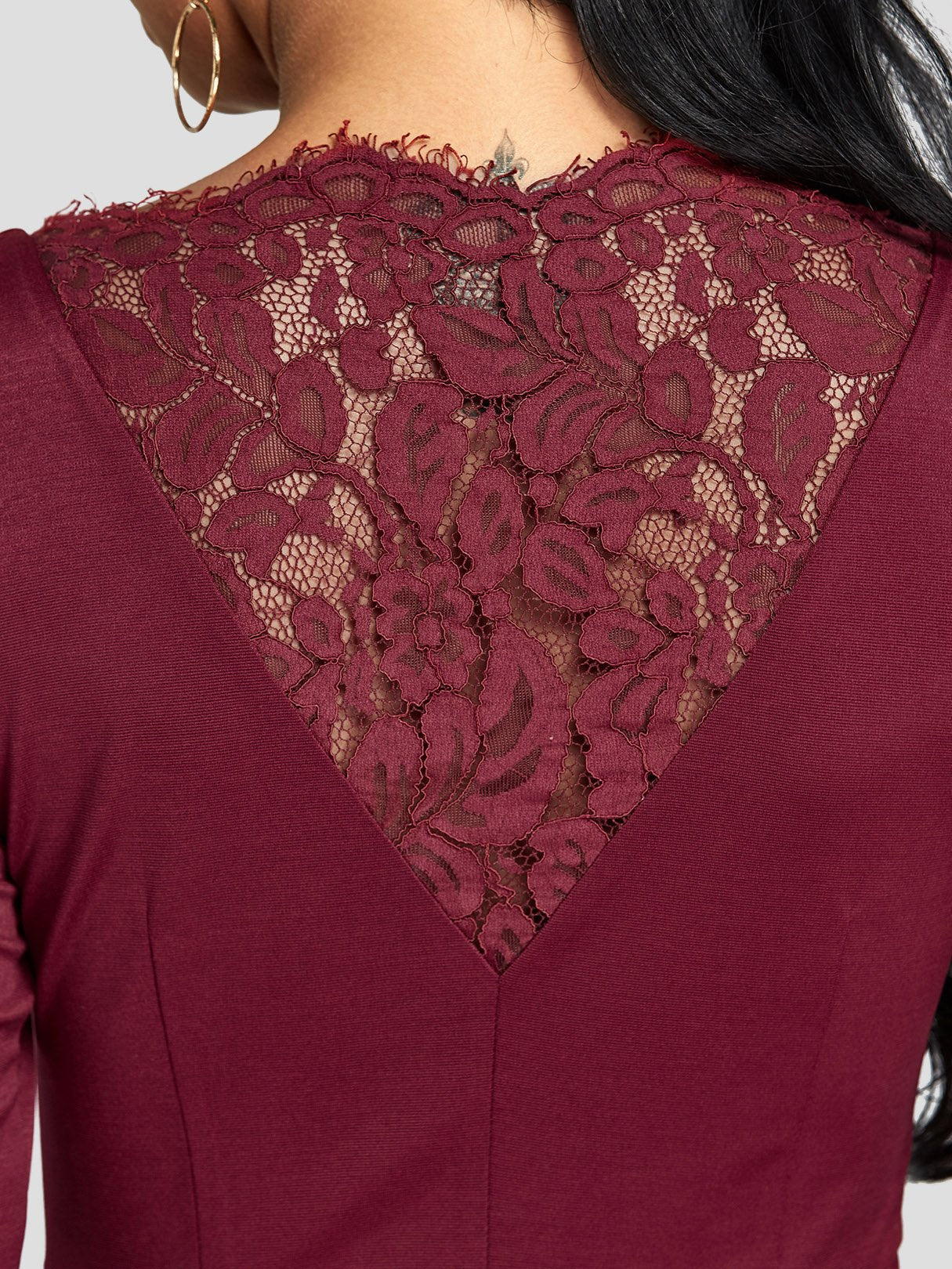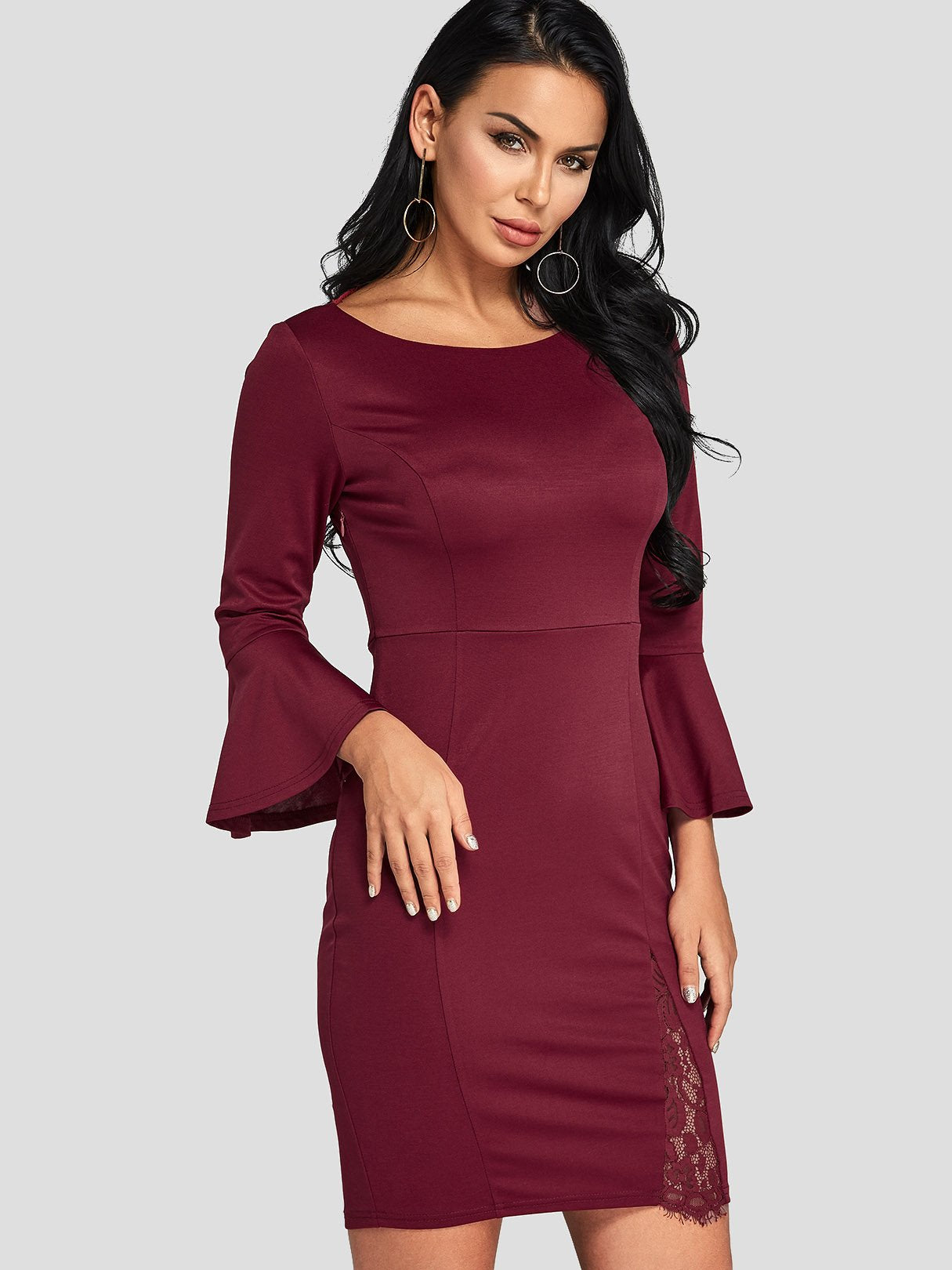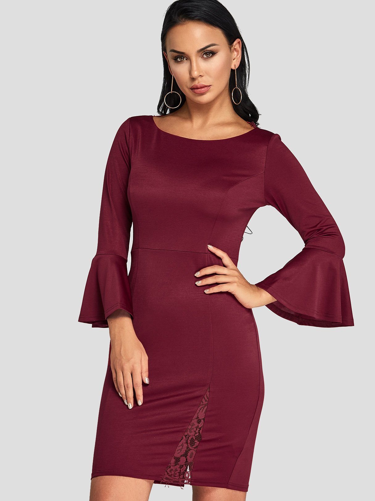 Burgundy Round Neck 3/4 Sleeve Length Plain Crochet Lace Embellished Hollow See Through Slit Hem Sexy Dresses