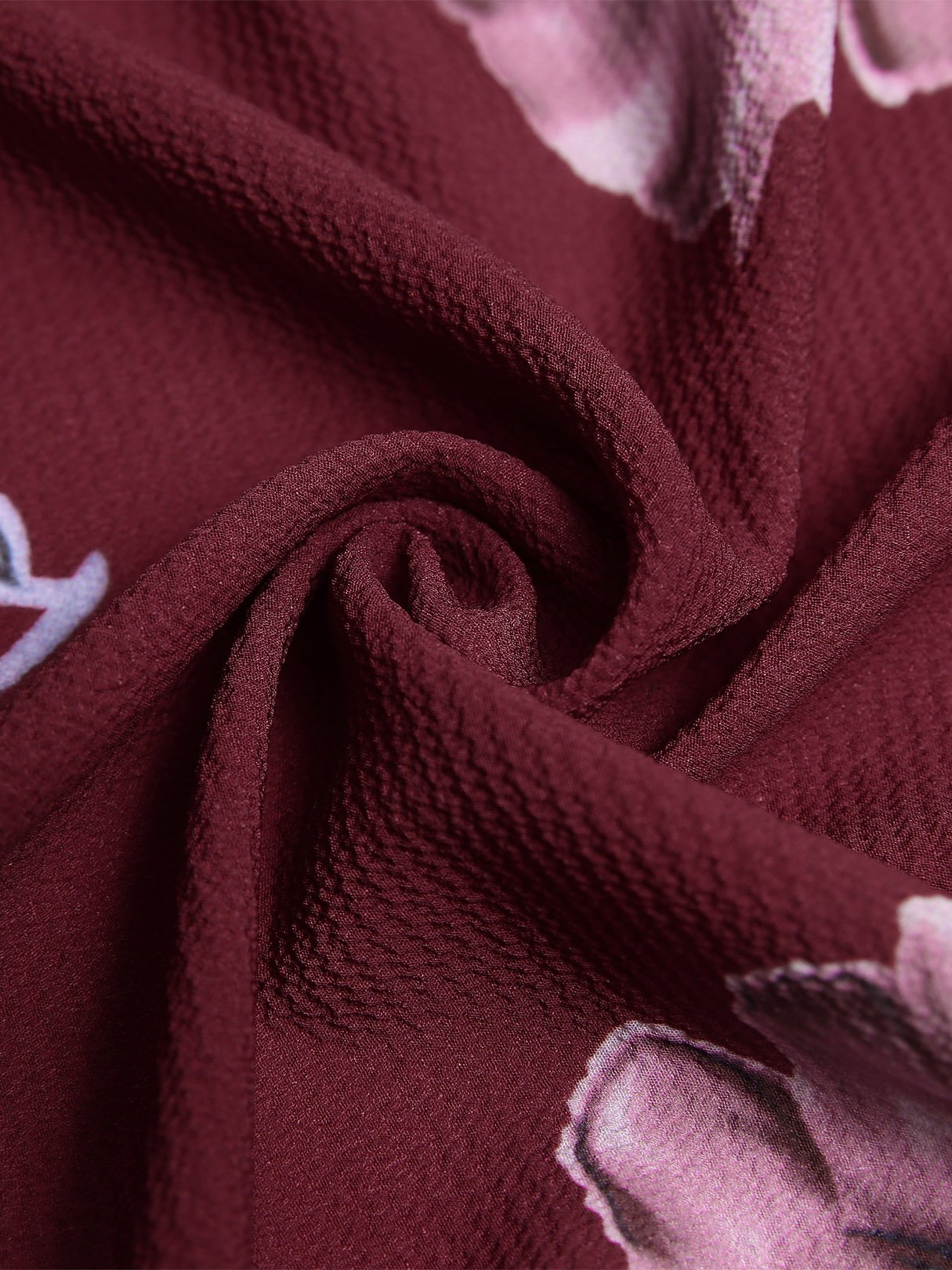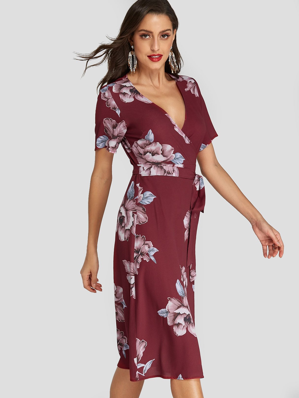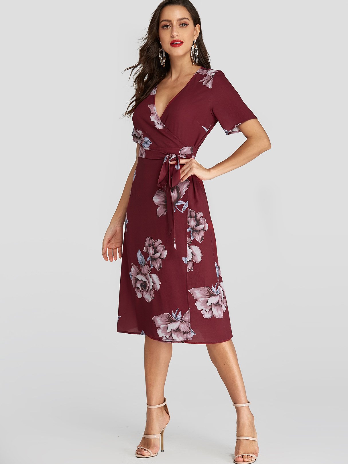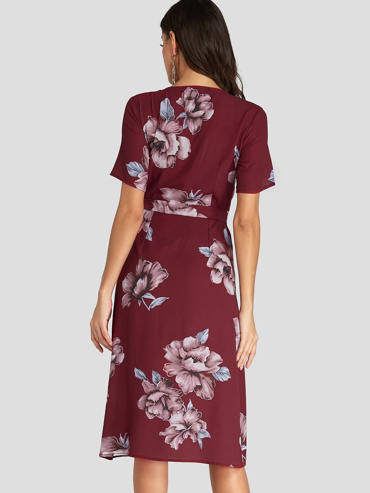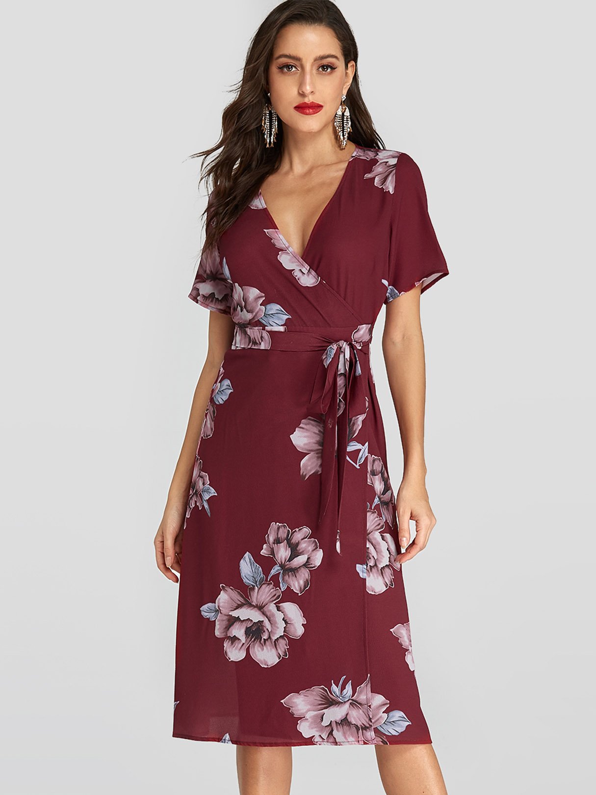 Burgundy V-Neck Short Sleeve Floral Print Crossed Front Belt Wrap Dresses