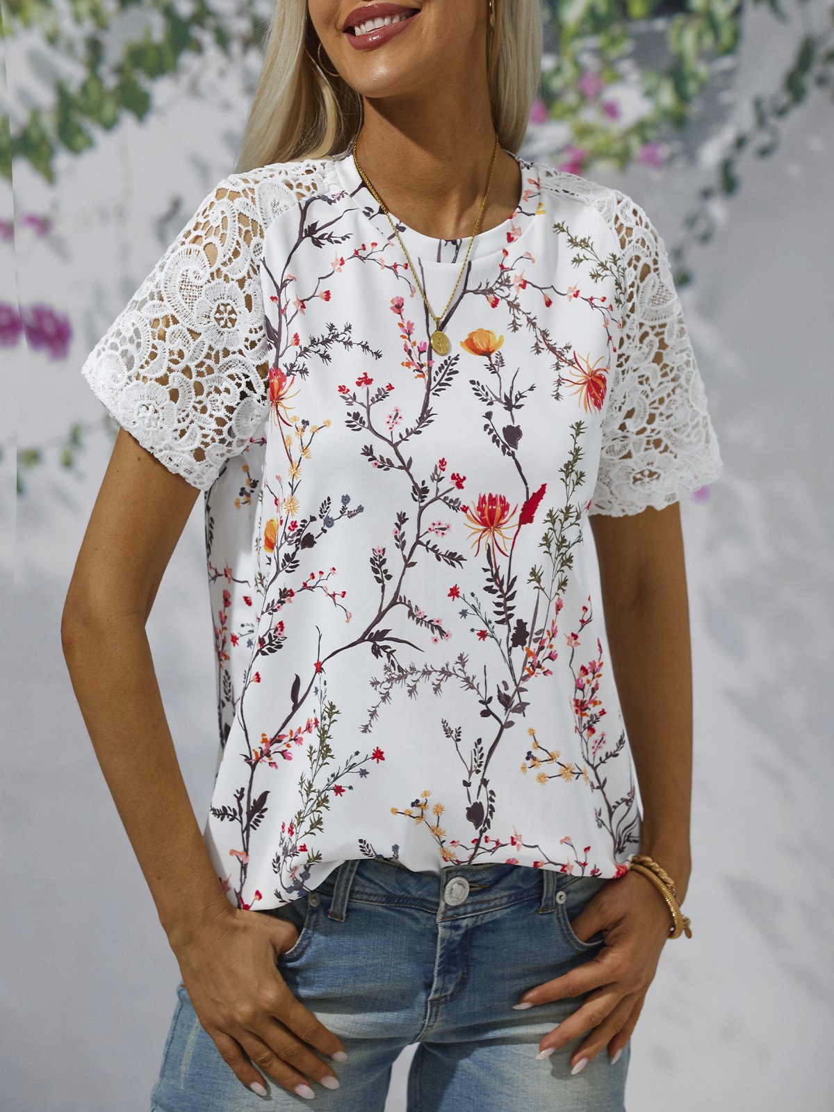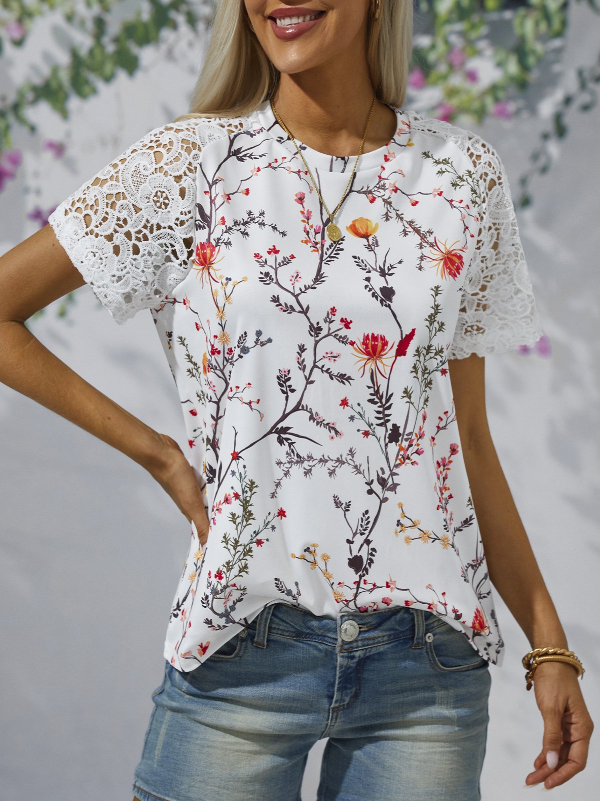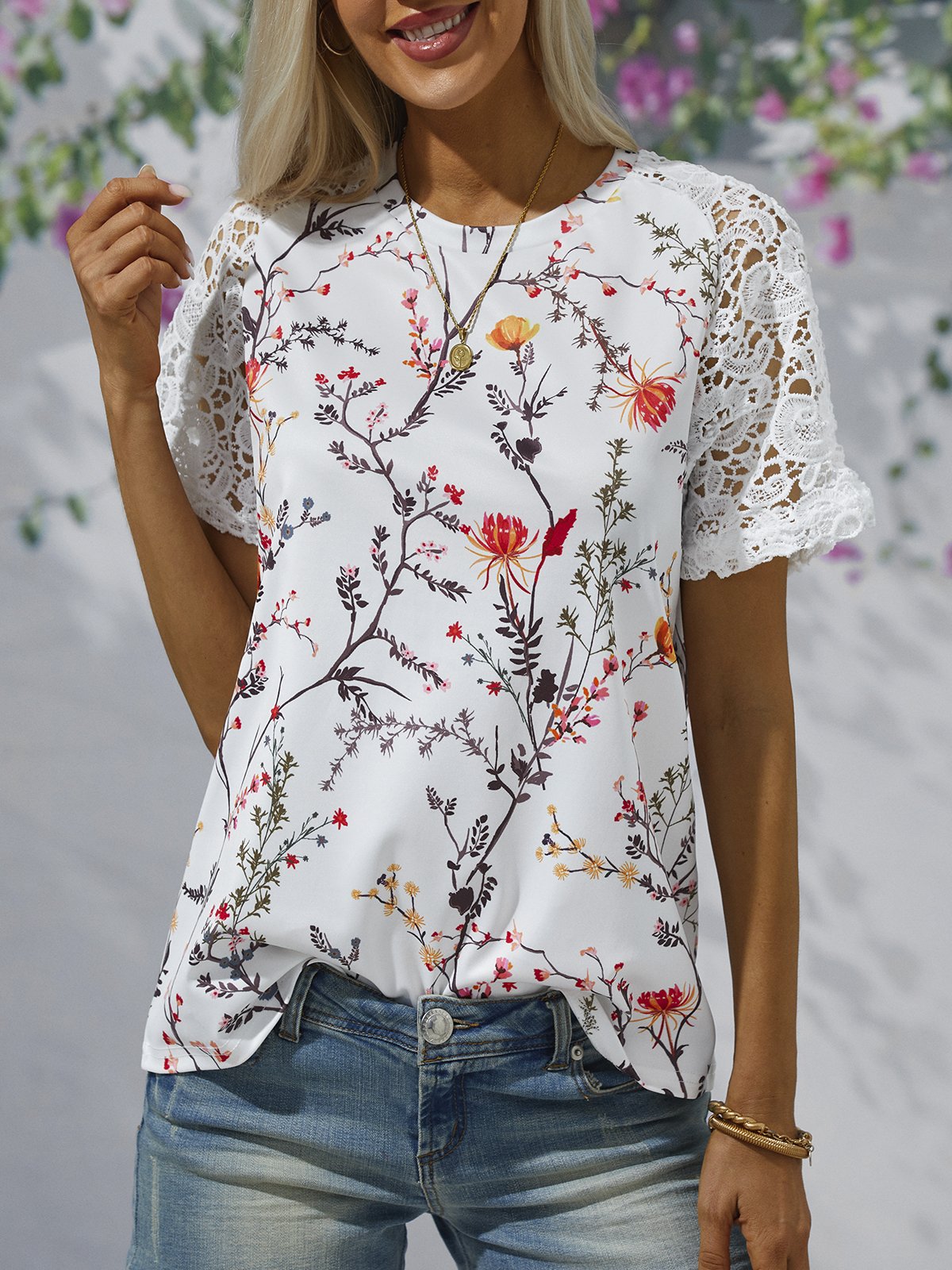 Casual Short Sleeve Crew Neck Floral Fashion Regular Blouses - White / S is backordered and will ship as soon as it is back in stock.
