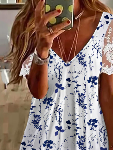 Casual V Neck Short Sleeve Floral Fashion Mid-Long Blouses - Blue / S is backordered and will ship as soon as it is back in stock.