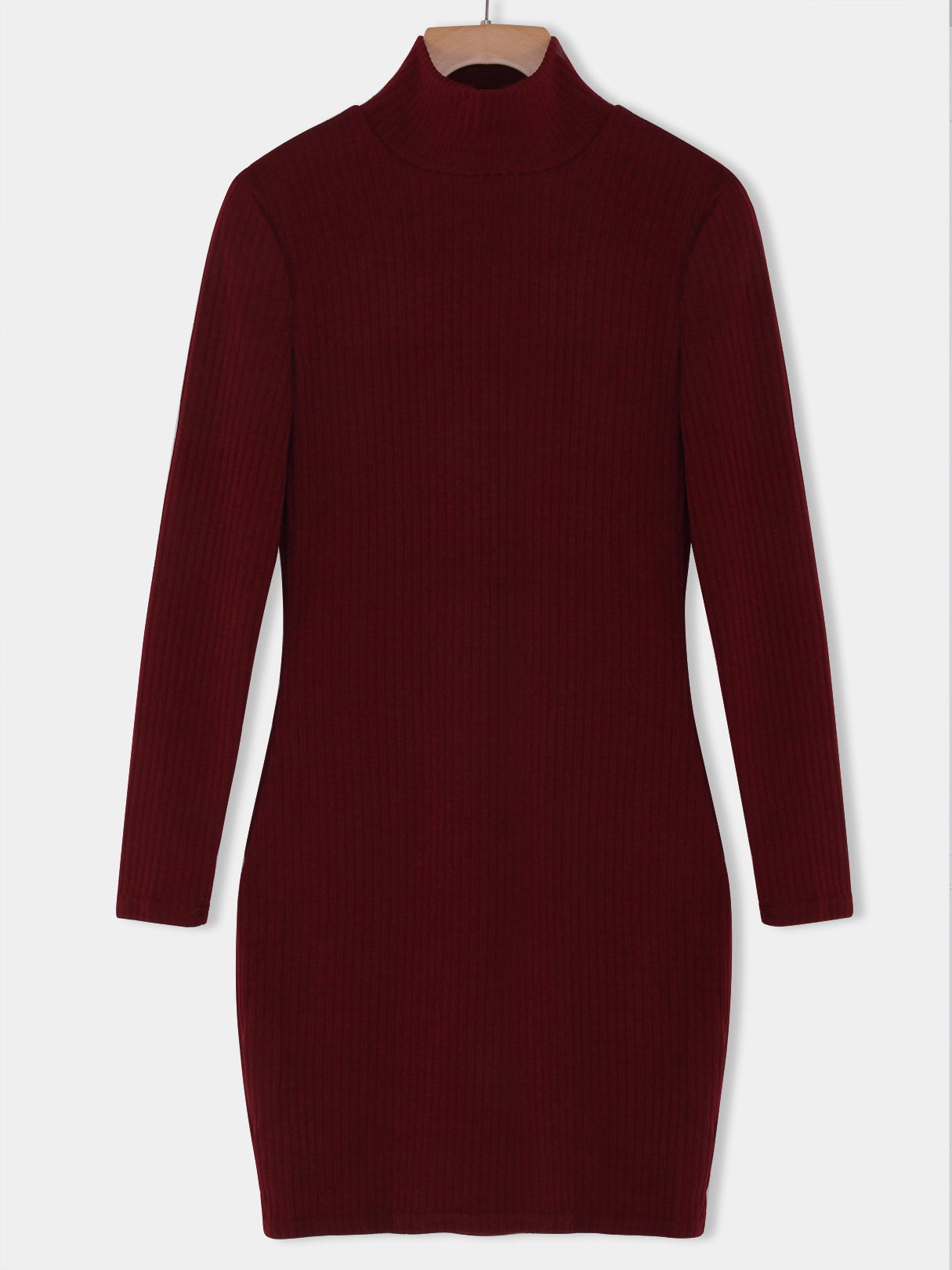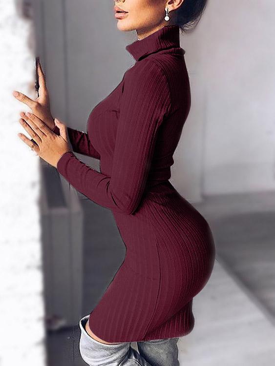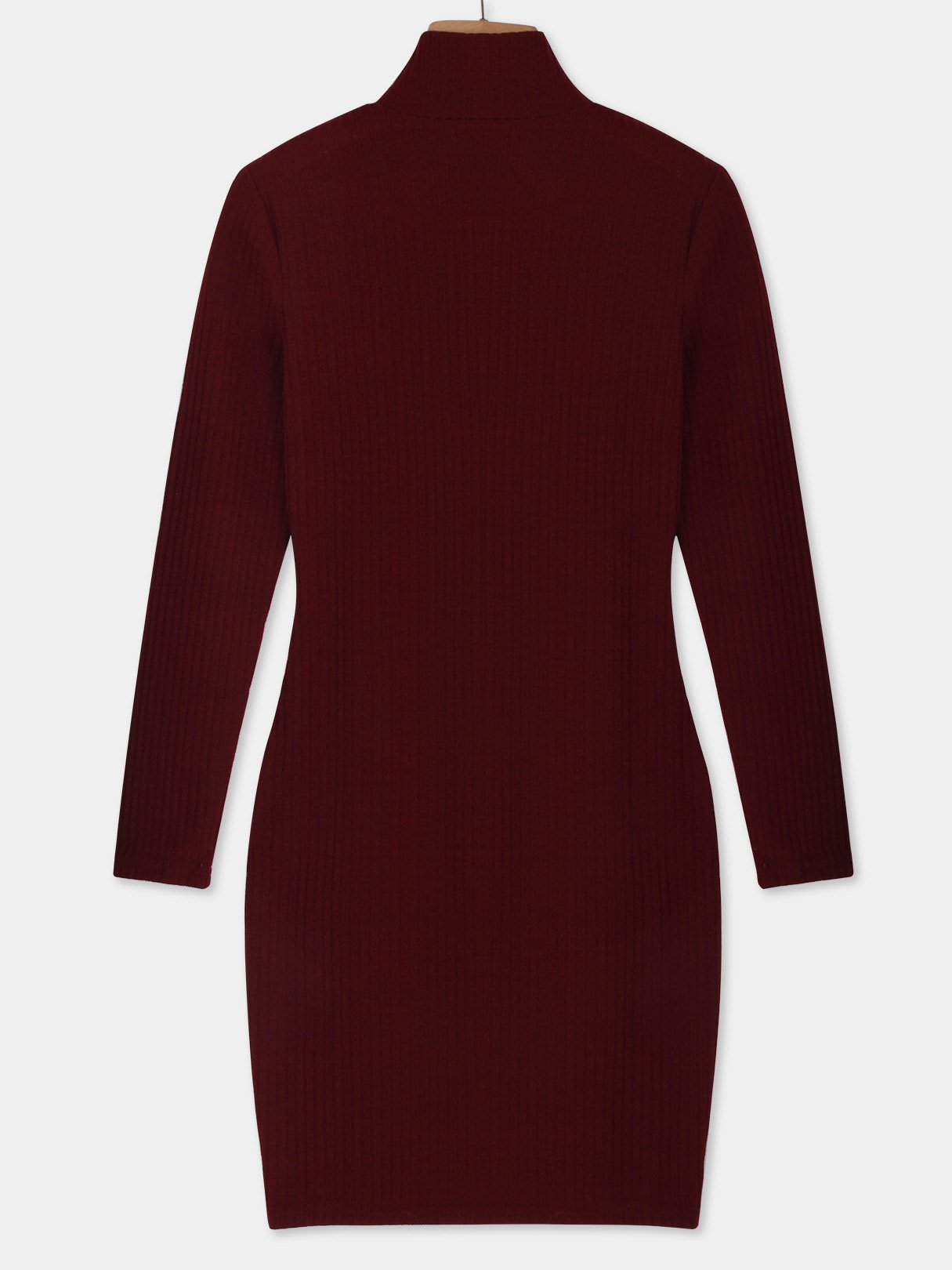 Chimney Collar Plain Long Sleeve Bodycon Hem Burgundy Dresses