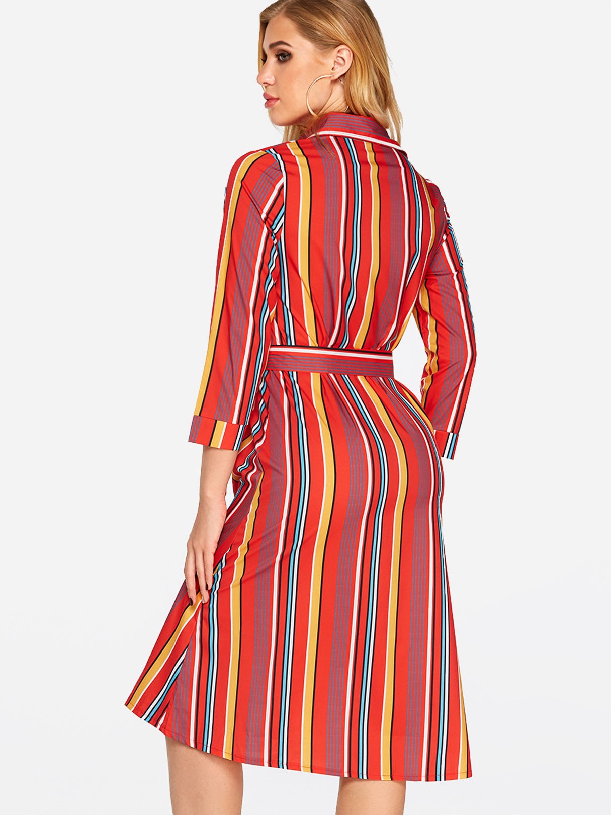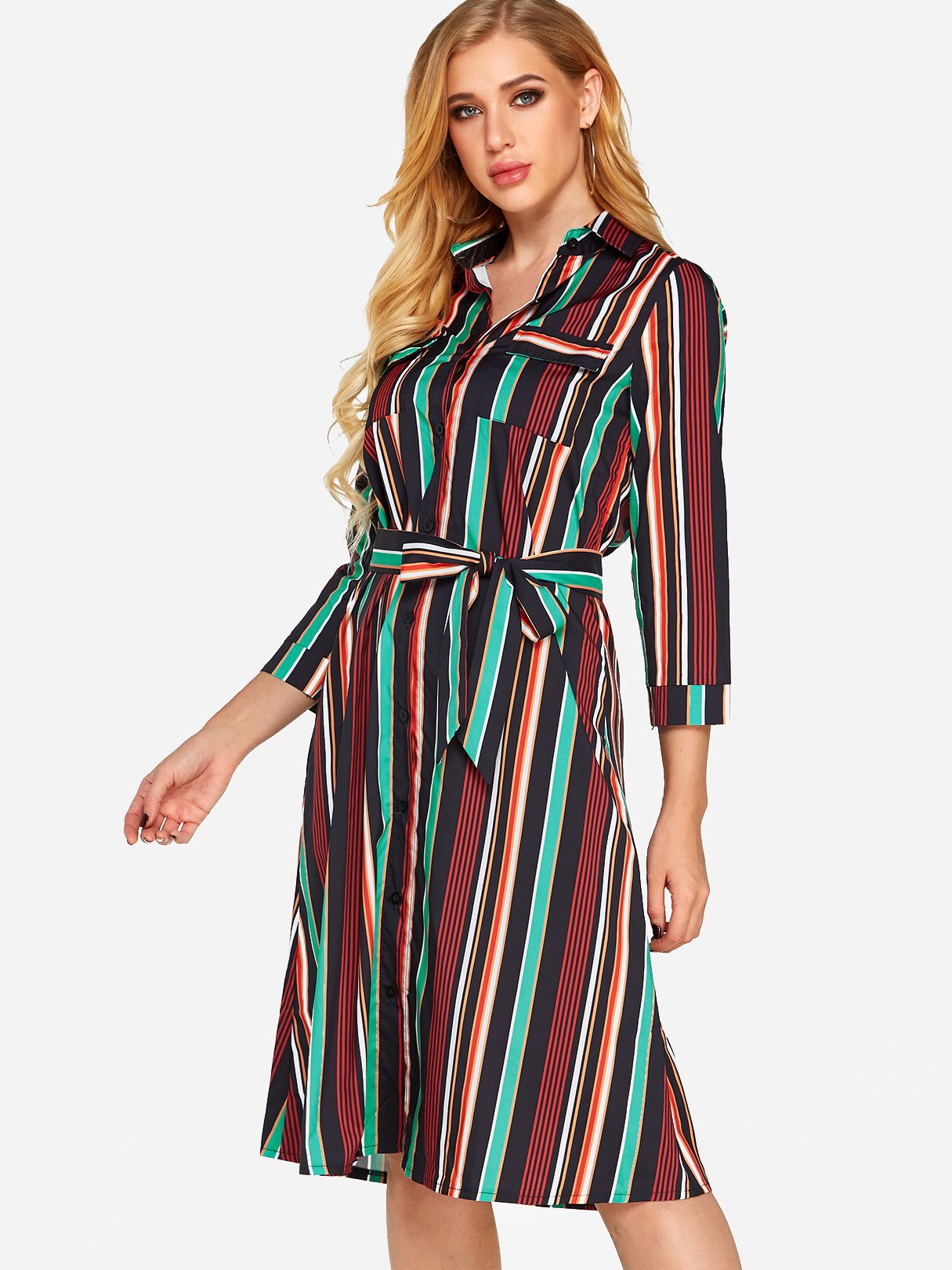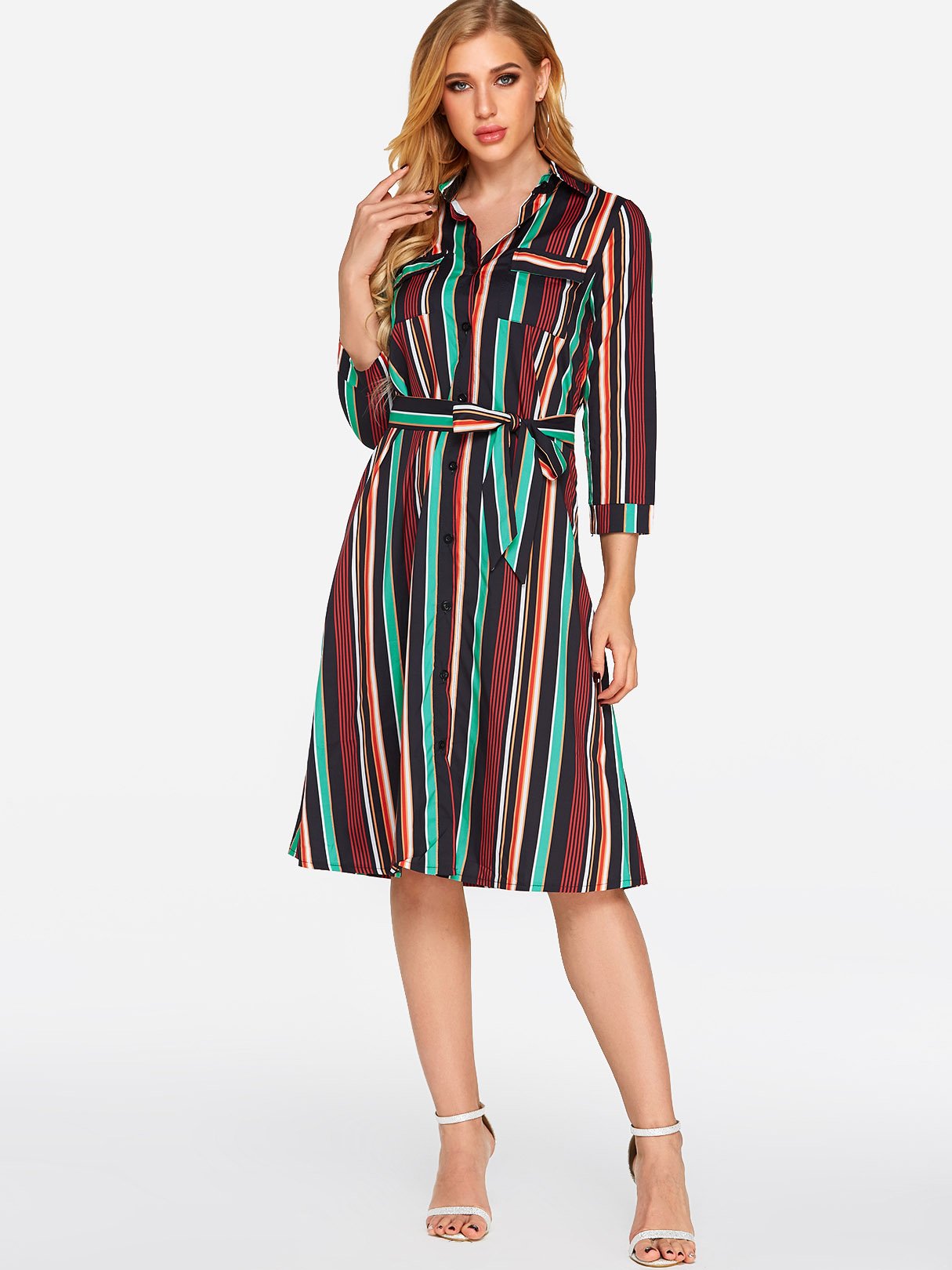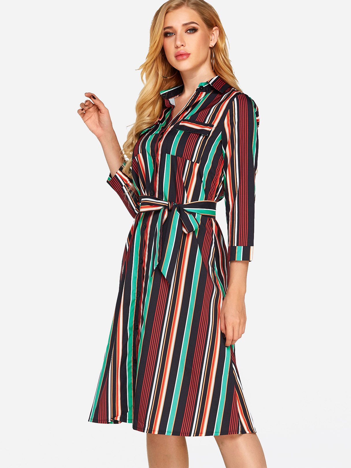 Classic Collar 3/4 Length Sleeve Printed Belt Sexy Dress