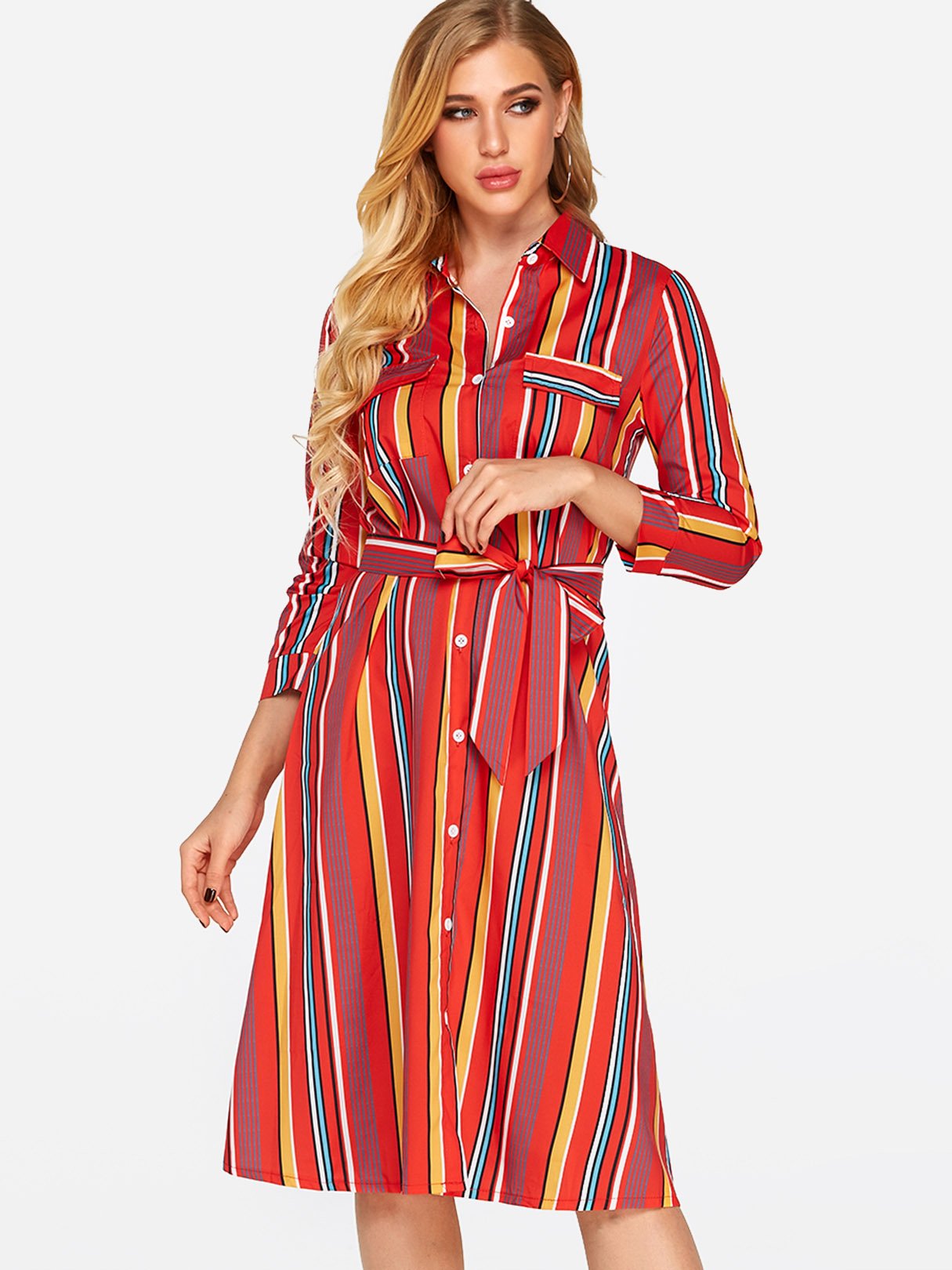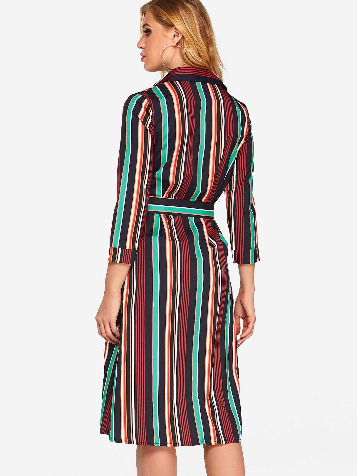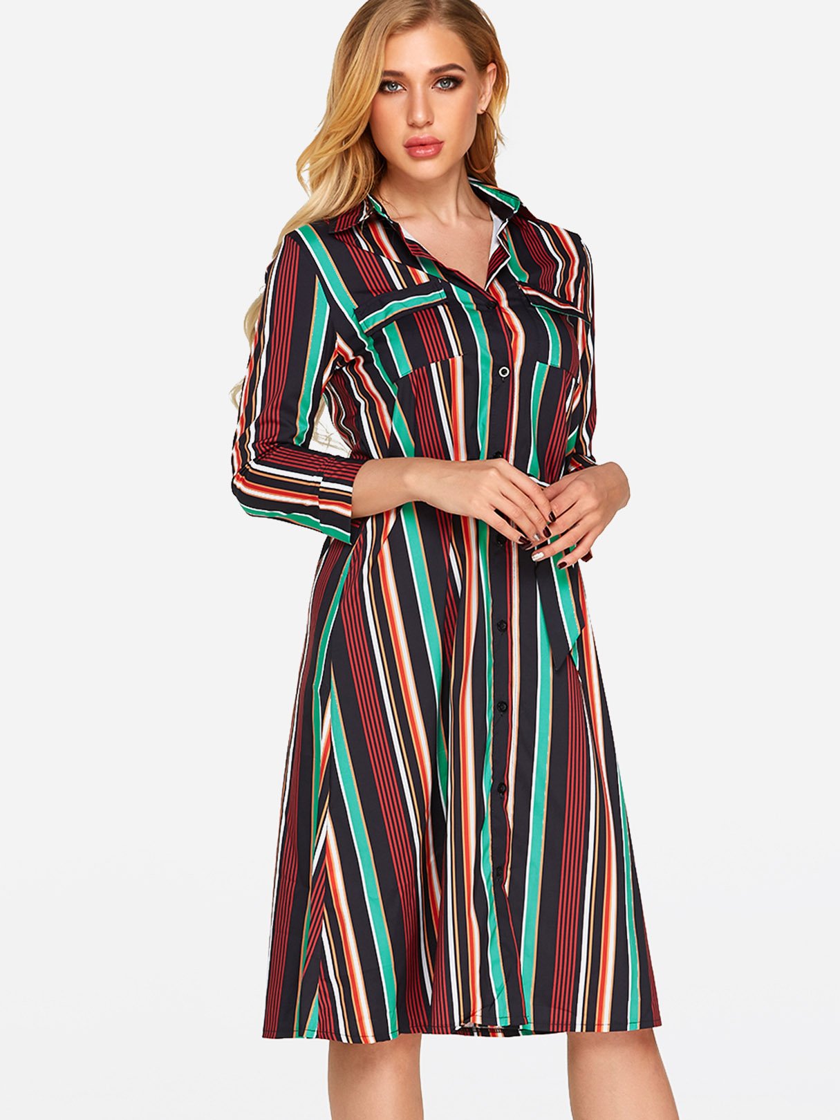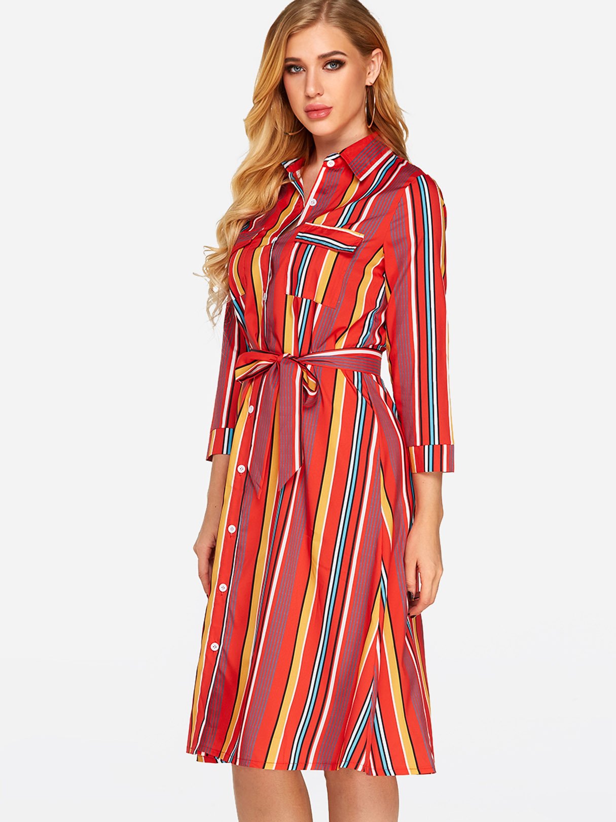 Classic Collar 3/4 Length Sleeve Printed Belt Sexy Dress