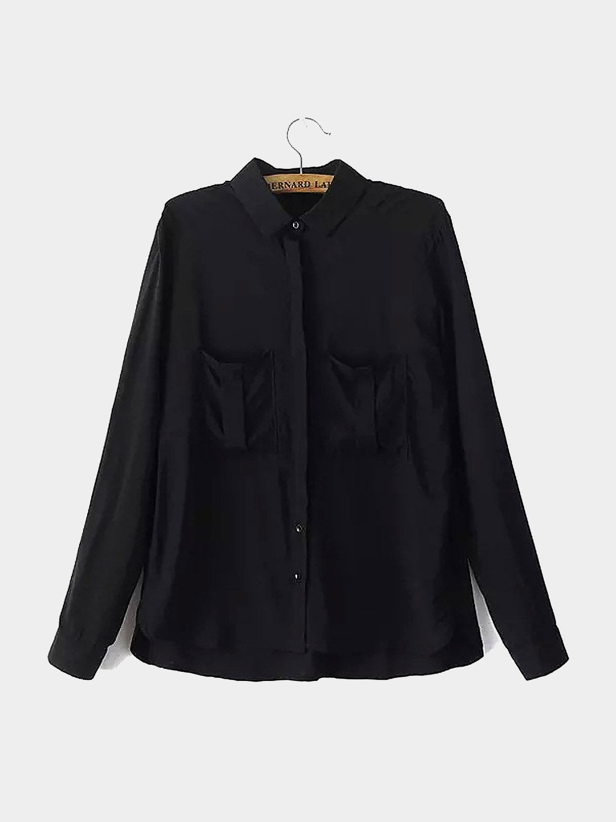Classic Collar Two Large Pockets Long Sleeve Curved Hem Black Blouses