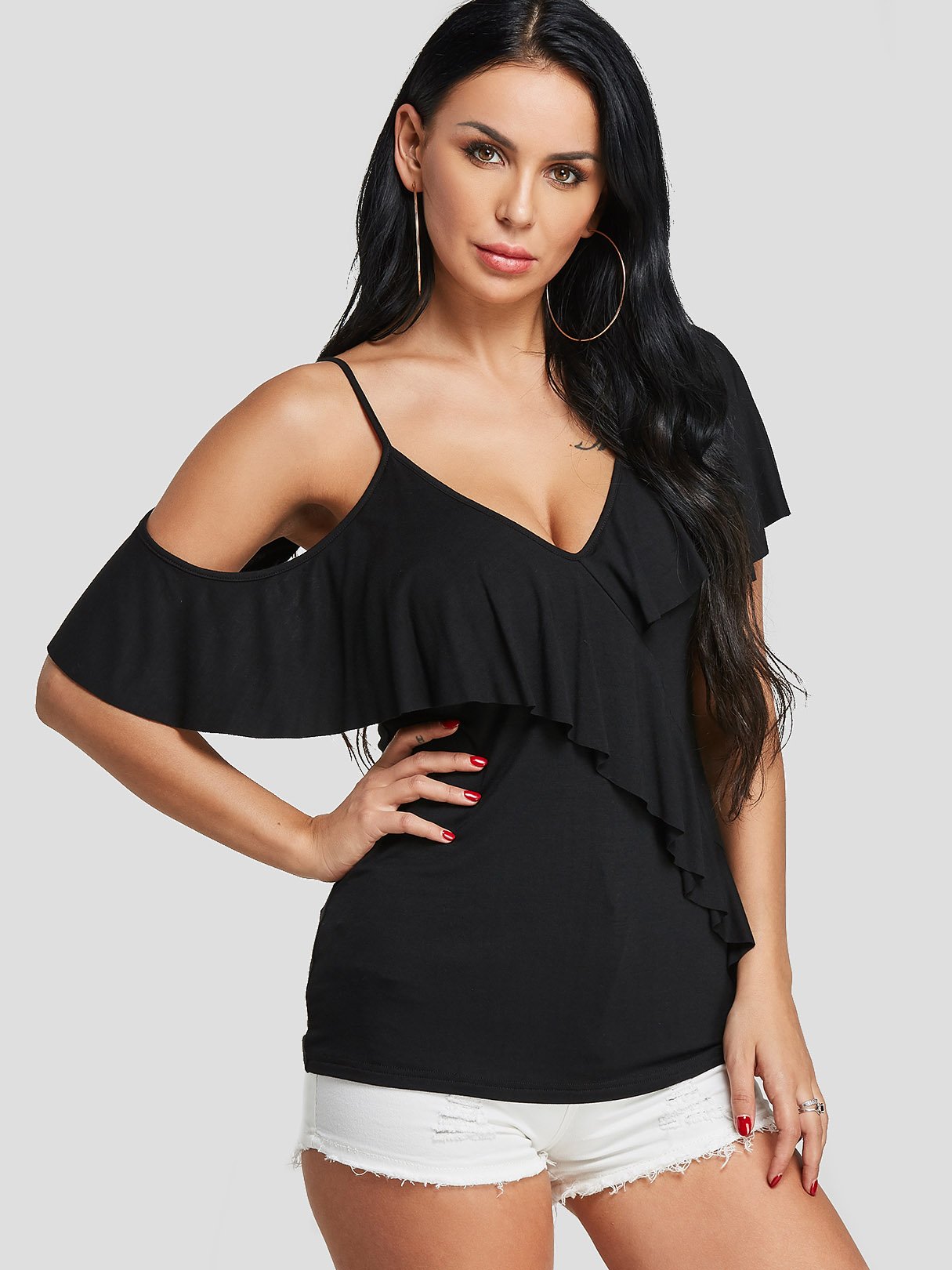 Cold Shoulder Deep V Neck Plain Spaghetti Strap Short Sleeve Black Blouses
