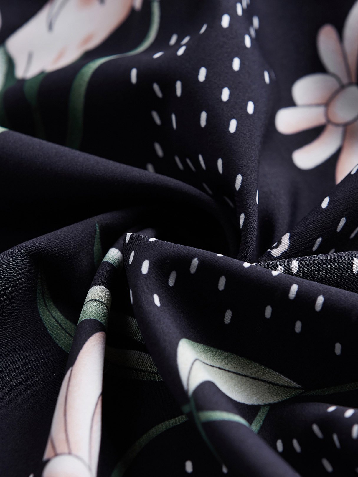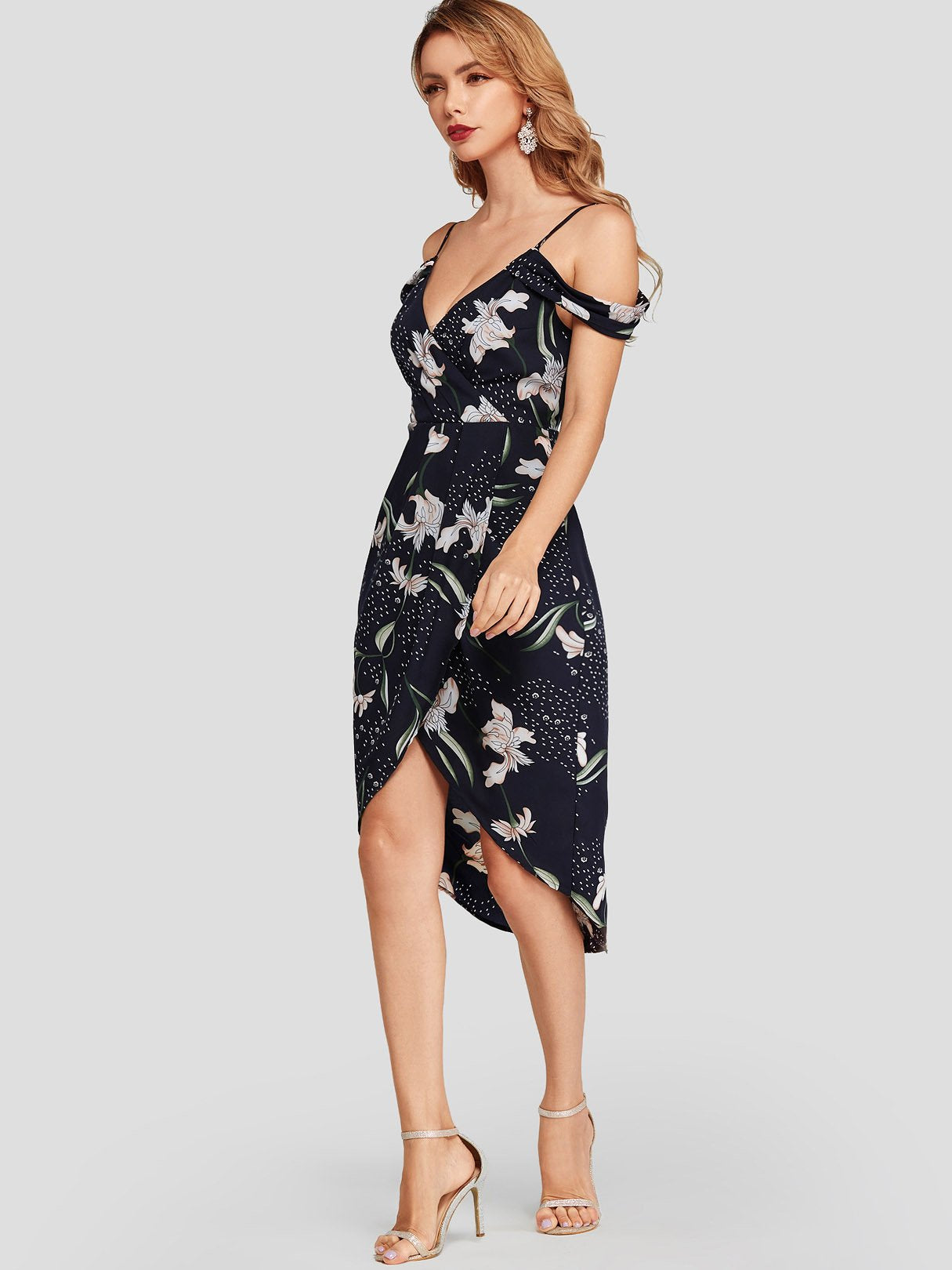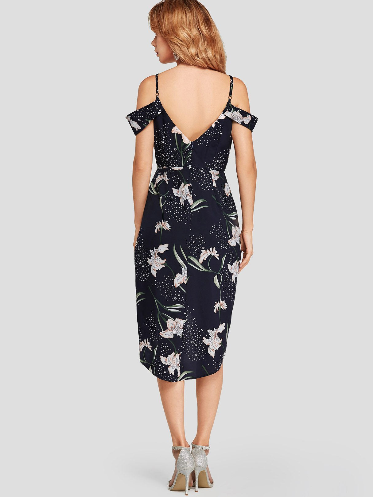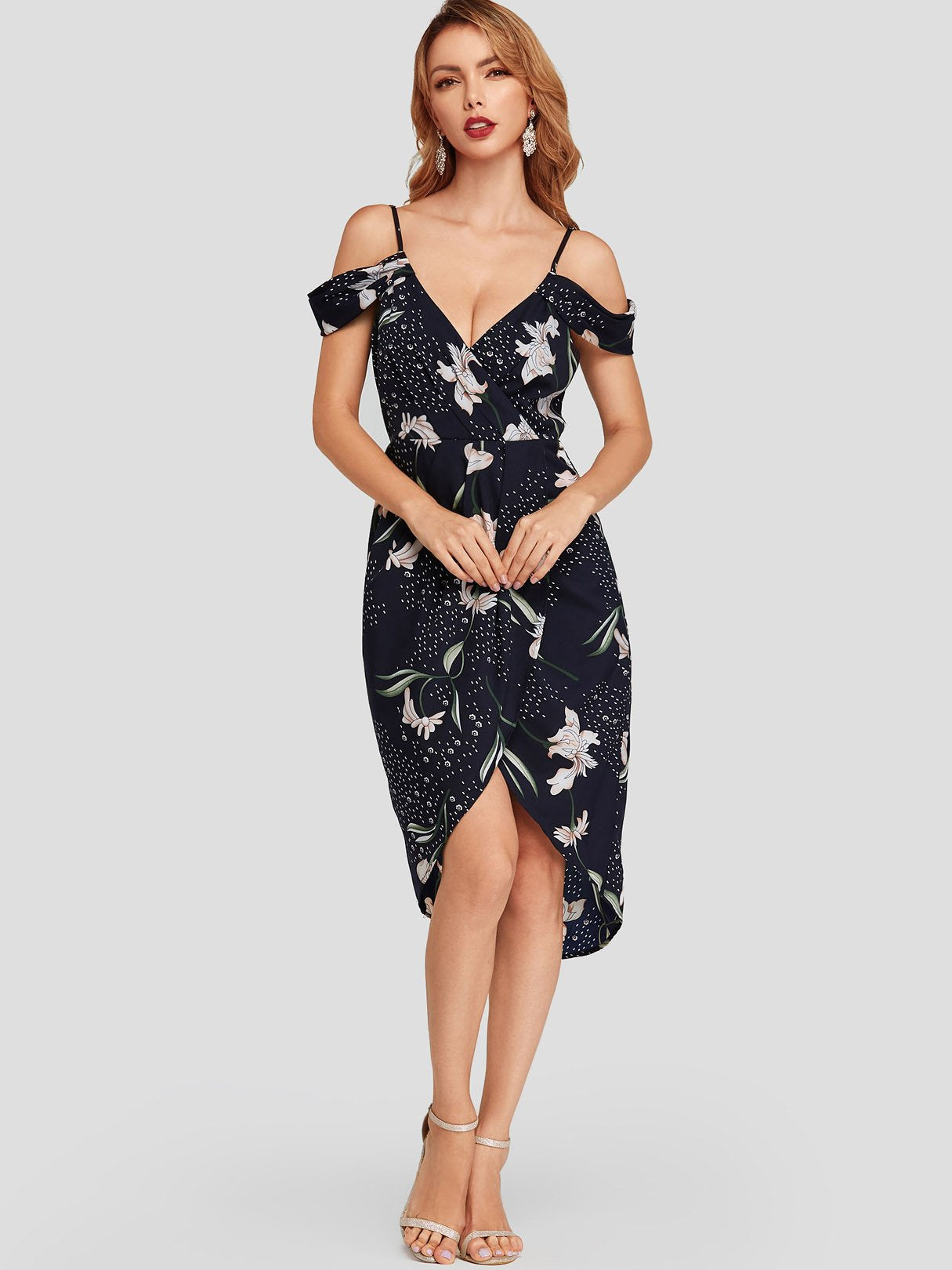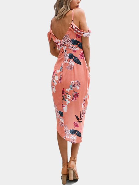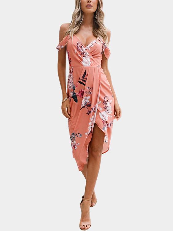 Cold Shoulder Deep V Neck Short Sleeve Floral Print Crossed Front Spaghetti Strap Slit Hem Dress
