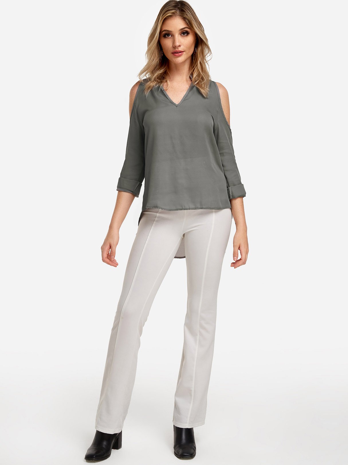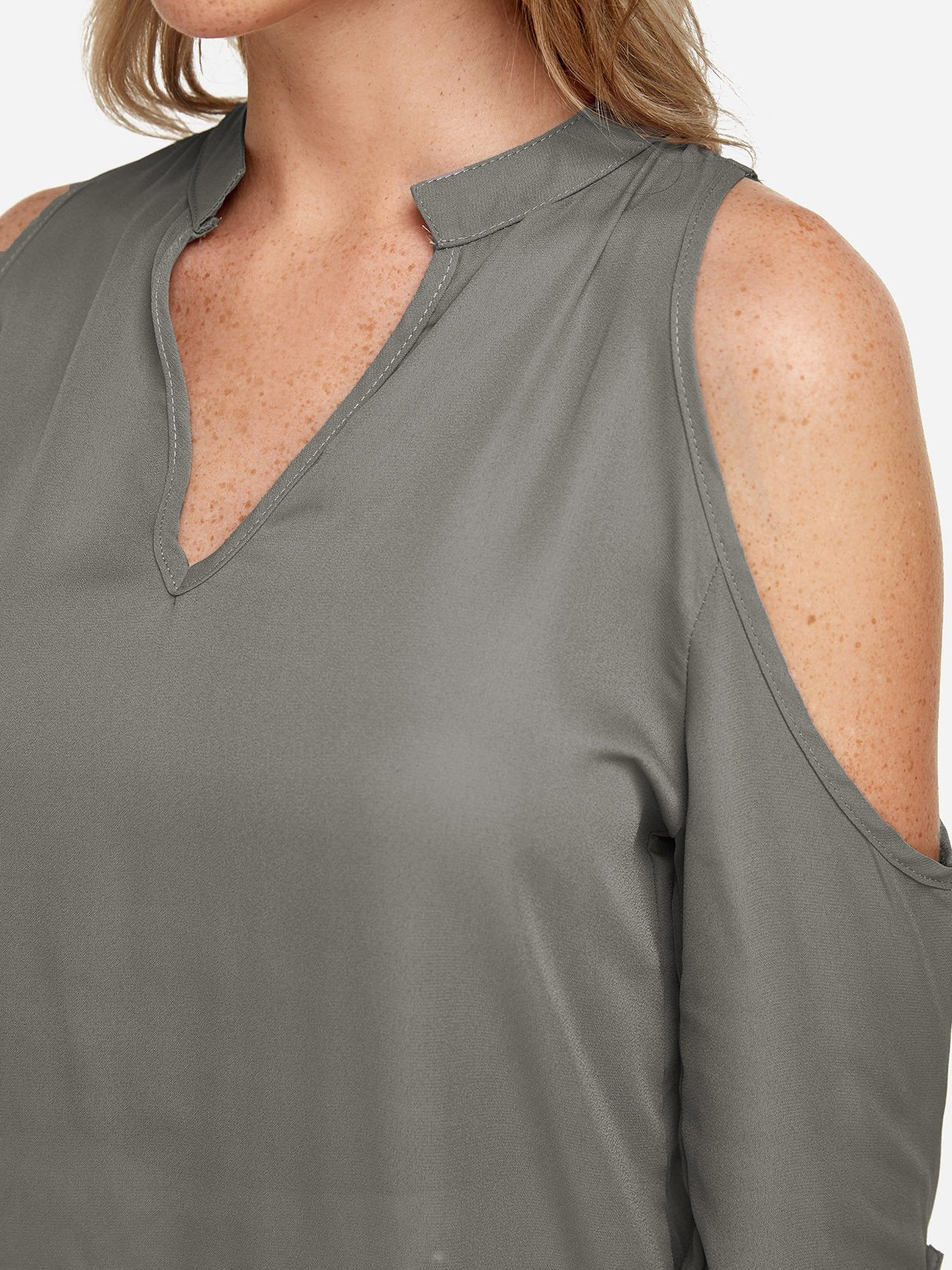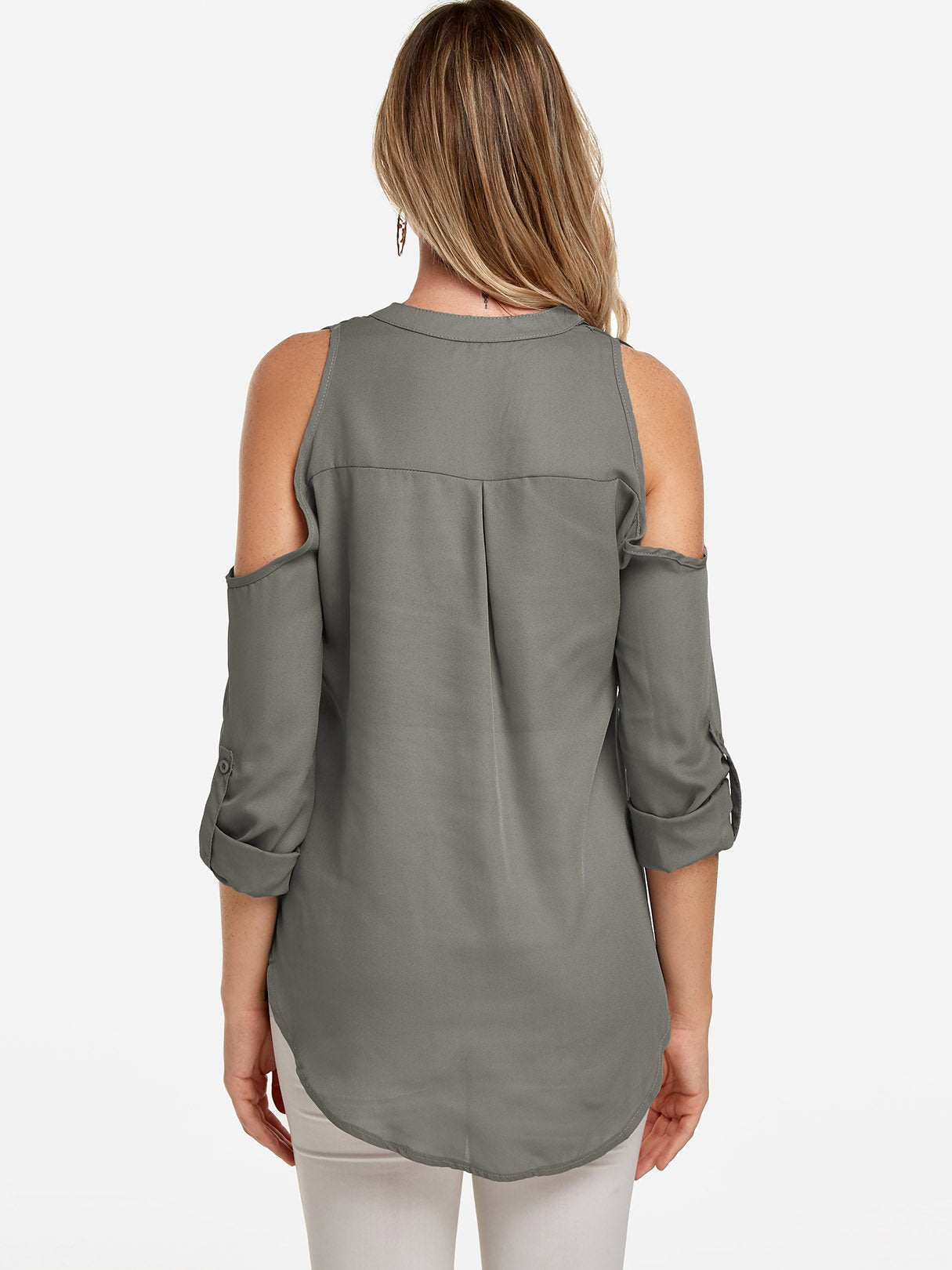 Cold Shoulder Plain Long Sleeve Irregular Hem Grey Blouses