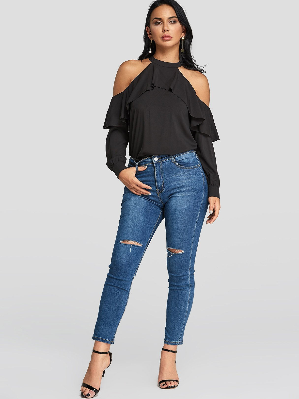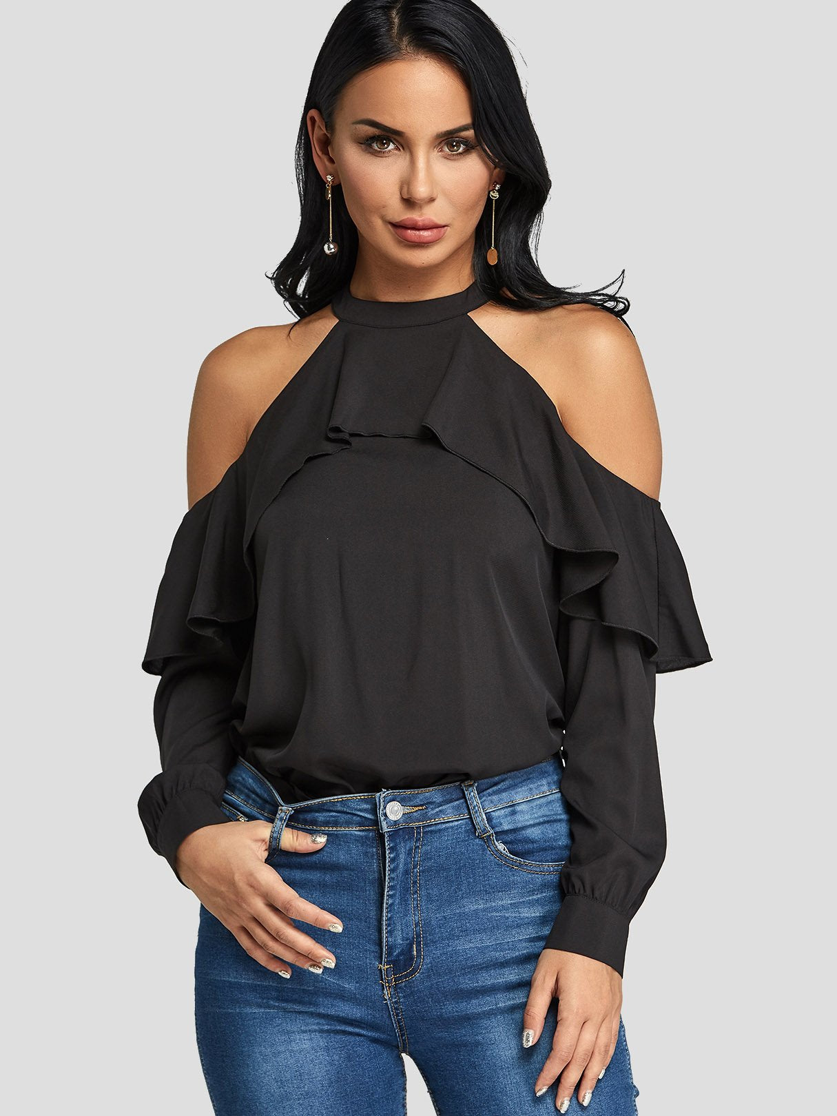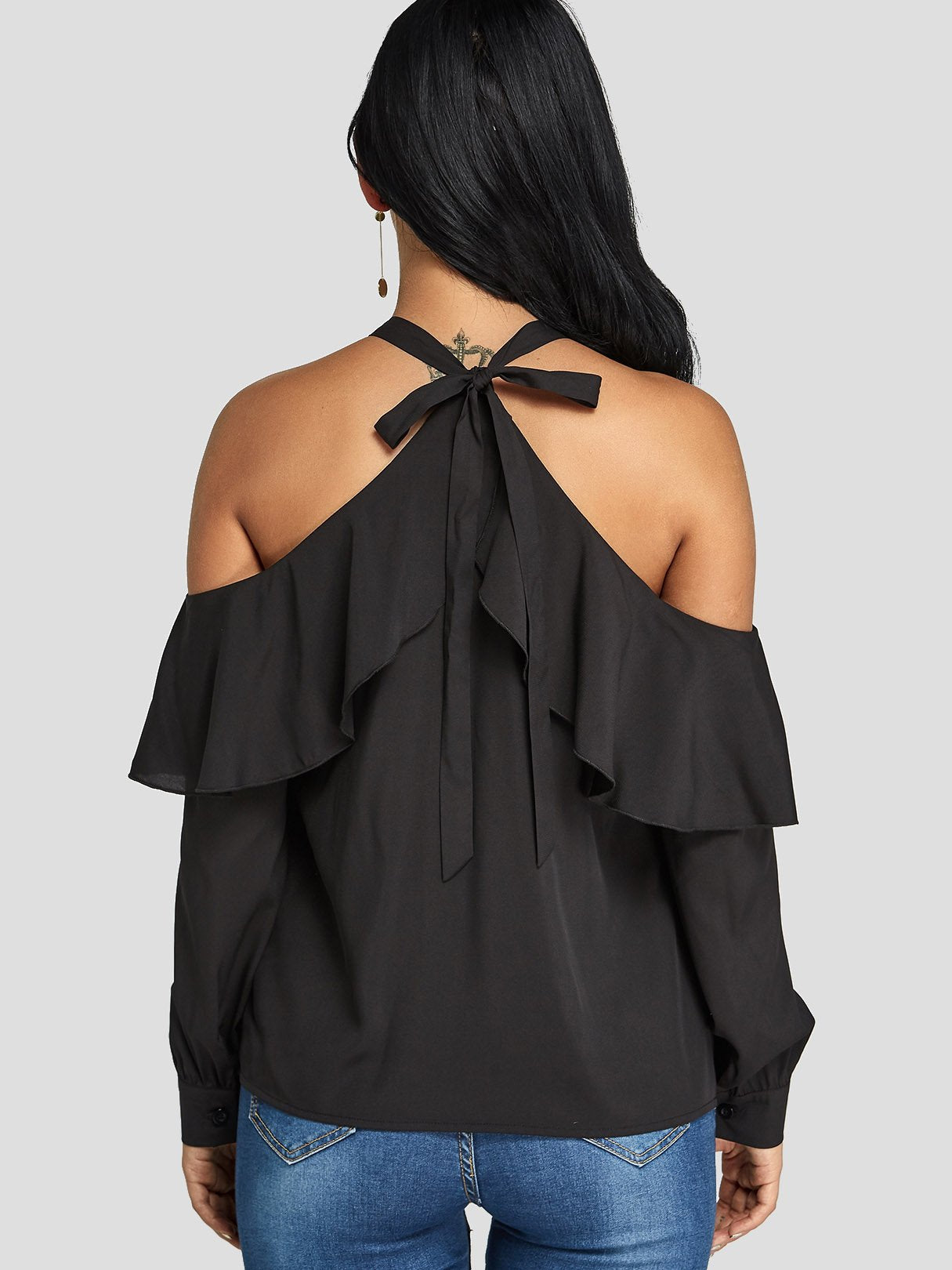 Cold Shoulder Tiered Long Sleeve Black Blouses