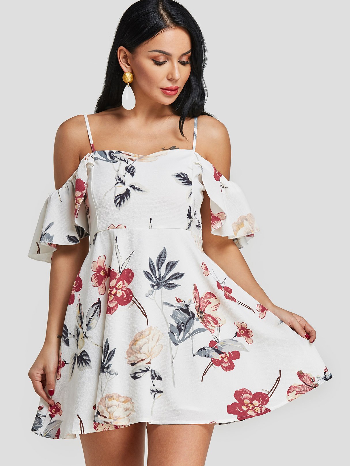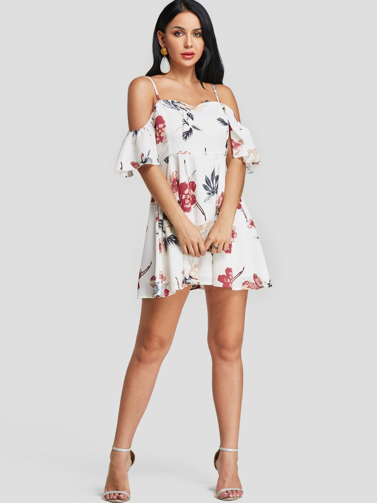 Cold Shoulder Zip Back Mini Dress - Floral / S is backordered and will ship as soon as it is back in stock.