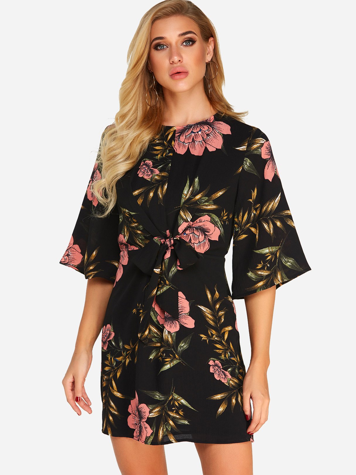 Material:PolyesterNeckline:Crew NeckSeason:AutumnSleeves:Half SleevesPattern:Floral PrintStyle:Vacation StyleDetail:Self-Tie DesignLength:MiniFit:Regular FitSleeves Type:Bell Sleeves