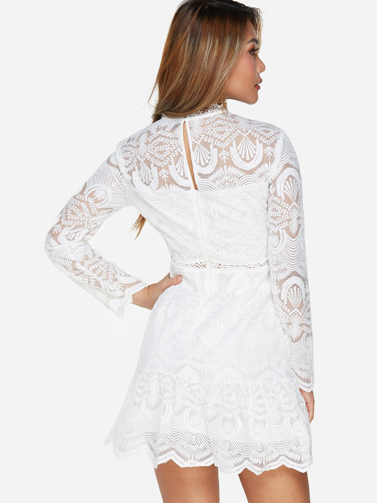 Crew Neck Lace Zip Back Hollow Long Sleeve White Sexy Dresses