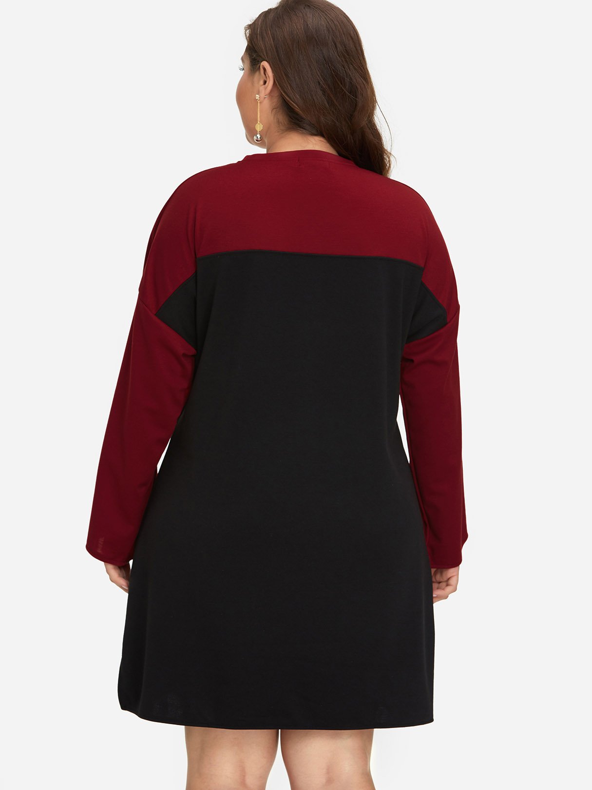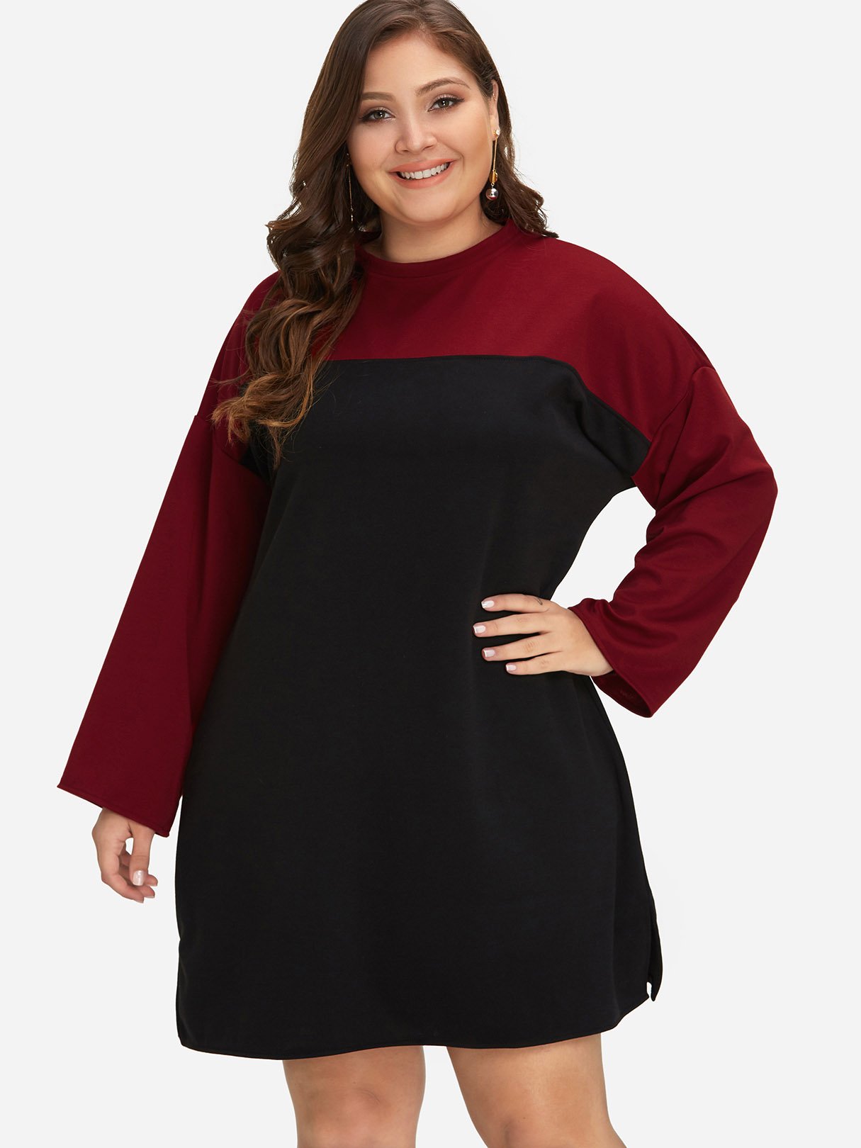 Crew Neck Plain Long Sleeve Slit Hem Plus Size Dress