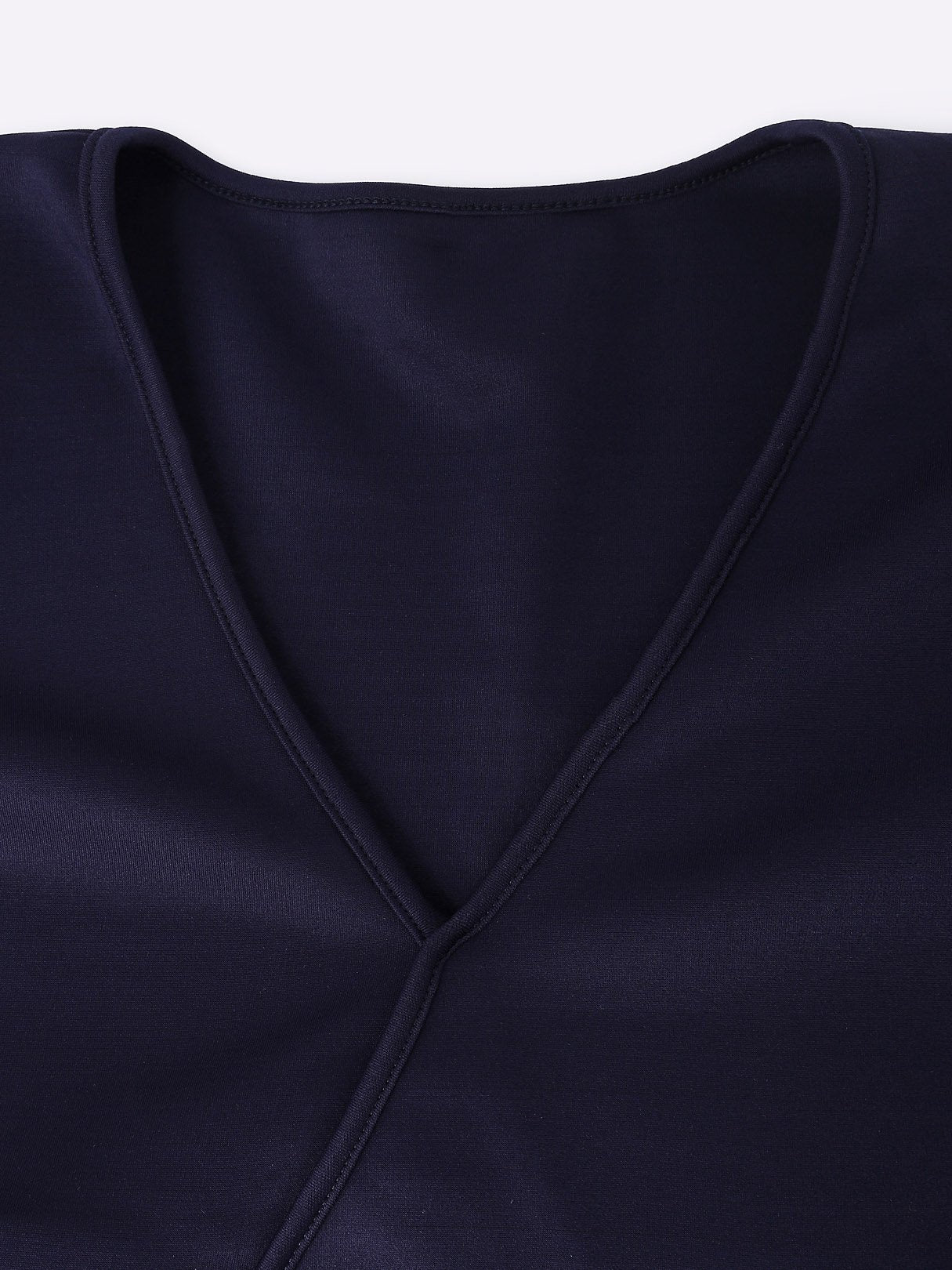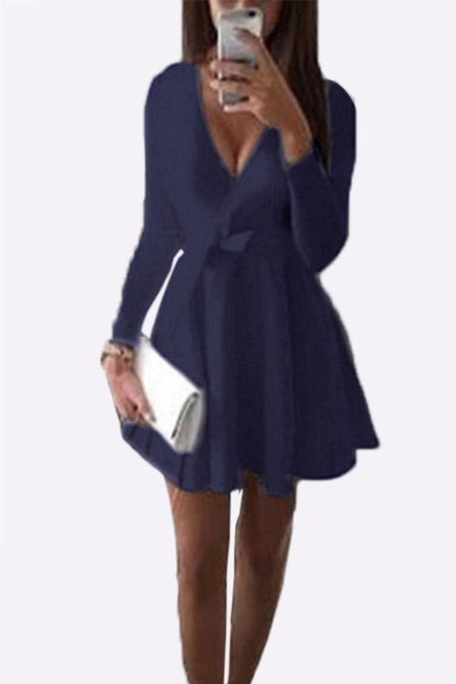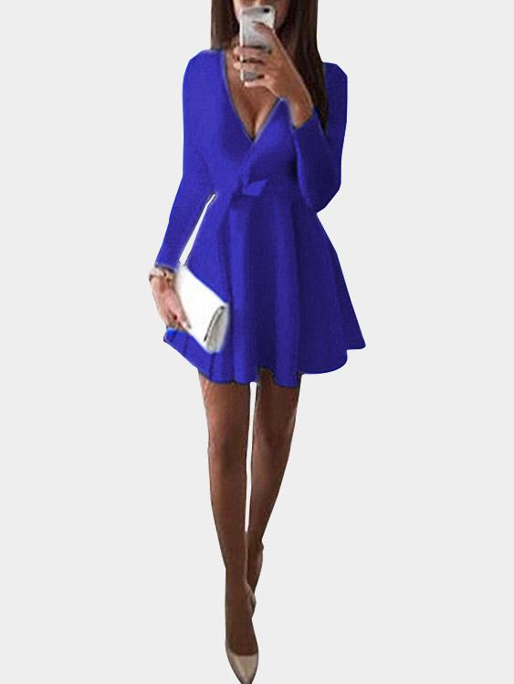Deep V-Neck Long Sleeve Plain Ruffle Hem Mini Dresses